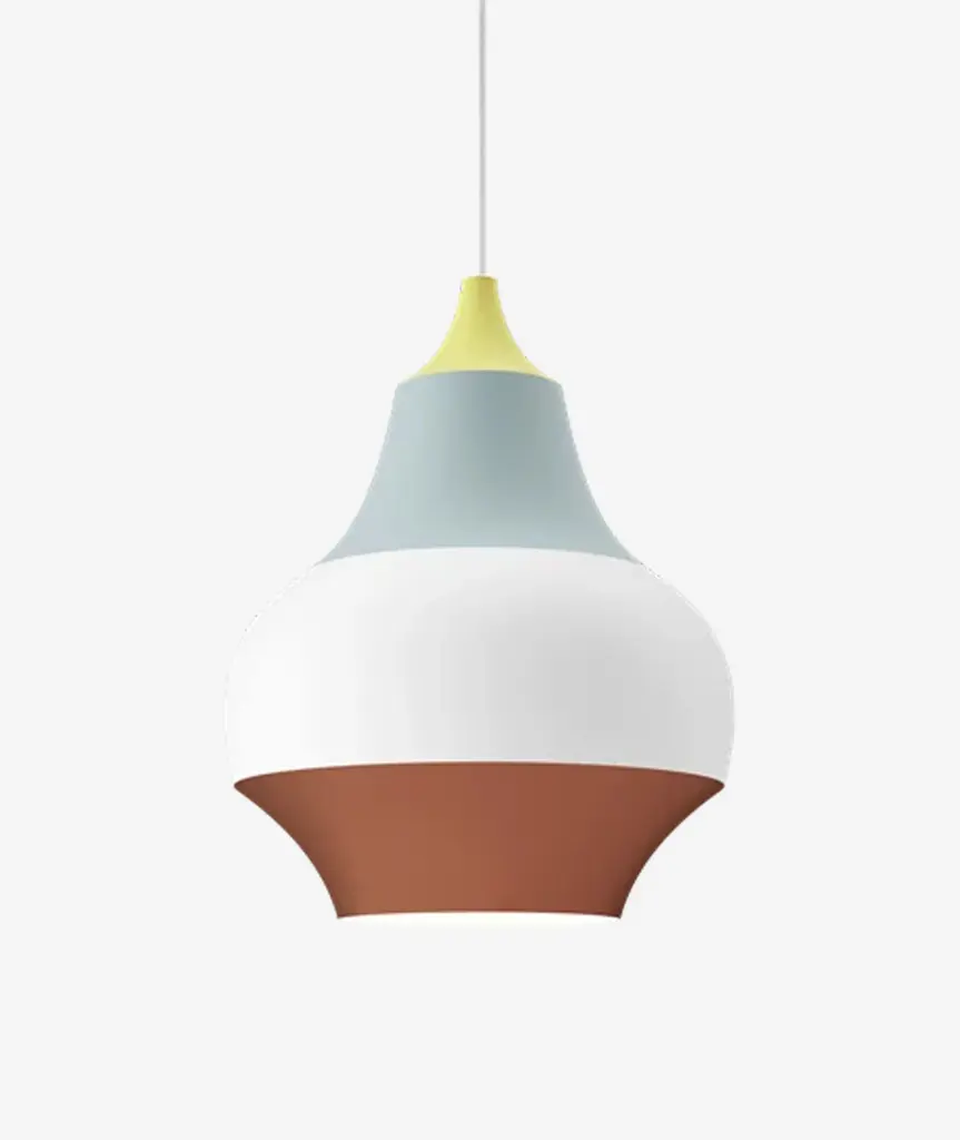 The Cirque Pendant is a play between colors and forms inspired by balloons, carrousels, colors and light. The idea to the color rankings comes from the experience of colors in circular motions where they often are perceived as continuous lines. The shape is inspired by the well-known onion shaped domes on several of the buildings in the TIVOLI garden. The fixture provides a downward glare-free soft light by means of the white lacquered inner reflector.