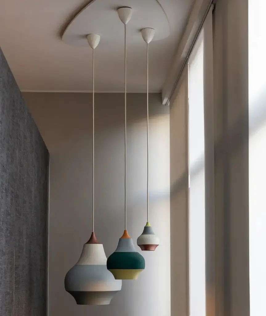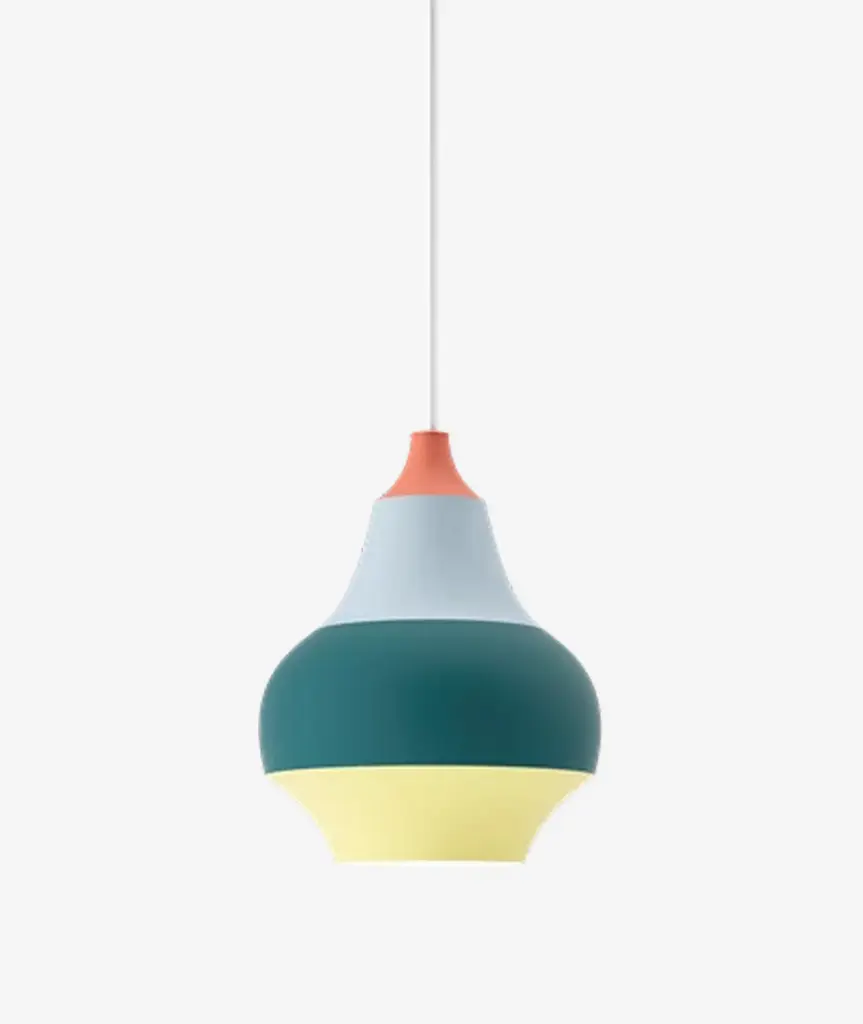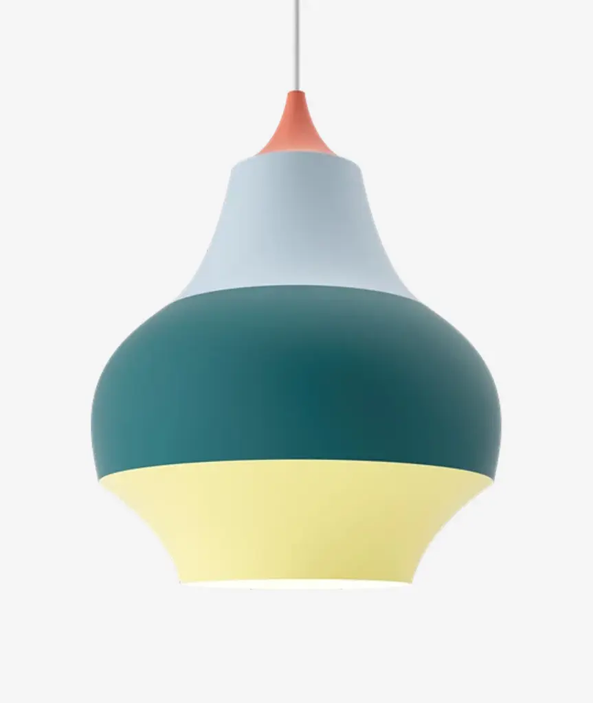 The Cirque Pendant is a play between colors and forms inspired by balloons, carrousels, colors and light. The idea to the color rankings comes from the experience of colors in circular motions where they often are perceived as continuous lines. The shape is inspired by the well-known onion shaped domes on several of the buildings in the TIVOLI garden. The fixture provides a downward glare-free soft light by means of the white lacquered inner reflector.