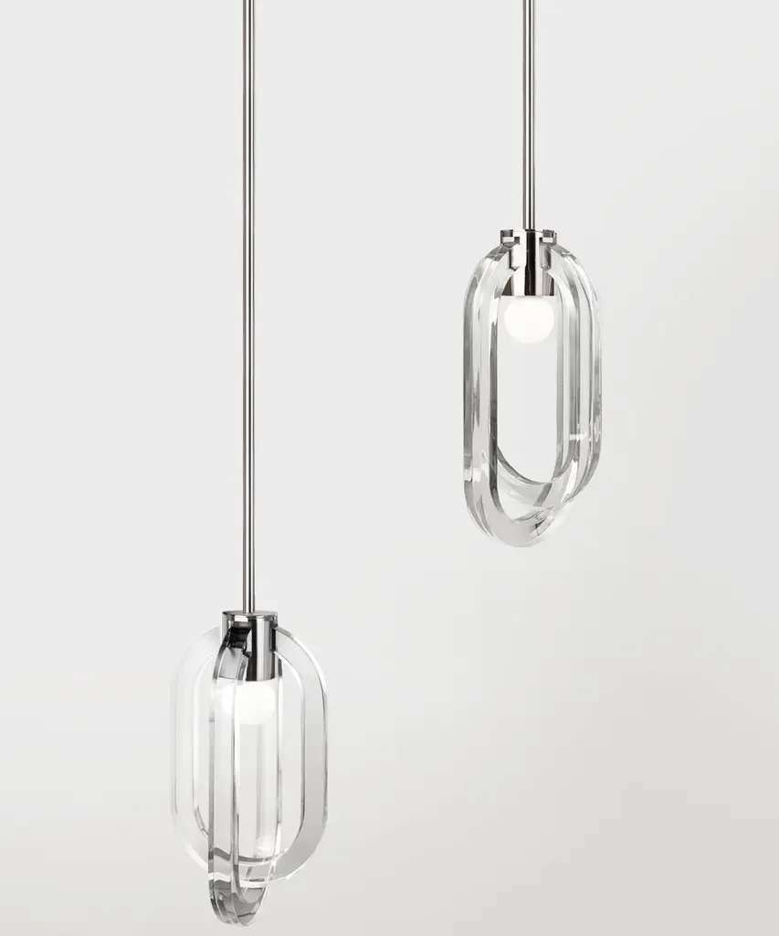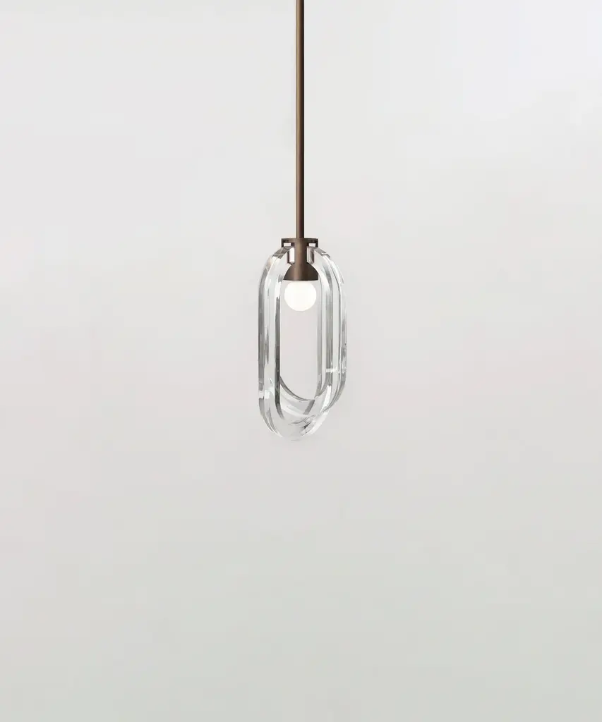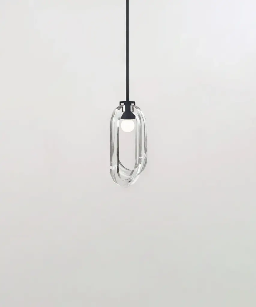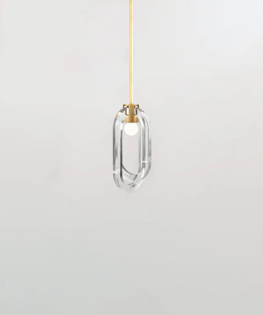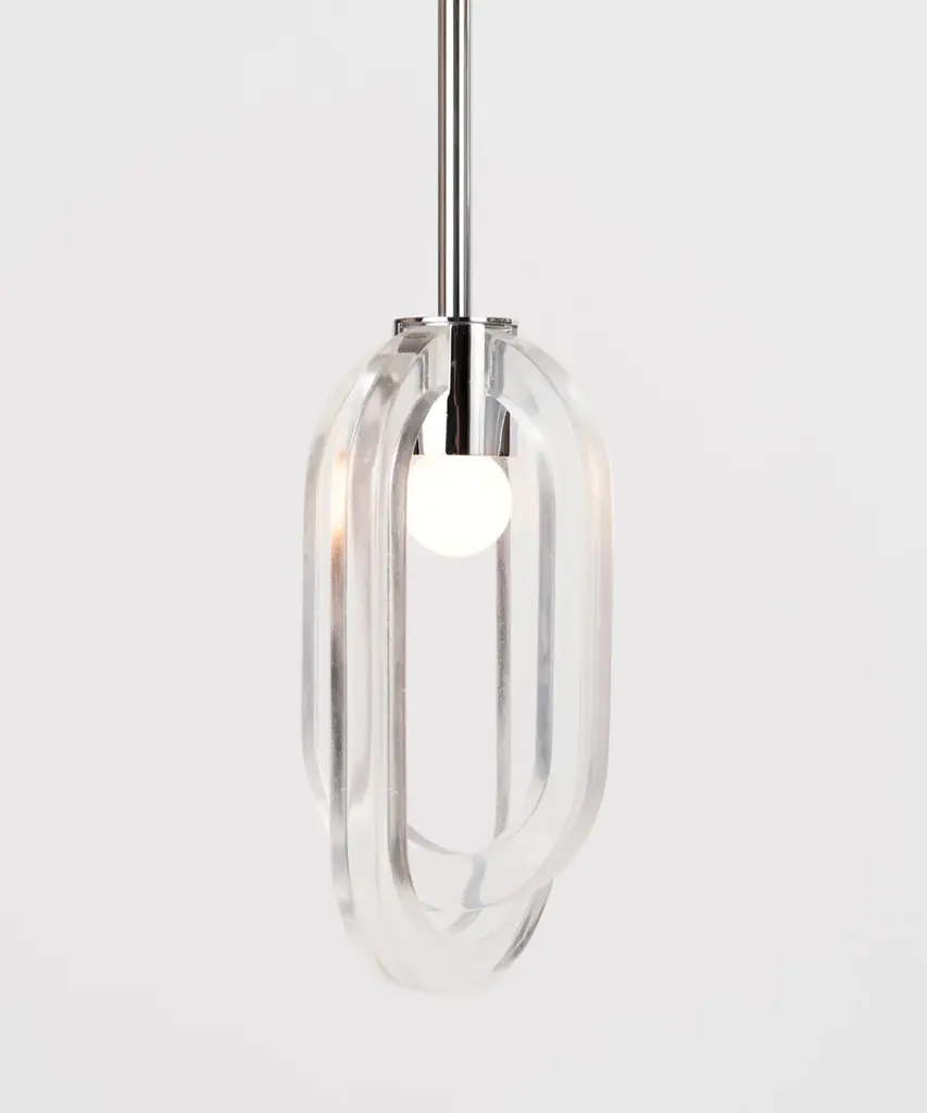 Cast-resin rings, one looping under the next create a spiraling, illuminated choreography. The resin rings are designed to evoke bubble-filled glass while offering the strength and durability of resin. The inside facing of each ring is fogged, allowing the light to carry through the entirety of the ring's loop. The fixture is available in a variety of metal finishes. Please note, that it assumes a 25" rod length, however, it is easily customizable upon request (please email us at help@trnk-nyc.com with your specifications). Each piece is designed and hand-produced by Coil + Drift, a lauded New York's Catskill Mountains-based design studio known for its vividly three-dimensional and material-forward collections.