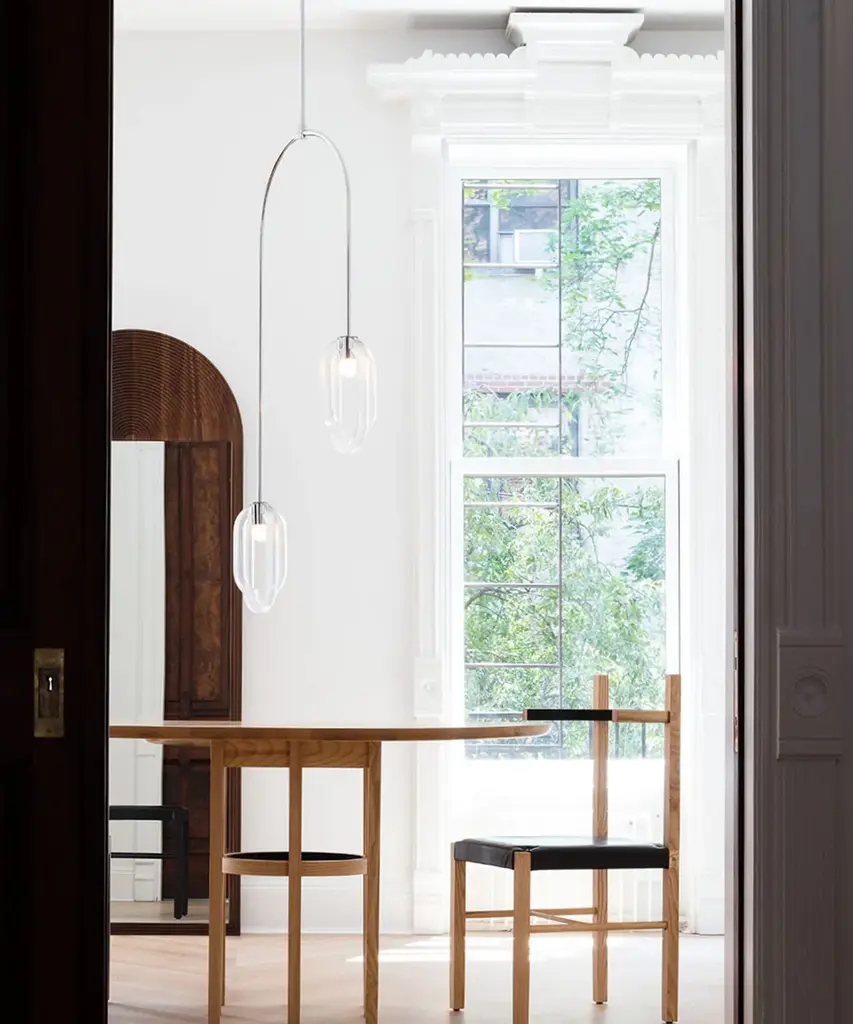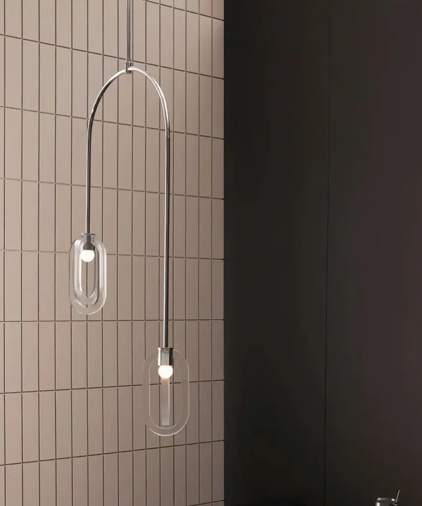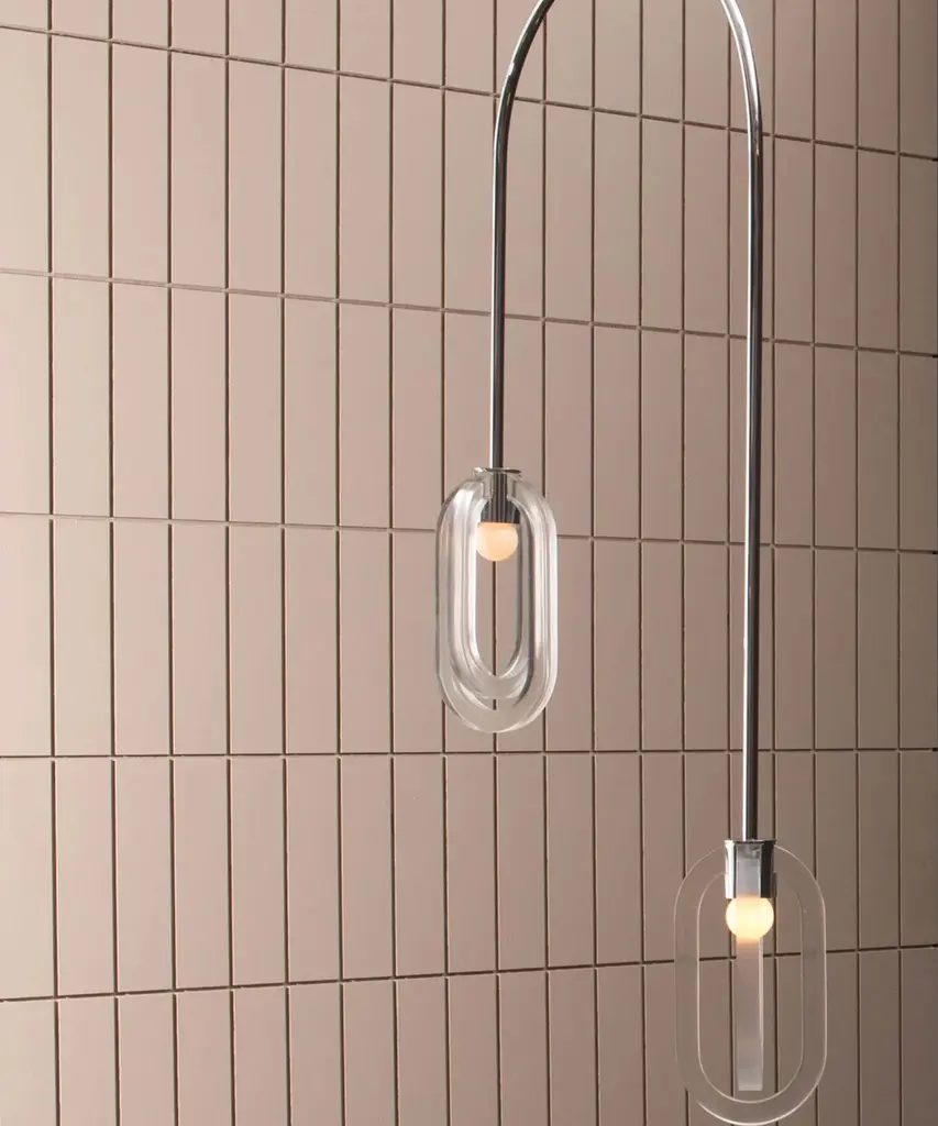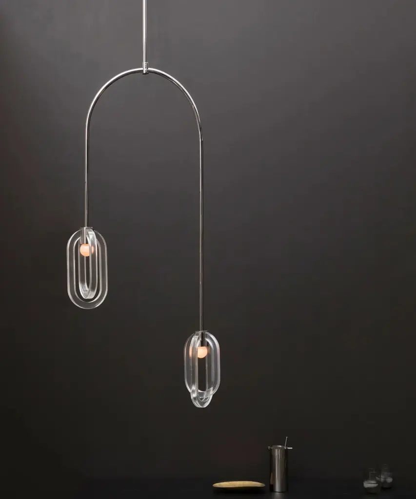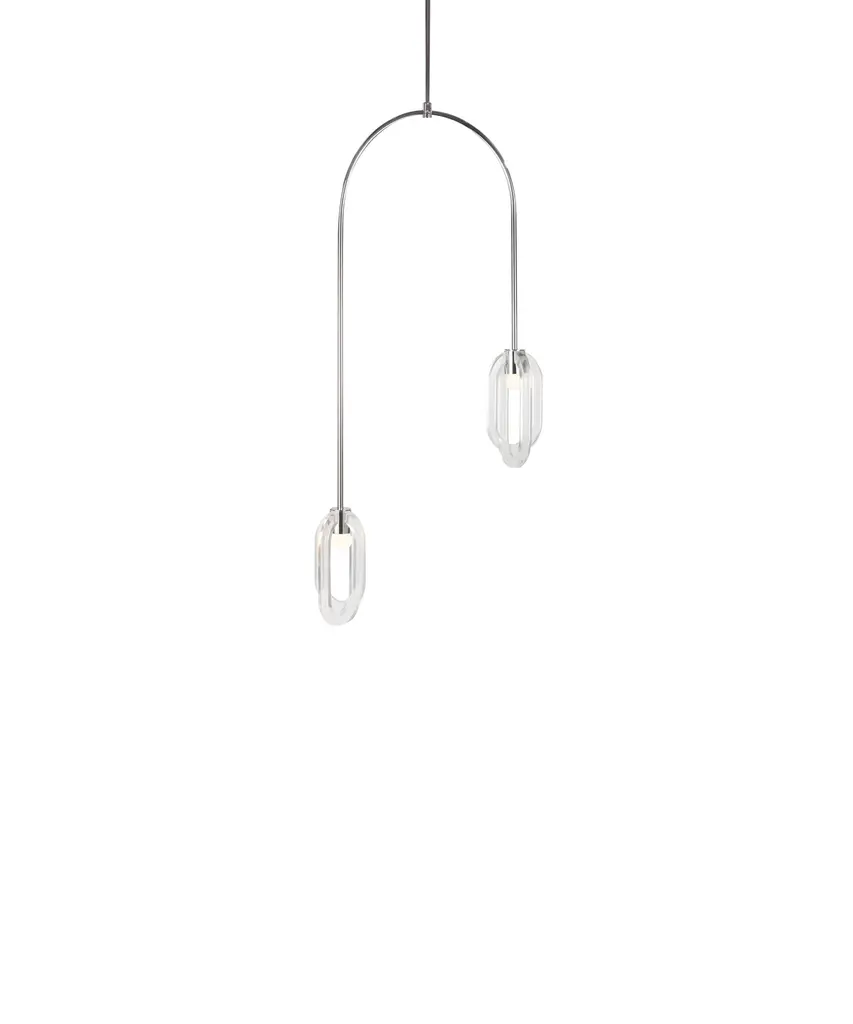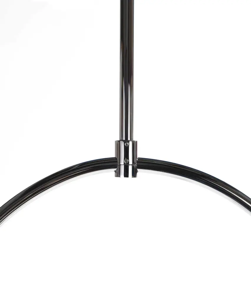 Cast-resin rings, one looping under the next create a spiraling, illuminated choreography. The resin rings are designed to evoke bubble-filled glass while offering the strength and durability of resin. The inside facing of each ring is fogged, allowing the light to carry through the entirety of the ring's loop. The fixture is available in a variety of metal finishes. Please note, that it assumes a 25" rod length, however, it is easily customizable upon request (please email us at help@trnk-nyc.com with your specifications). Each piece is designed and hand-produced by Coil + Drift, a lauded New York's Catskill Mountains-based design studio known for its vividly three-dimensional and material-forward collections.