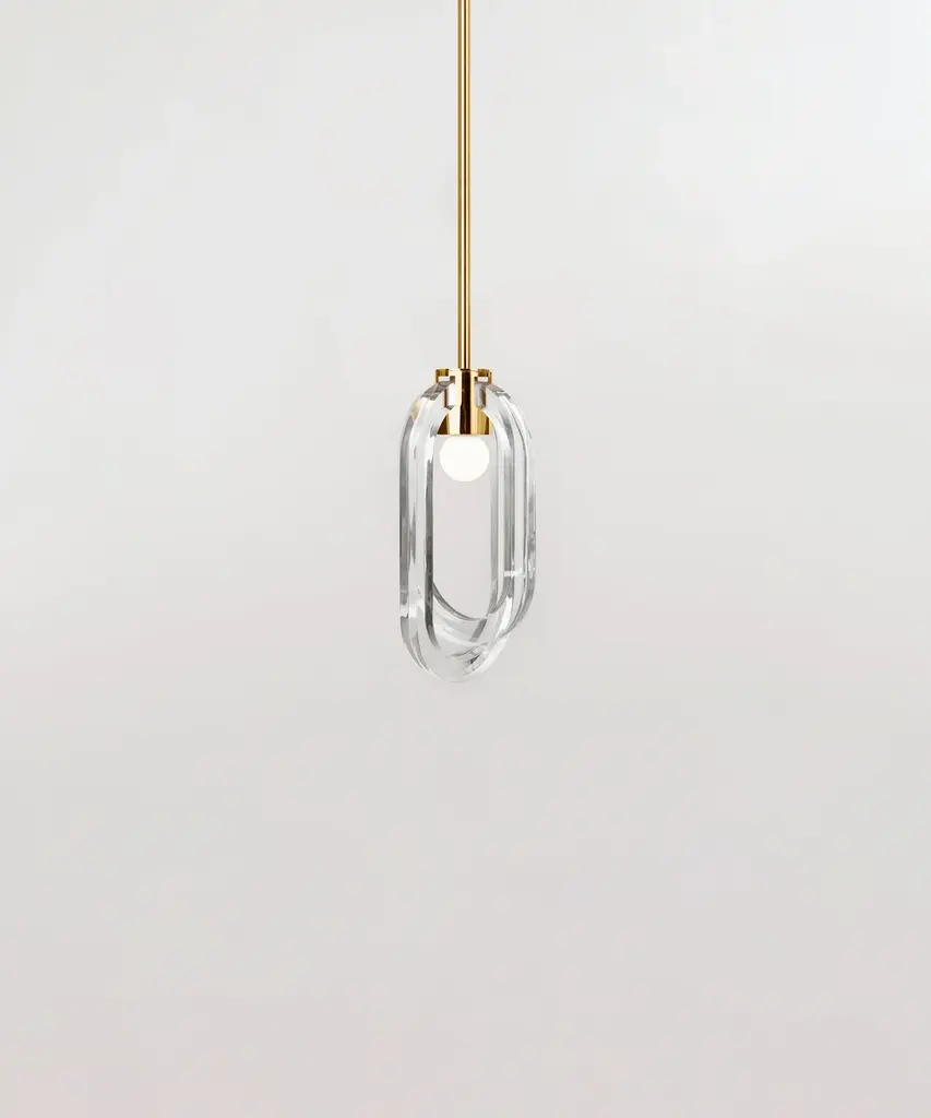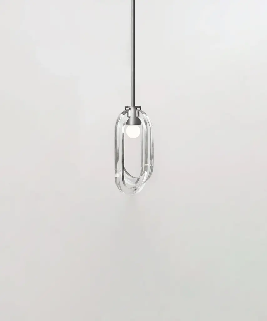Cast-resin rings, one looping under the next create a spiraling, illuminated choreography. The resin rings are designed to evoke bubble-filled glass while offering the strength and durability of resin. The inside facing of each ring is fogged, allowing the light to carry through the entirety of the ring's loop. The fixture is available in a variety of metal finishes. Please note, that it assumes a 25" rod length, however, it is easily customizable upon request (please email us at help@trnk-nyc.com with your specifications). Each piece is designed and hand-produced by Coil + Drift, a lauded New York's Catskill Mountains-based design studio known for its vividly three-dimensional and material-forward collections.