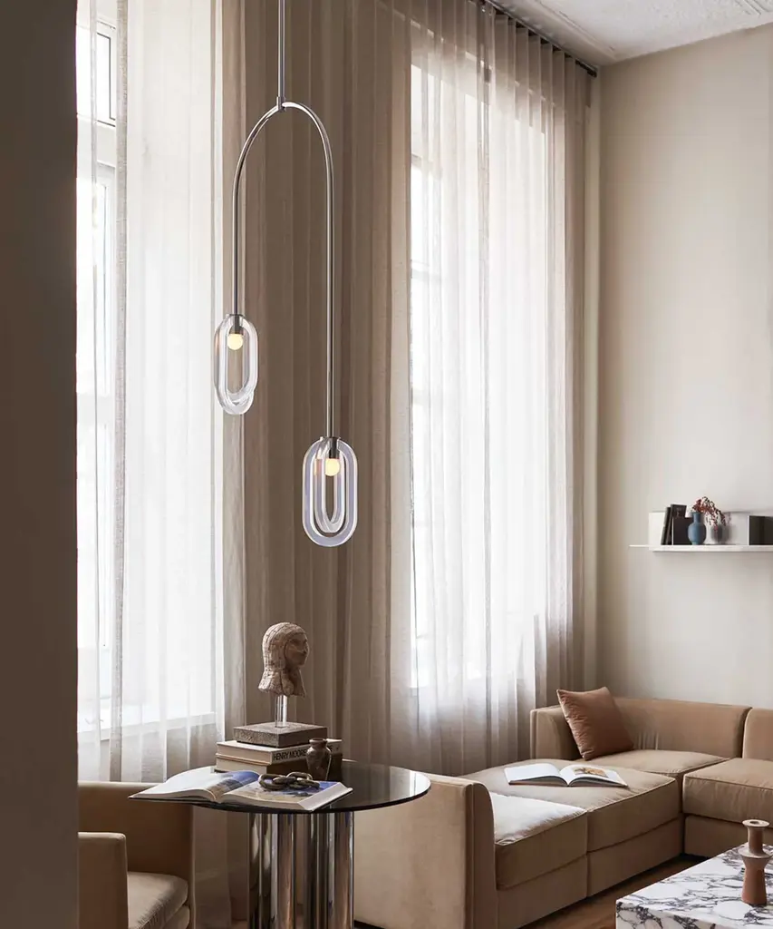 Cast-resin rings, one looping under the next create a spiraling, illuminated choreography. The resin rings are designed to evoke bubble-filled glass while offering the strength and durability of resin. The inside facing of each ring is fogged, allowing the light to carry through the entirety of the ring's loop. The fixture is available in a variety of metal finishes. Please note, that it assumes a 25" rod length, however, it is easily customizable upon request (please email us at help@trnk-nyc.com with your specifications). Each piece is designed and hand-produced by Coil + Drift, a lauded New York's Catskill Mountains-based design studio known for its vividly three-dimensional and material-forward collections.