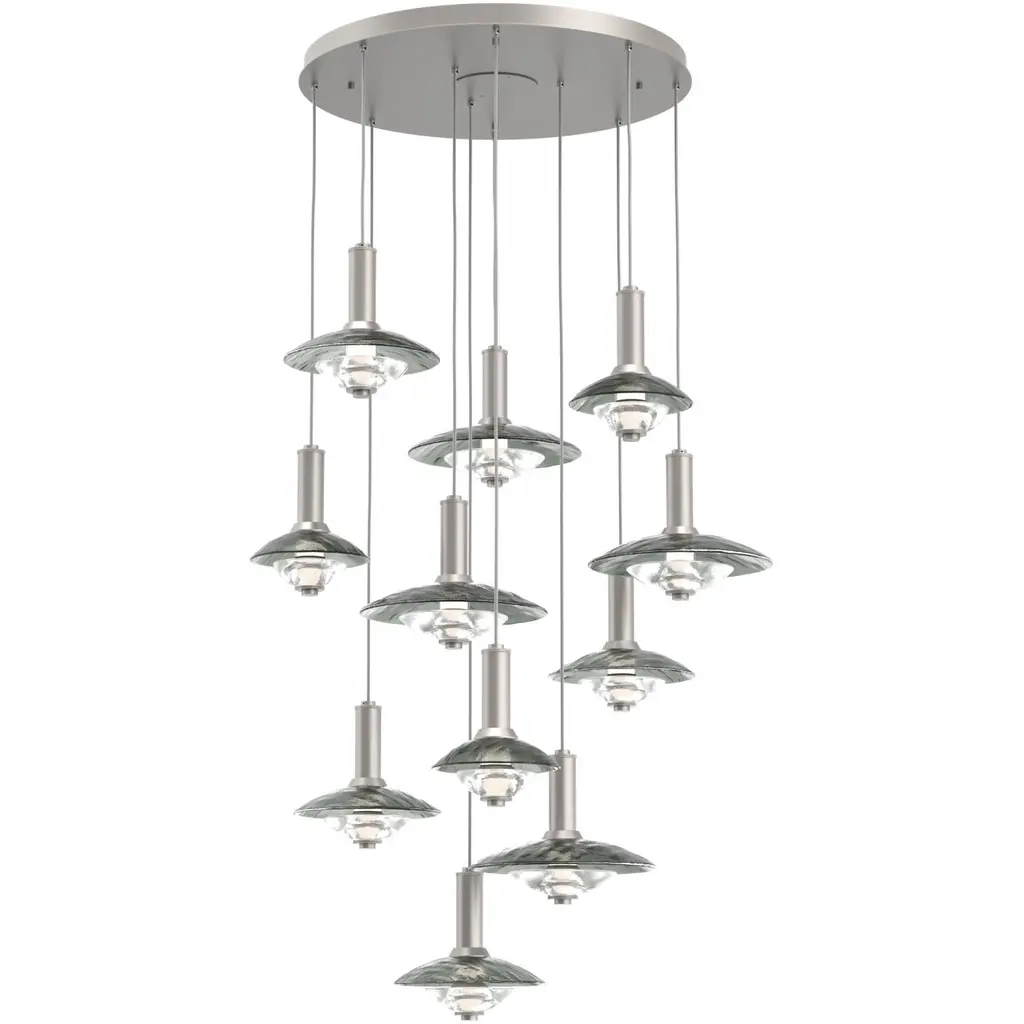 A unique fusion of kiln-fused glass, cast crystal glass and precision-crafted metal lends surprising drama to this Cirrus round multi-pendant chandelier style. Available in a choice of Smoke Granite or Clear Granite textured glass and several finishes.