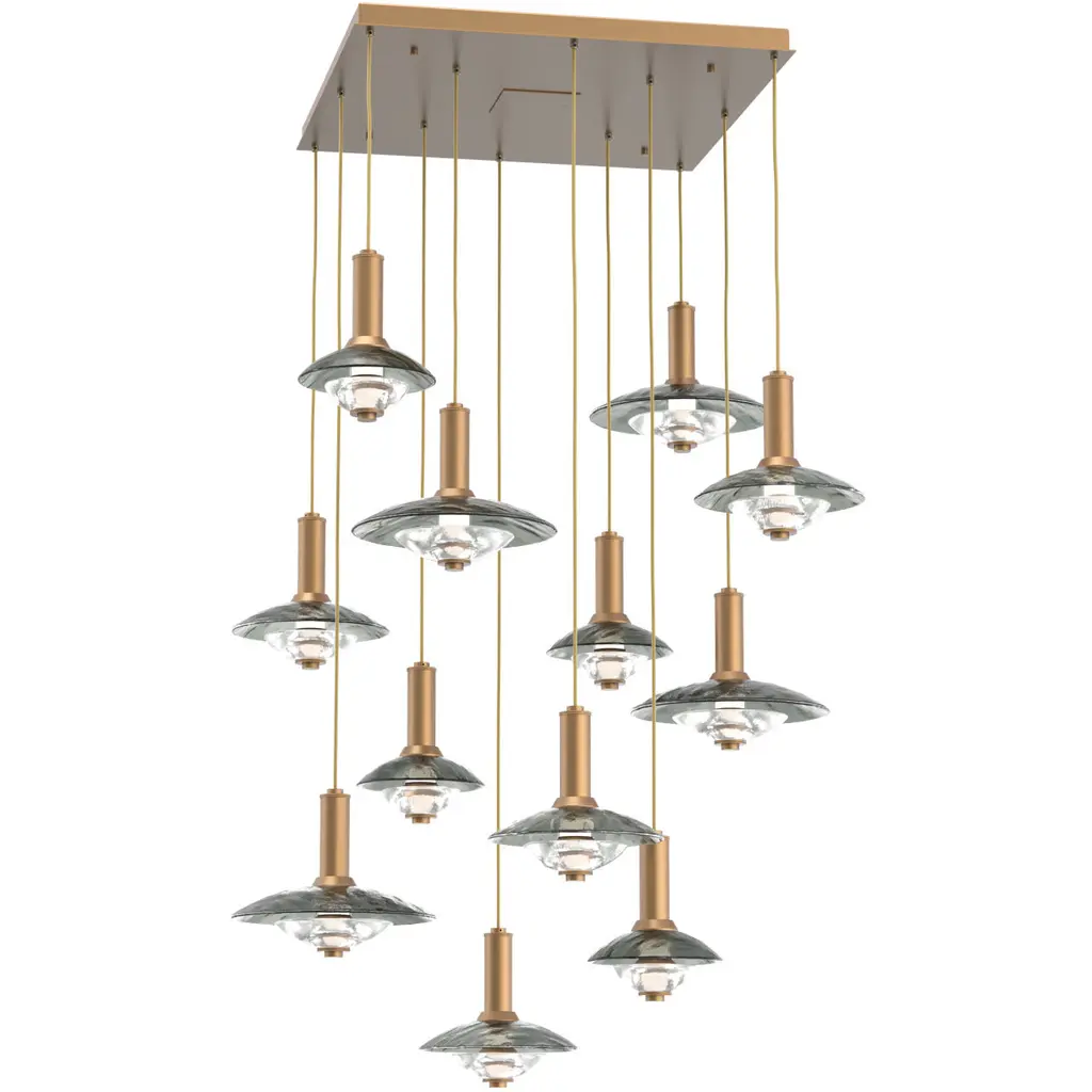 A unique fusion of kiln-fused glass, cast crystal glass and precision-crafted metal lends surprising drama to this Cirrus square multi-pendant chandelier style. Available in a choice of Smoke Granite or Clear Granite textured glass and several finishes.