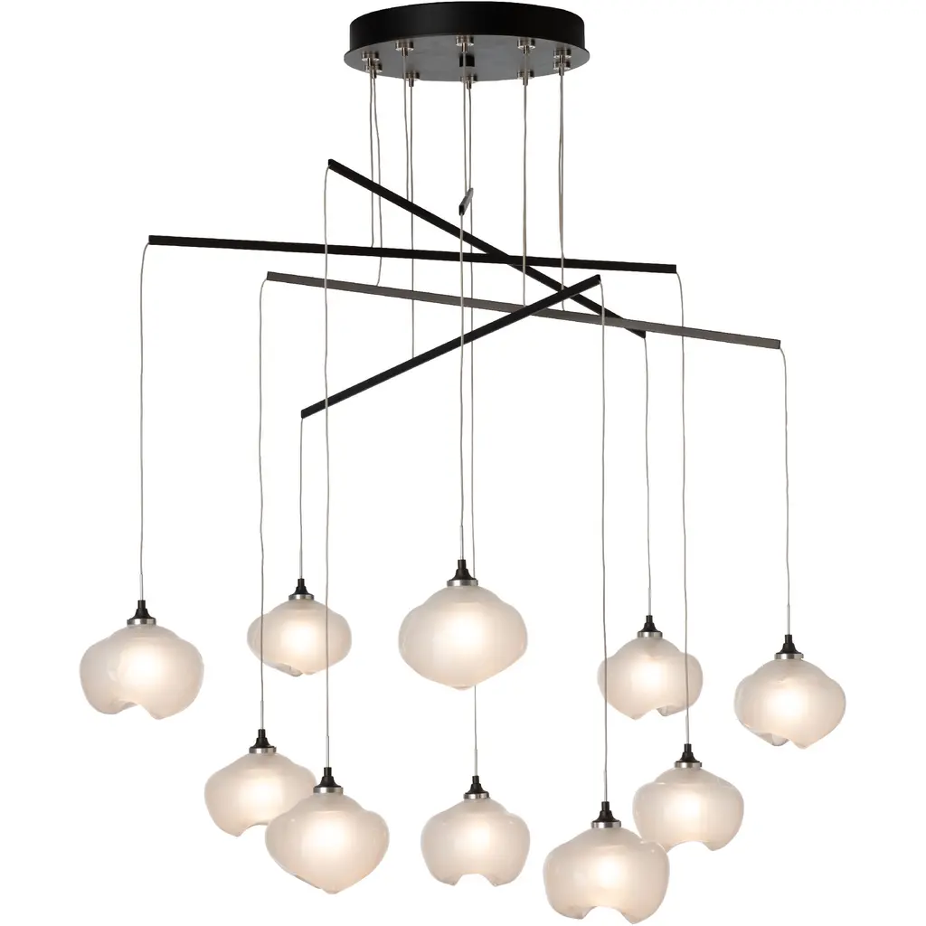 A unique fusion of kiln-fused glass, cast crystal glass and precision-crafted metal lends surprising drama to this Cirrus round multi-pendant chandelier style. Available in a choice of Smoke Granite or Clear Granite textured glass and several finishes.