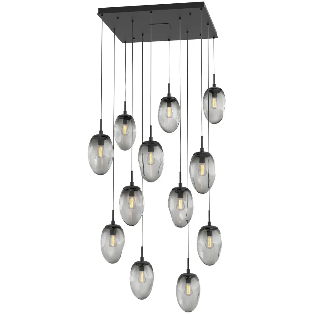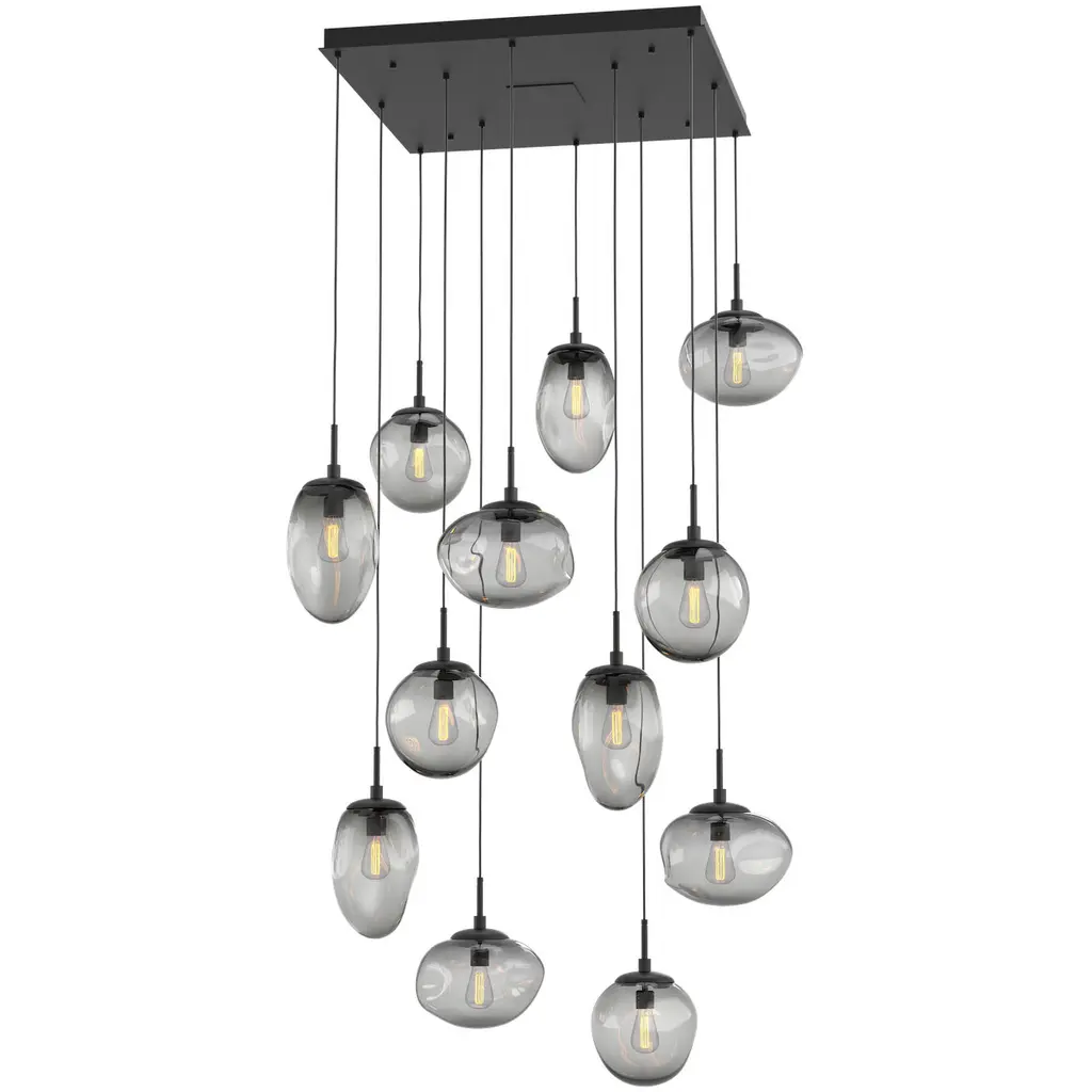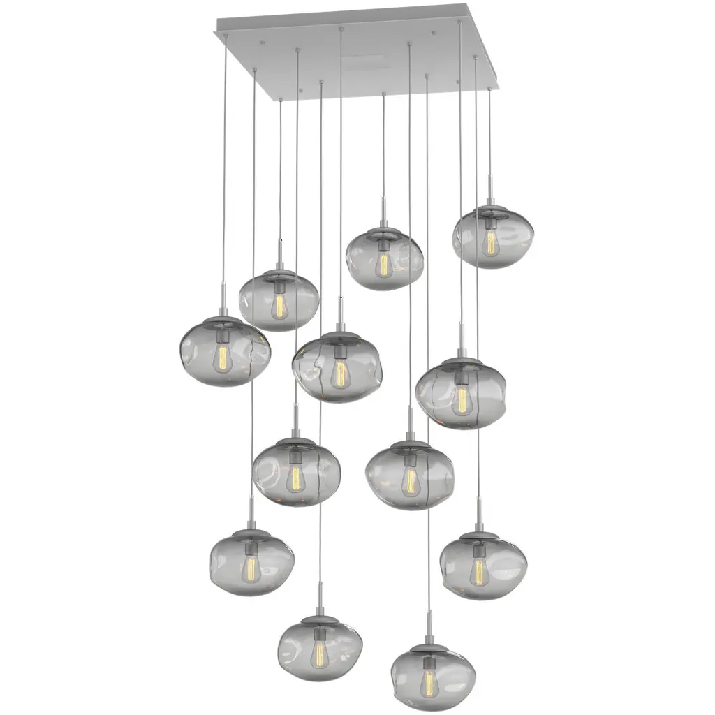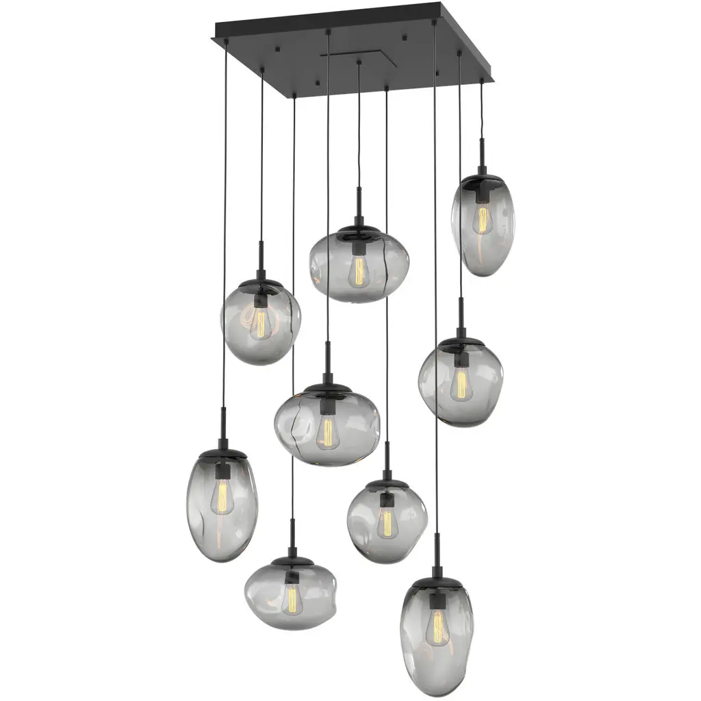 A unique fusion of kiln-fused glass, cast crystal glass and precision-crafted metal lends surprising drama to this Cirrus square multi-pendant chandelier style. Available in a choice of Smoke Granite or Clear Granite textured glass and several finishes.