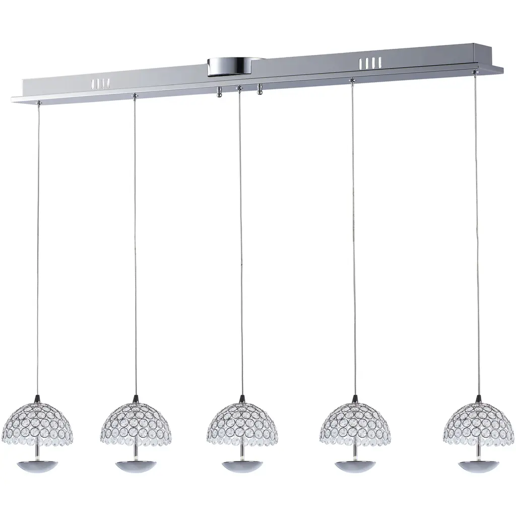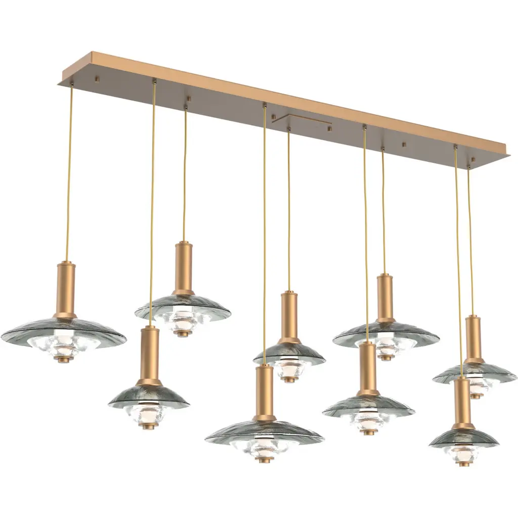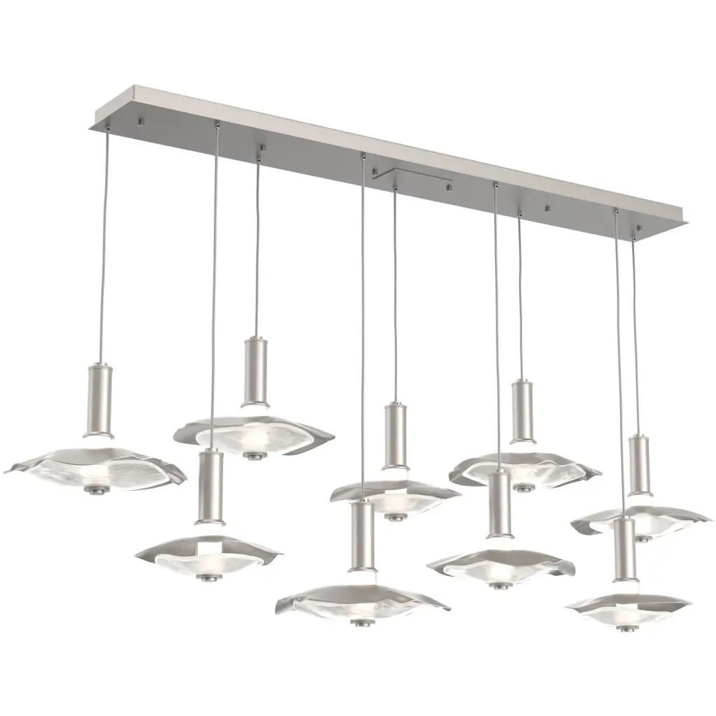 A unique fusion of kiln-fused glass, cast crystal glass and precision-crafted metal lends surprising drama to this Cirrus linear multi-pendant chandelier style. Available in a choice of Smoke Granite or Clear Granite textured glass and several finishes.