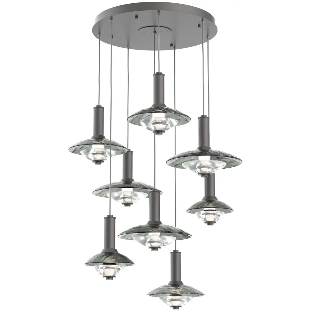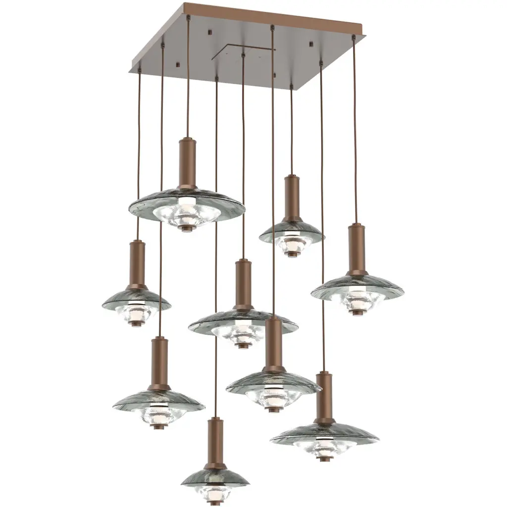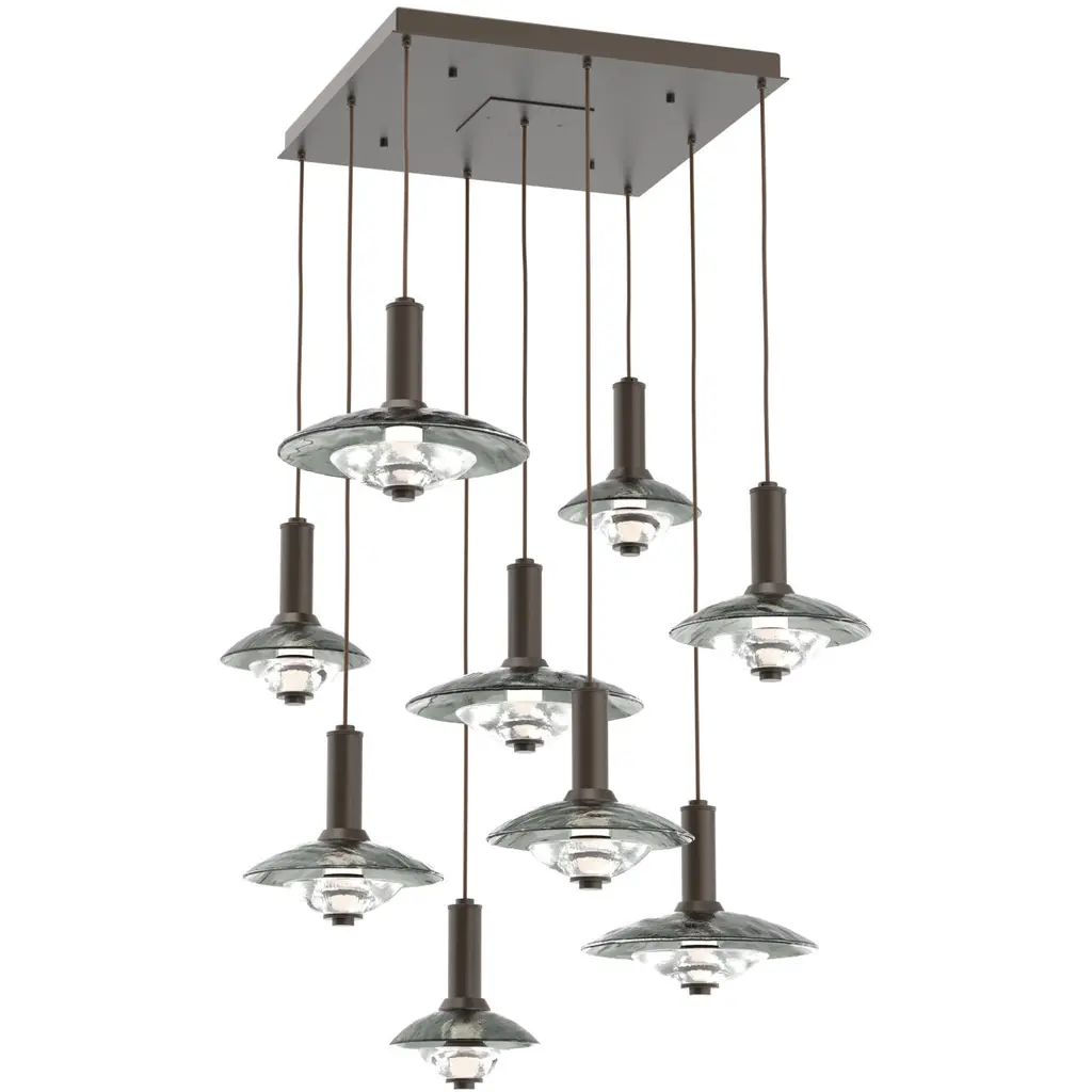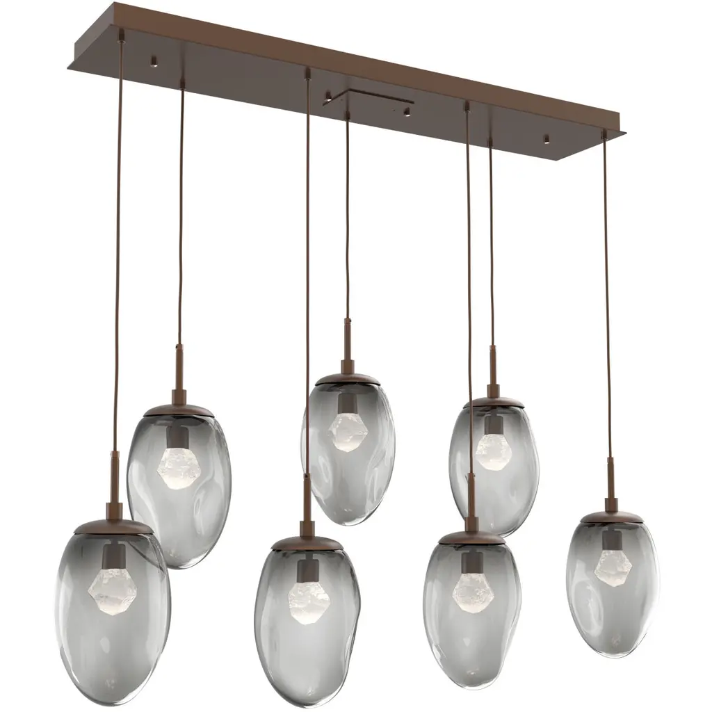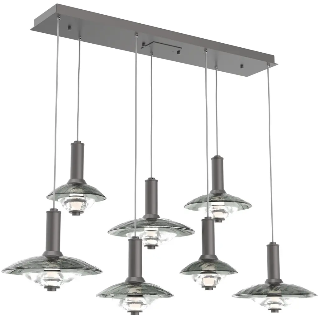 A unique fusion of kiln-fused glass, cast crystal glass and precision-crafted metal lends surprising drama to this Cirrus linear multi-pendant chandelier style. Available in a choice of Smoke Granite or Clear Granite textured glass and several finishes.