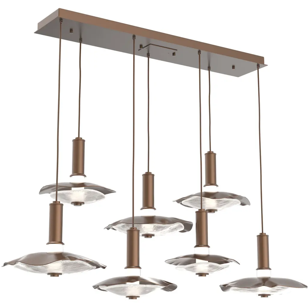A unique fusion of kiln-fused glass, cast crystal glass and precision-crafted metal lends surprising drama to this Cirrus linear multi-pendant chandelier style. Available in a choice of Smoke Granite or Clear Granite textured glass and several finishes.