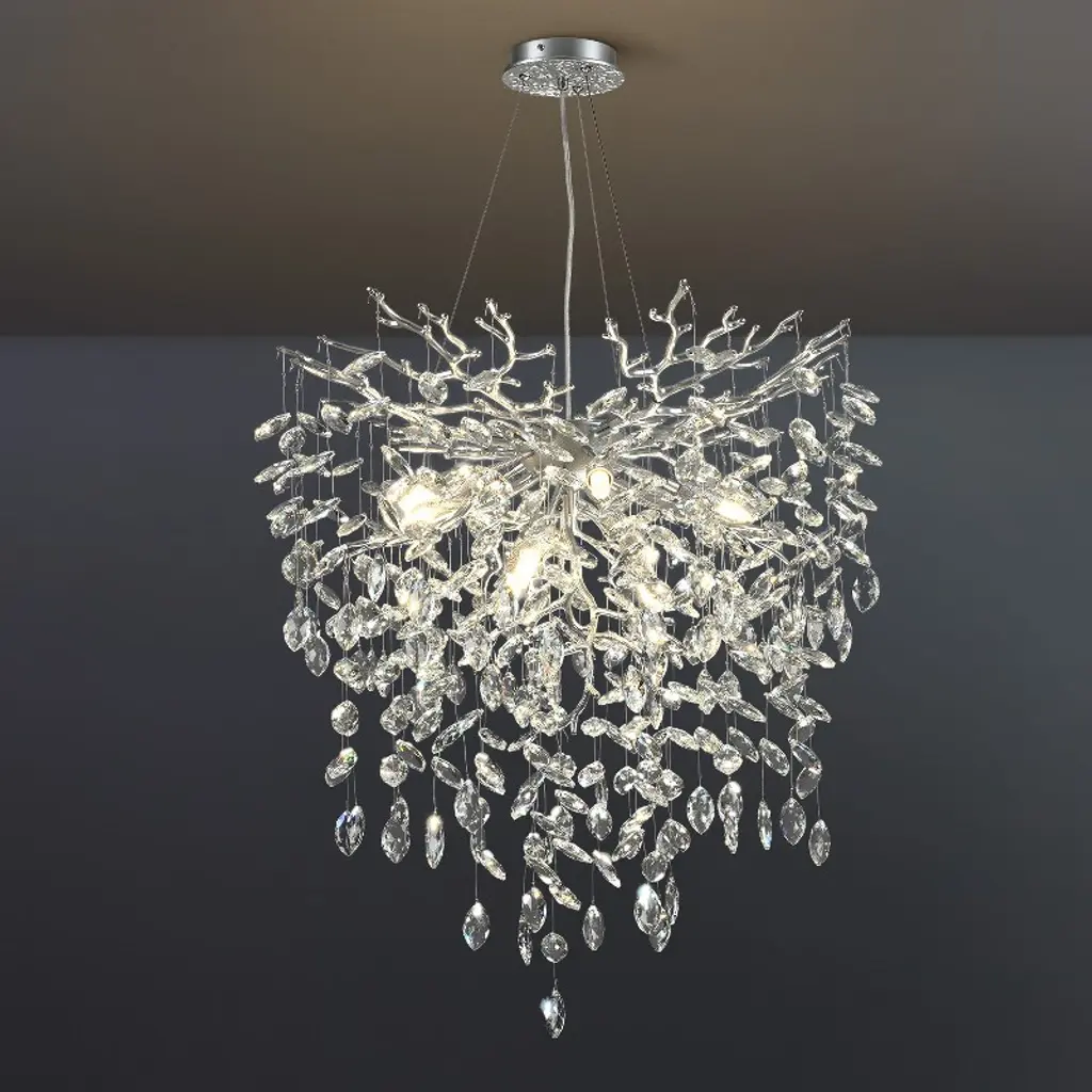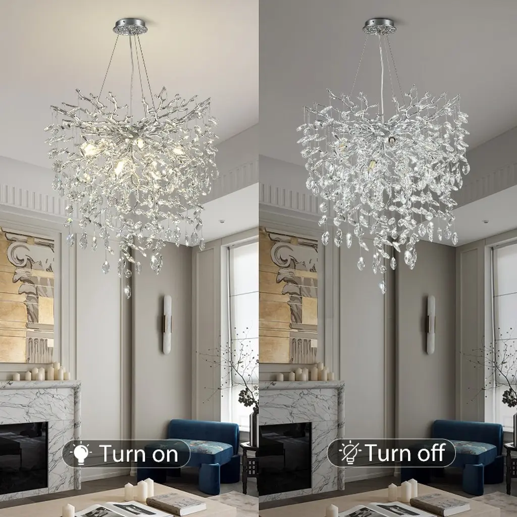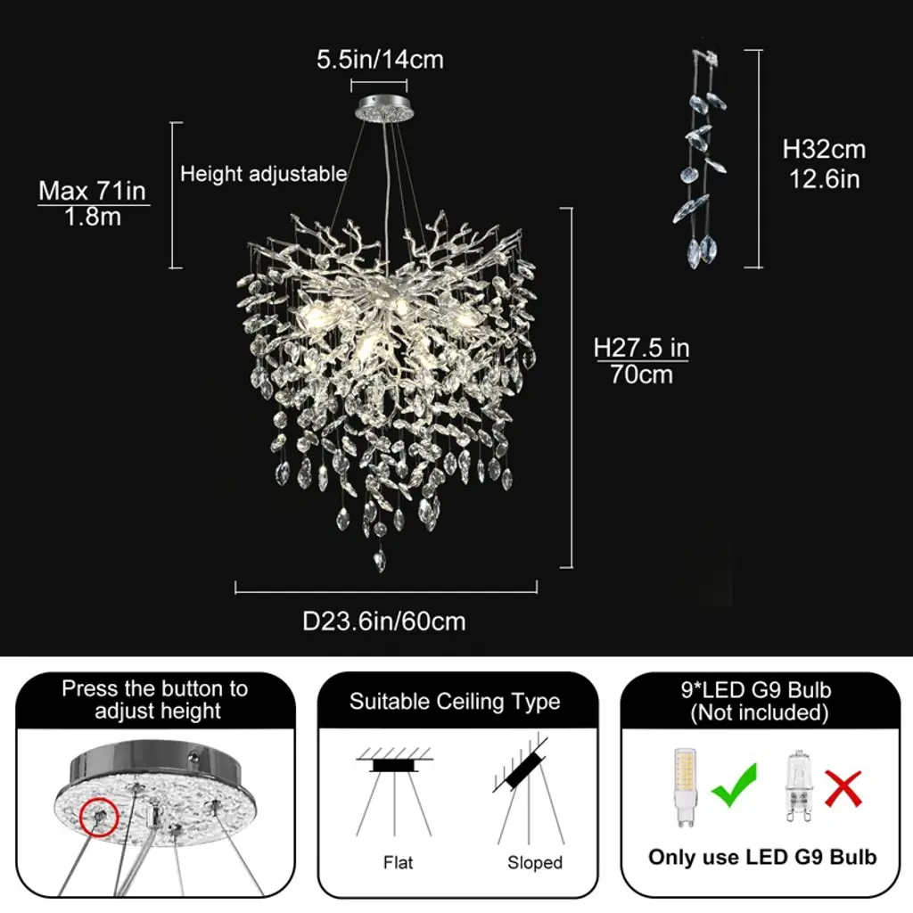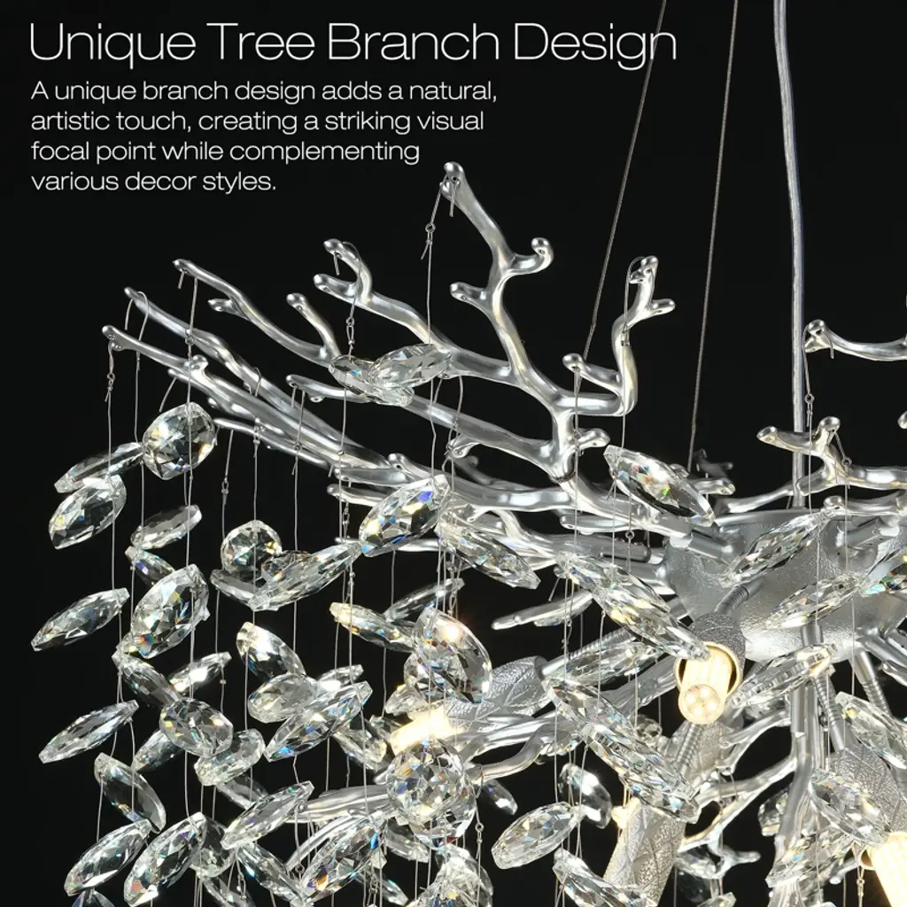The 9-light chandelier is inspired by a tree branch, adding natural beauty and a modern look to your space. Featuring strings of clear K9 crystals suspended from a metal frame in this stunning chandelier, creating a dazzling and captivating glow. Crafted with an aluminum metal framework and a sleek finish, this crystal chandelier offers both durability and opulence. Upgrade your dining room or kitchen, or bedroom with this exquisite crystal chandelier and transform your space into a romantic, elegant ambiance.