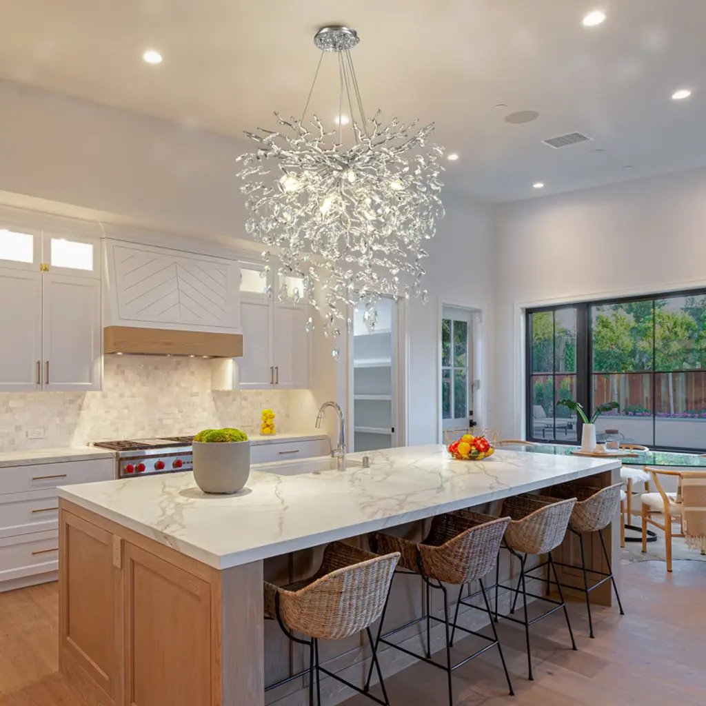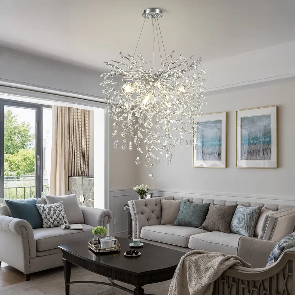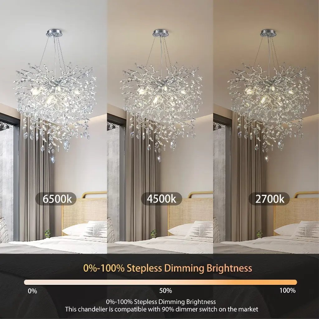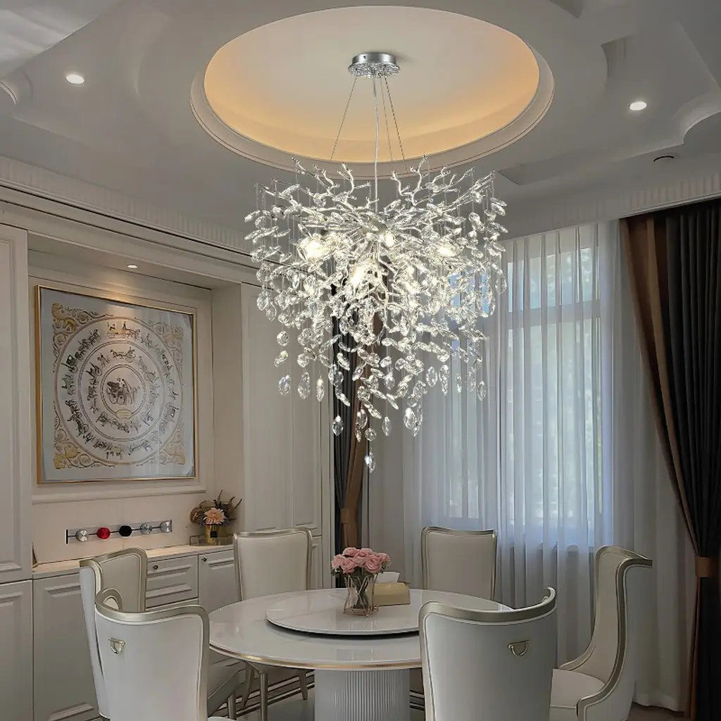 The 9-light chandelier is inspired by a tree branch, adding natural beauty and a modern look to your space. Featuring strings of clear K9 crystals suspended from a metal frame in this stunning chandelier, creating a dazzling and captivating glow. Crafted with an aluminum metal framework and a sleek finish, this crystal chandelier offers both durability and opulence. Upgrade your dining room or kitchen, or bedroom with this exquisite crystal chandelier and transform your space into a romantic, elegant ambiance.