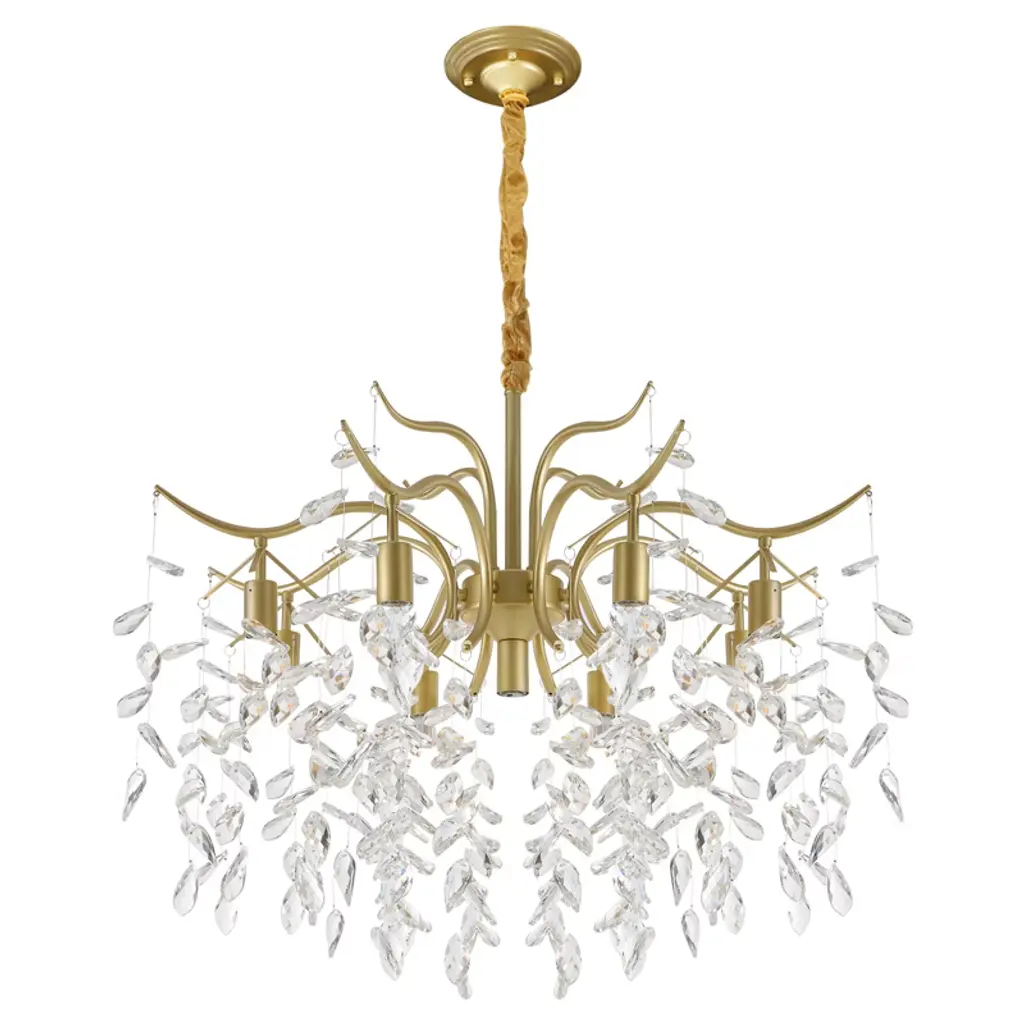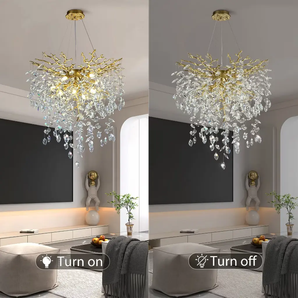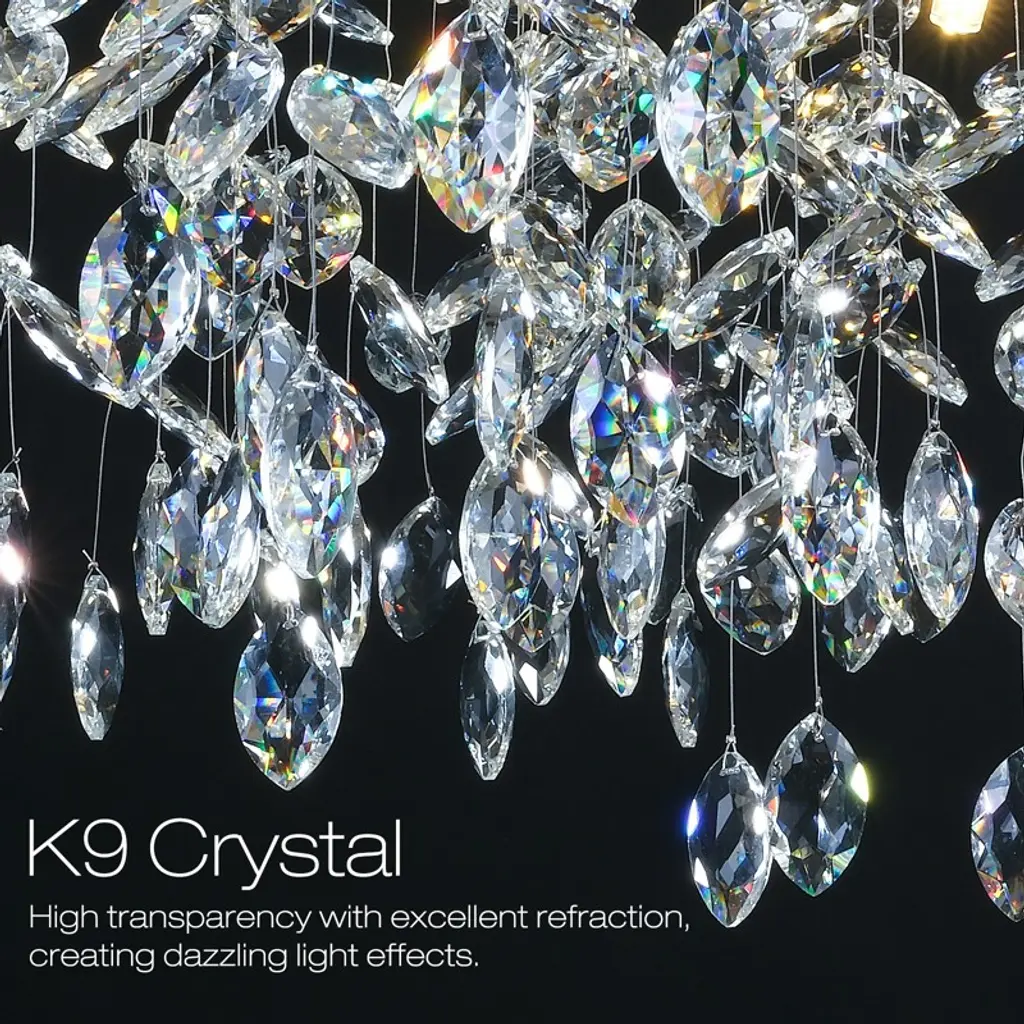 The 9-light chandelier is inspired by a tree branch, adding natural beauty and a modern look to your space. Featuring strings of clear K9 crystals suspended from a metal frame in this stunning chandelier, creating a dazzling and captivating glow. Crafted with an aluminum metal framework and a sleek finish, this crystal chandelier offers both durability and opulence. Upgrade your dining room or kitchen, or bedroom with this exquisite crystal chandelier and transform your space into a romantic, elegant ambiance.