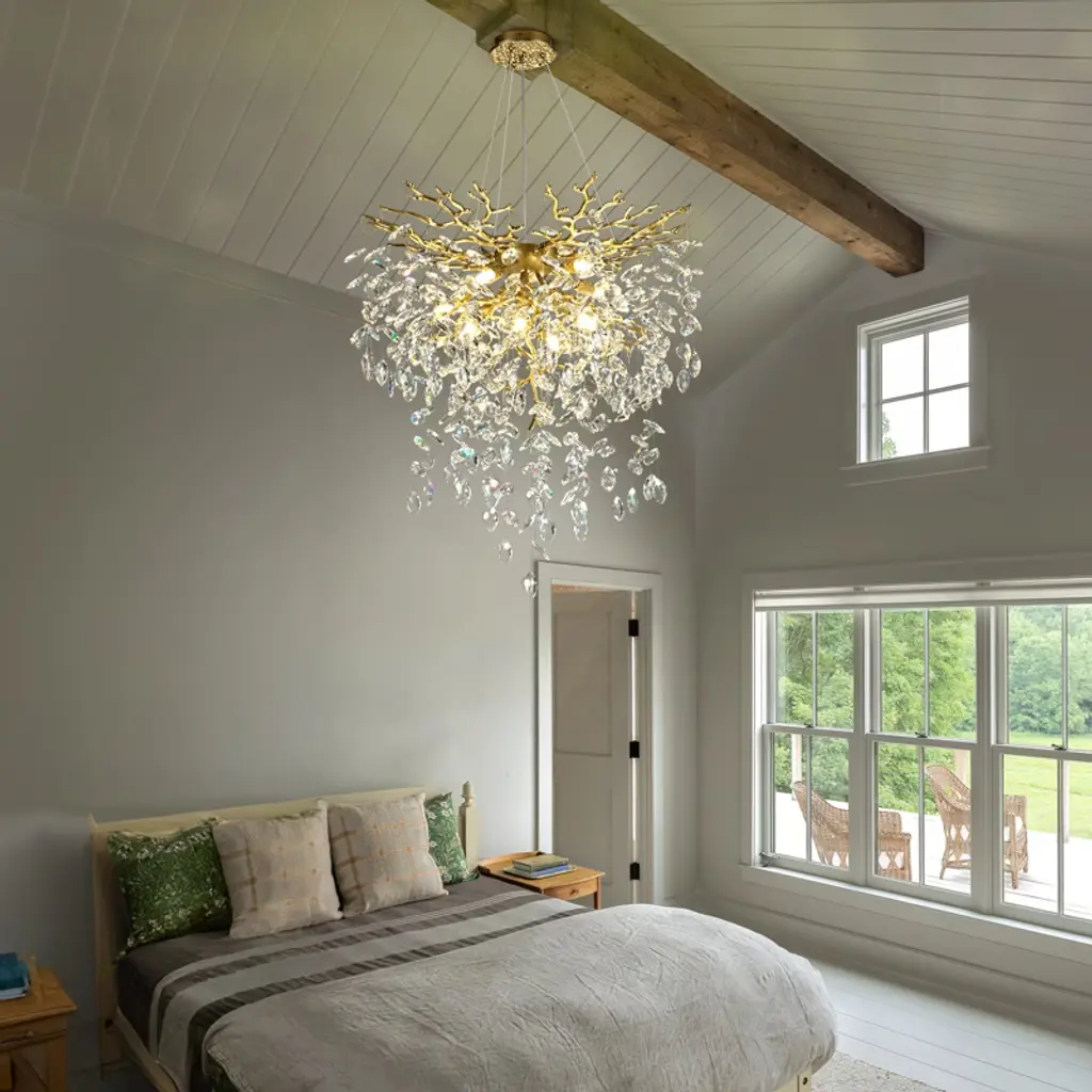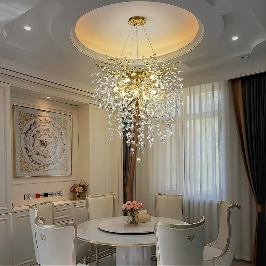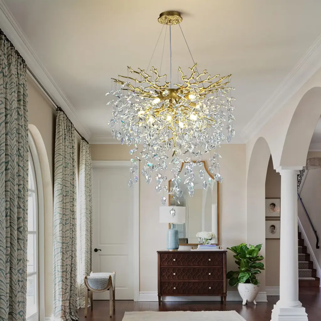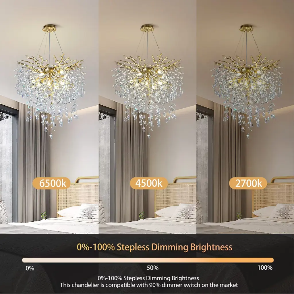 The 9-light chandelier is inspired by a tree branch, adding natural beauty and a modern look to your space. Featuring strings of clear K9 crystals suspended from a metal frame in this stunning chandelier, creating a dazzling and captivating glow. Crafted with an aluminum metal framework and a sleek finish, this crystal chandelier offers both durability and opulence. Upgrade your dining room or kitchen, or bedroom with this exquisite crystal chandelier and transform your space into a romantic, elegant ambiance.
