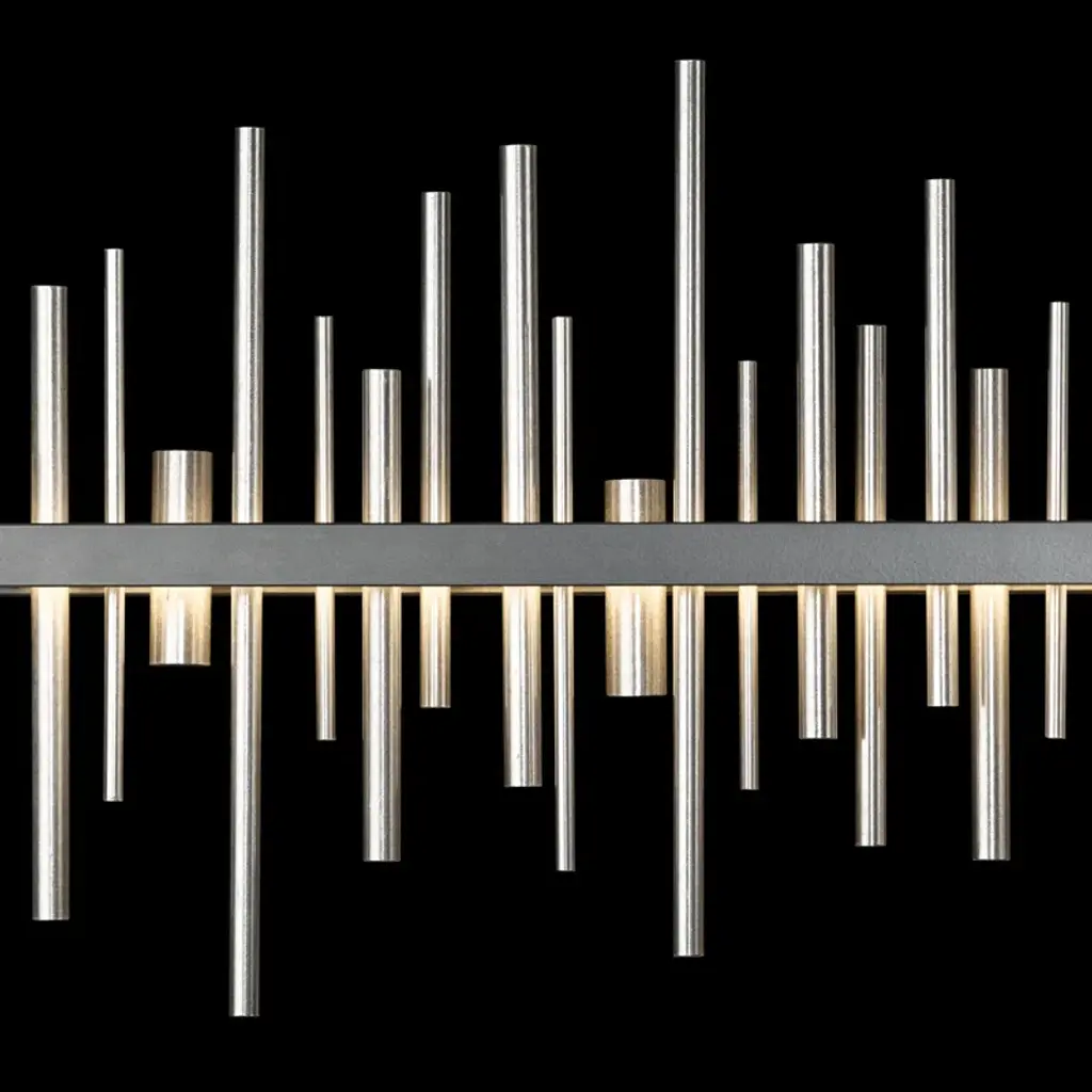 With a choice of accents, this pendant offers an amazing "city view" no matter where you live. Our handcrafted Cityscape seems to be floating in mid-air. The visual concept is meant to evoke the image of skyscraper silhouettes situated on the waterfront (an LED platform) and reflected off the water below. A wash of beautiful up-and-down light graces this elegant fixture. All Hubbardton Forge products are hand-crafted to last one at a time in Vermont.