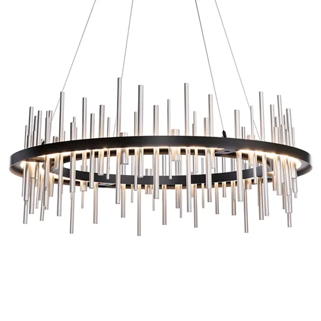 Hubbardton Forge’s Cityscape Circular LED Pendant receives its distinctive namesake from its ultra-contemporary profile build that allows it to stand out in its contemporary application space. The piece’s most distinctive feature is its use of polished aluminum rods that line the circumference of the circular framework. The framework itself is also made from aluminum for a much more cohesive aesthetic while the rods are fixated at different heights to convey a sense of a city skyline, hence its name. The rods can produce ambient up and downward lighting, allowing the piece to produce a warm and comforting aura of light.