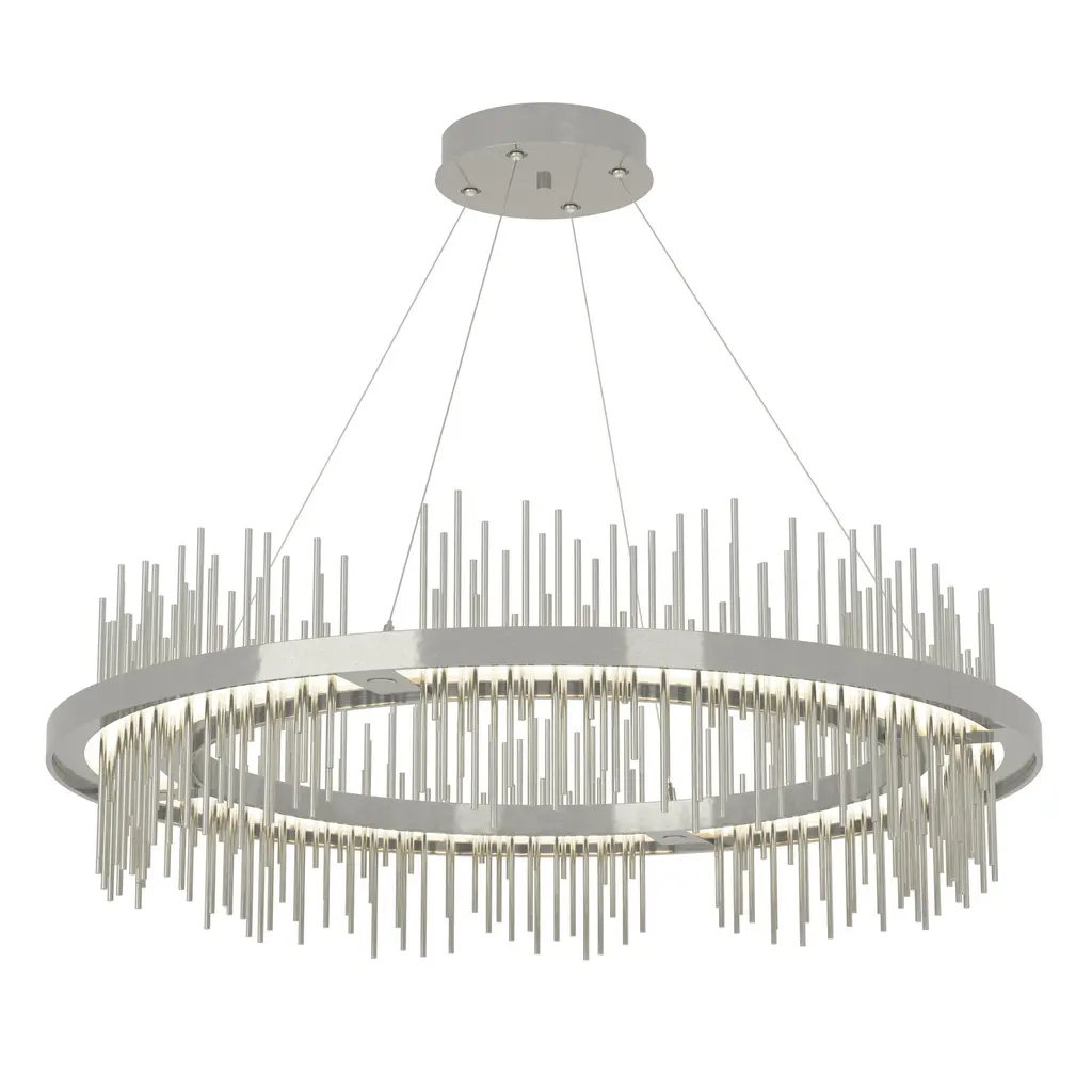The Circular Cityscape Pendant is a stunning addition to the Cityscape collection of fixtures by Hubbardton Forge. Evoking the imagery of skyscraper silhouettes reflecting upon the waterfront, polished aluminum rods are washed in up-and-down light as they pass through a large circular LED light guide to “reflect” elegantly on the other side. With a choice of accents, this large pendant offers an amazing "city view" no matter where you live.