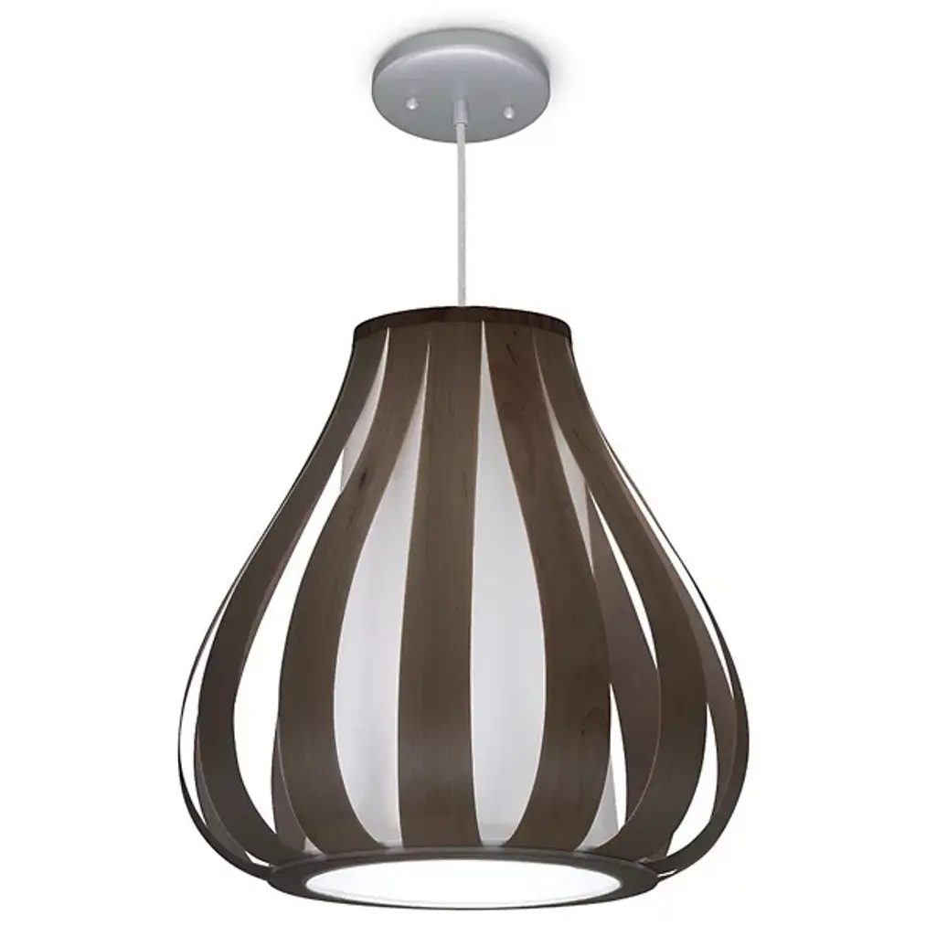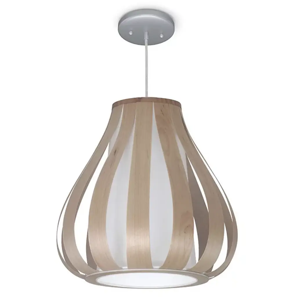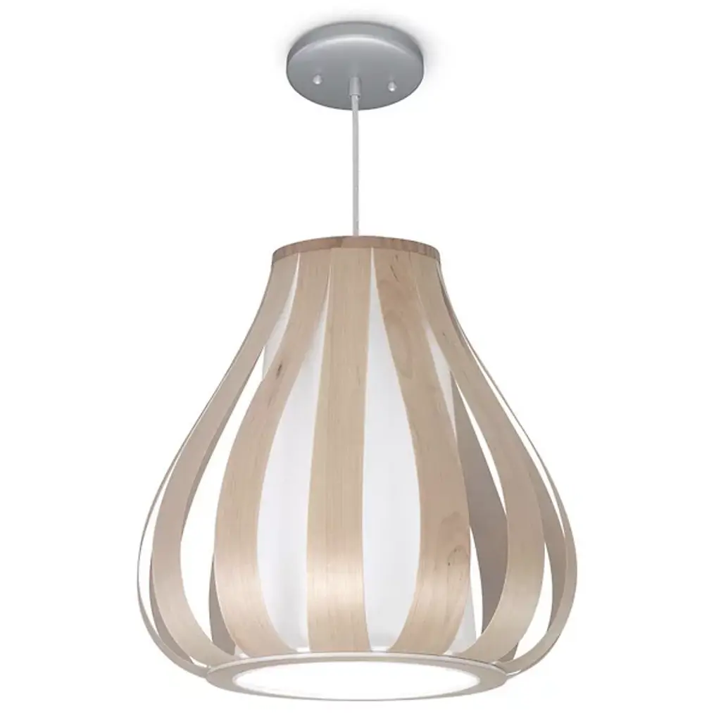 The Clara Pendant from Seascape Lamps presents a curving, carefully constructed example of contrasting materials, creating an ethereal character. Each bulb-shaped fixture is handmade in Seascape's California studio from a mix of wood veneer slats that arc out around a central axis while dispensing a wash of downlight below. A translucent inner diffuser tube contrasts with opaque ribbons, giving the layered shade a curving bulb shape that flares out at its base, dispensing warm glow to the sides, accompanied by vertical, shadowy accents.