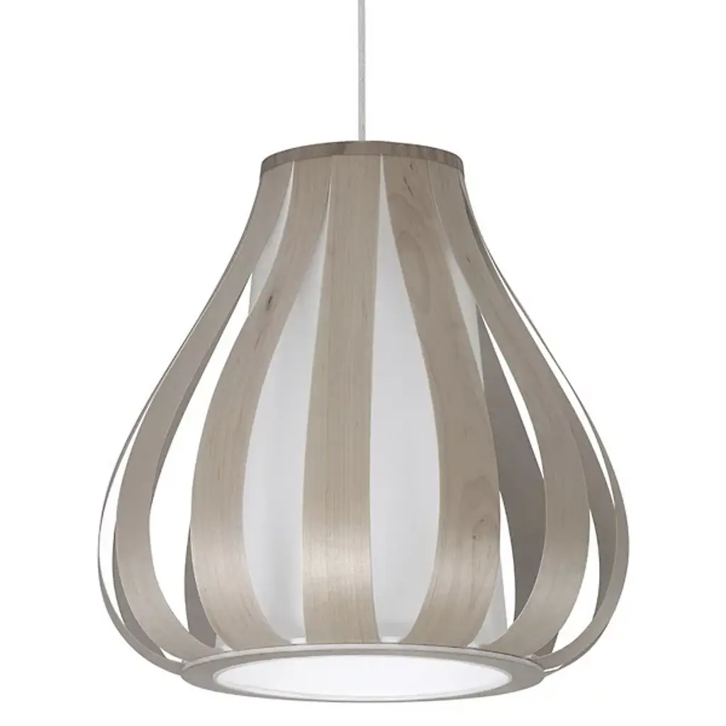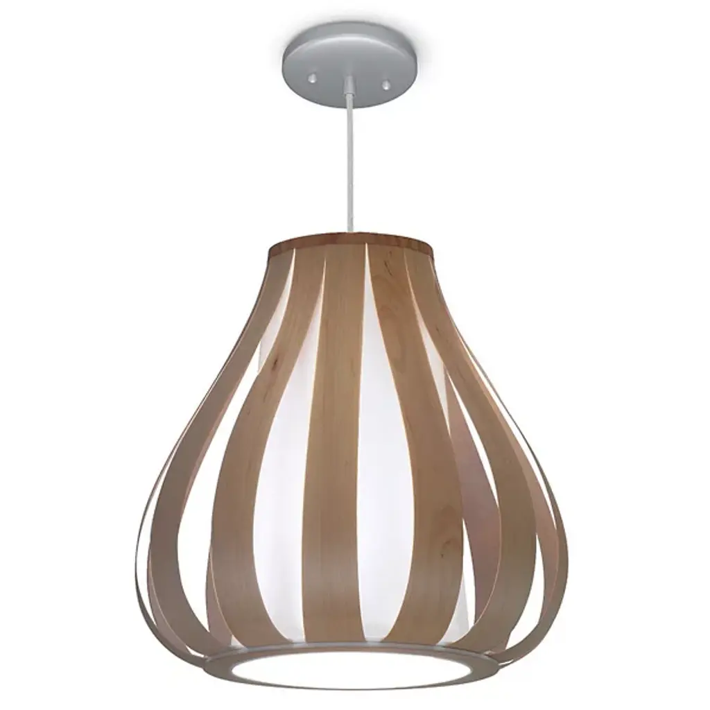 The Clara Pendant from Seascape Lamps presents a curving, carefully constructed example of contrasting materials, creating an ethereal character. Each bulb-shaped fixture is handmade in Seascape's California studio from a mix of wood veneer slats that arc out around a central axis while dispensing a wash of downlight below. A translucent inner diffuser tube contrasts with opaque ribbons, giving the layered shade a curving bulb shape that flares out at its base, dispensing warm glow to the sides, accompanied by vertical, shadowy accents.
