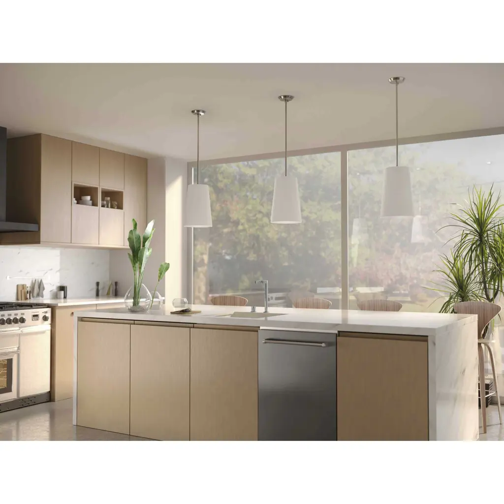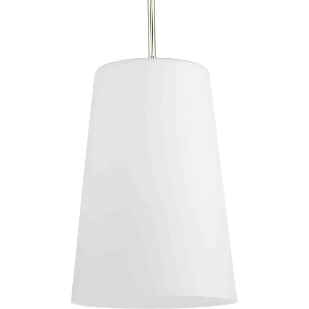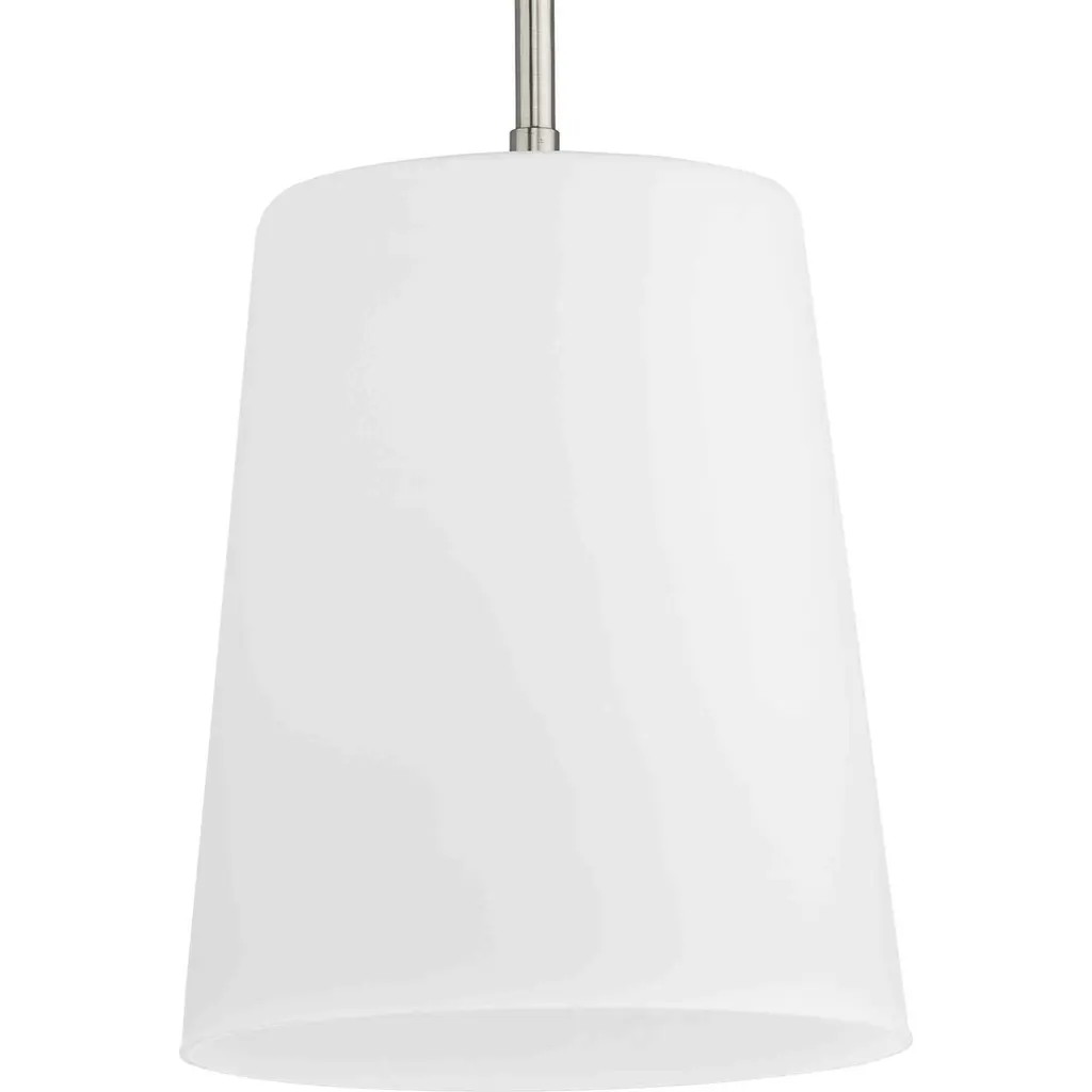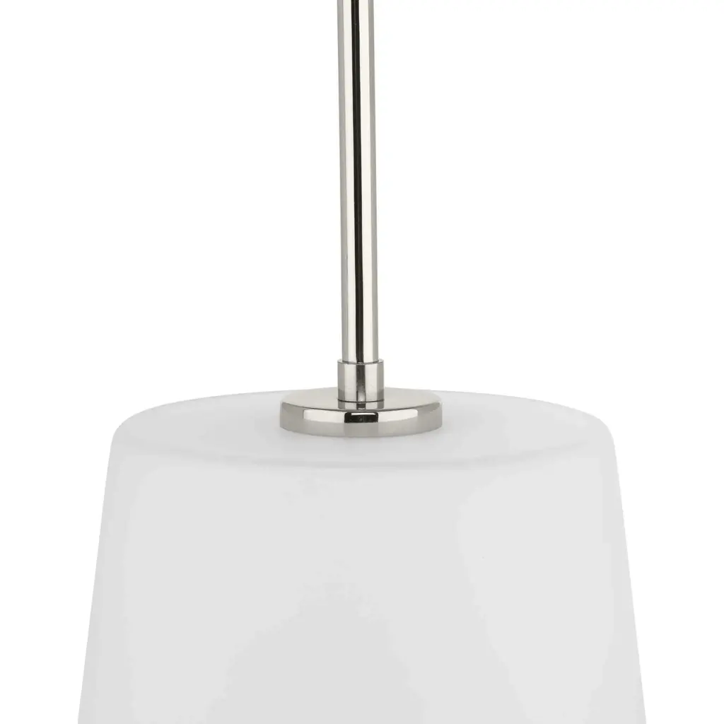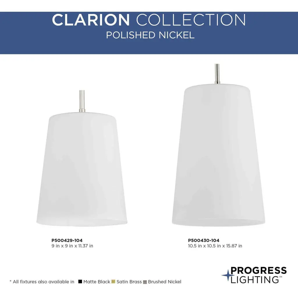 Elegant in its simplicity, the versatile Clarion pendant features an etched glass shade that embraces minimalist modernity and functional task lighting. The glass shade rests at the end of a sleek polished nickel bar that attaches to the ceiling. Each light fixture has a swivel at its base that makes it perfect for installing on flat or angled ceilings.
