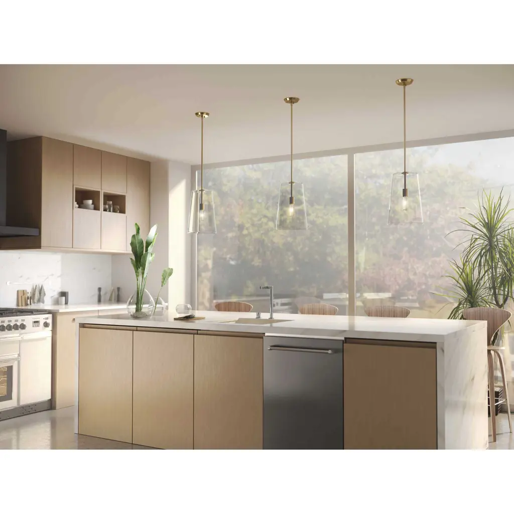 Who says you have to sacrifice forms for function? This versatile pendant features a simple, clear glass shade that embraces minimalist modernity and functional task lighting. The glass shade rests at the end of a sleek satin brass bar that attaches to the ceiling. Each light fixture has a swivel at its base that makes it perfect for installing on flat or angled ceilings.