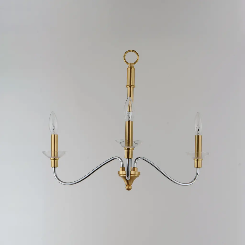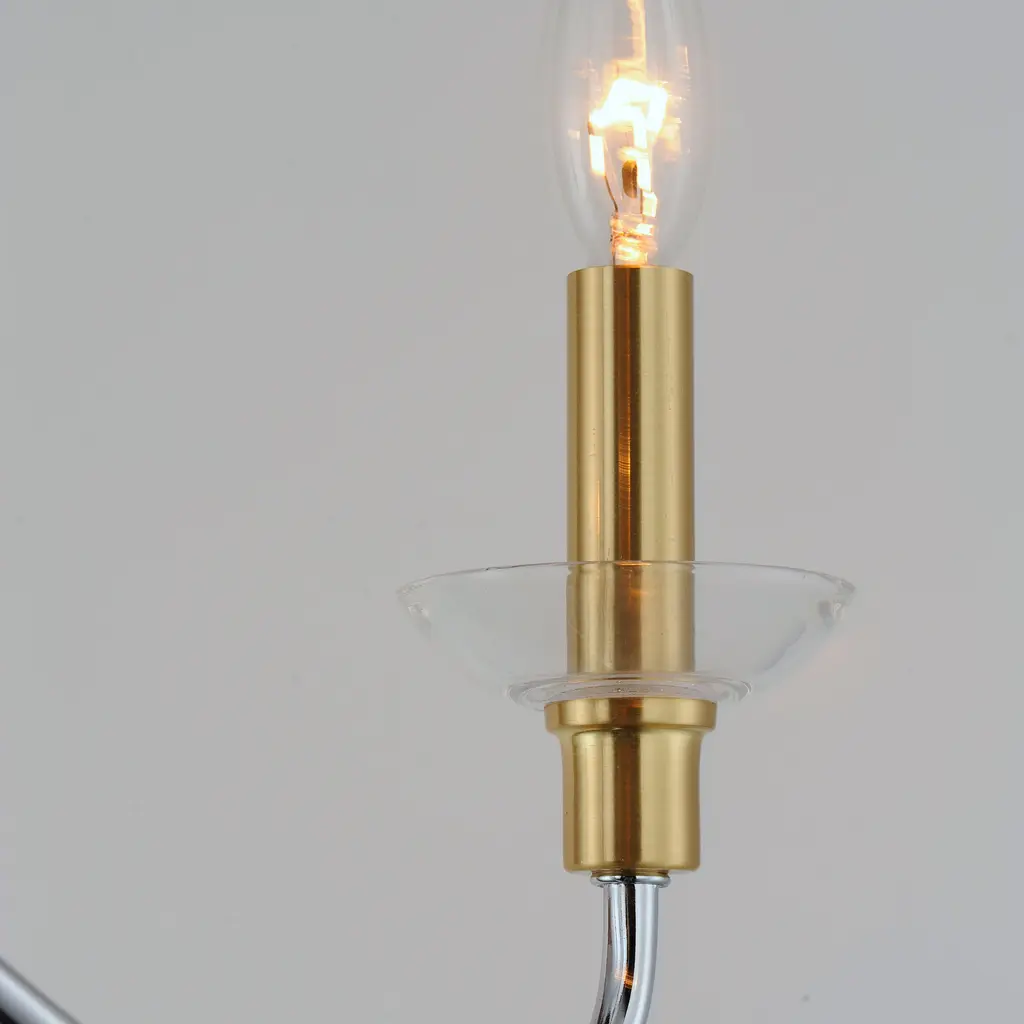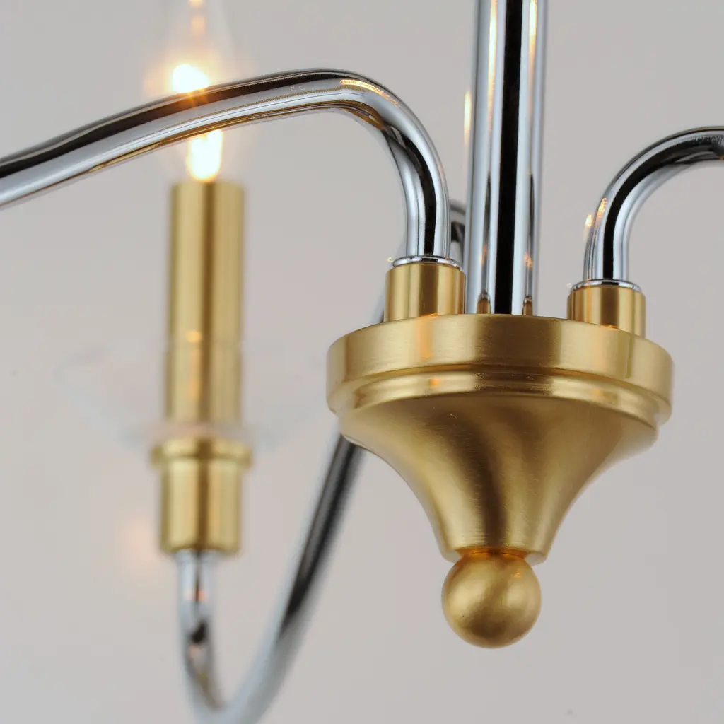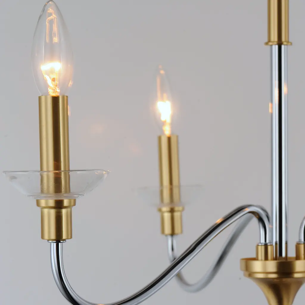 Combination of contemporary Polished Chrome and a softer Satin Brass revitalizes a classic form. Glass bobeches complete the look creating an airy and simple chandelier group. Get that casual luxe look with minimalistic, transitional forms.