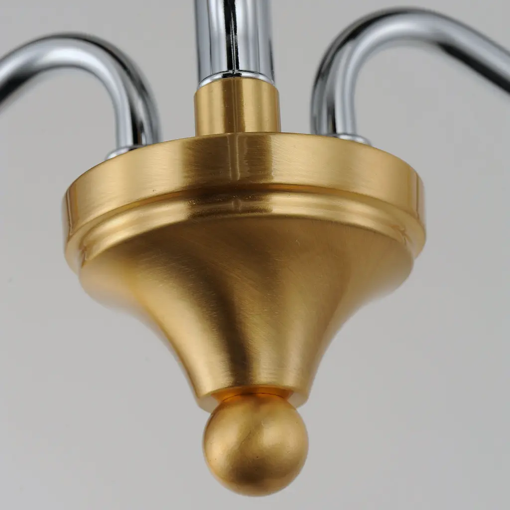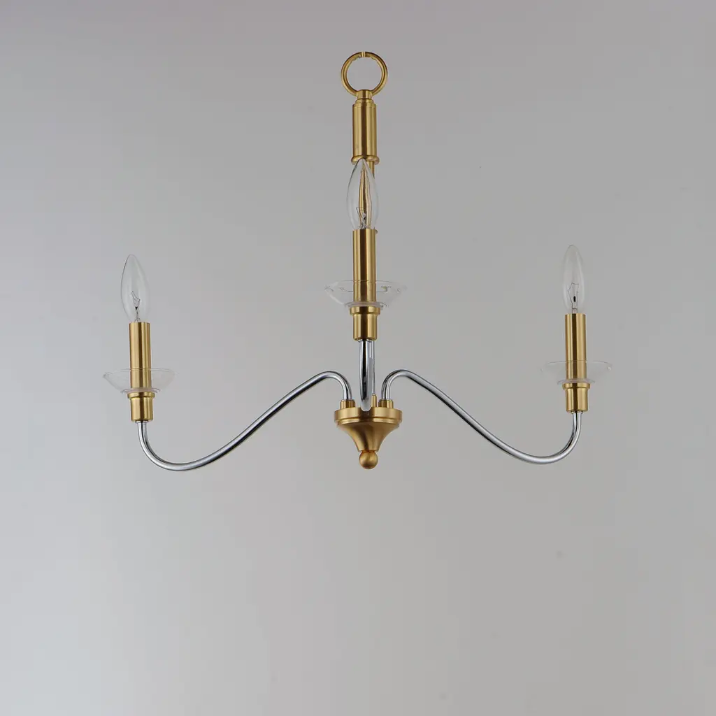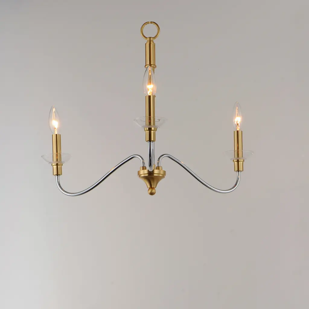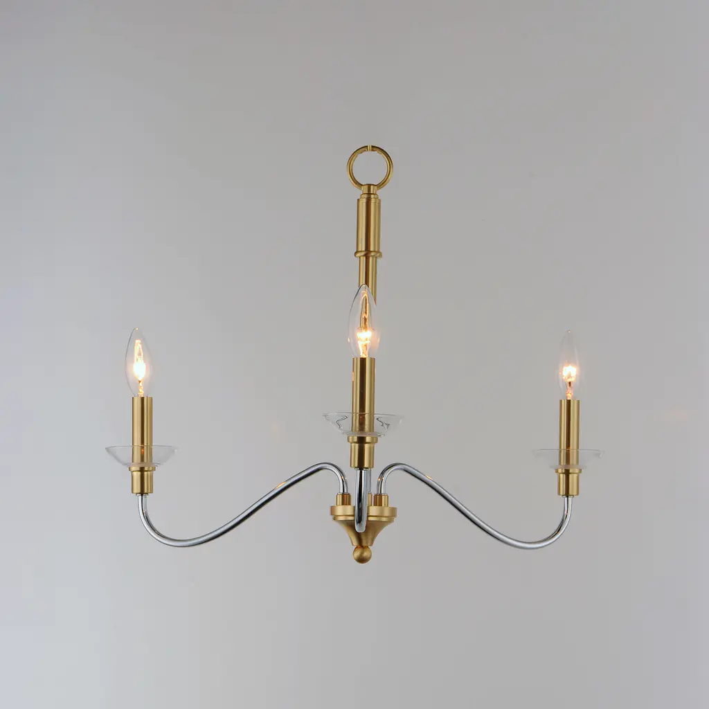 Combination of contemporary Polished Chrome and a softer Satin Brass revitalizes a classic form. Glass bobeches complete the look creating an airy and simple chandelier group. Get that casual luxe look with minimalistic, transitional forms.