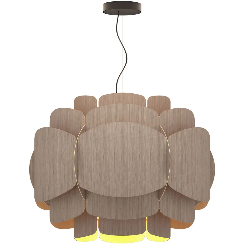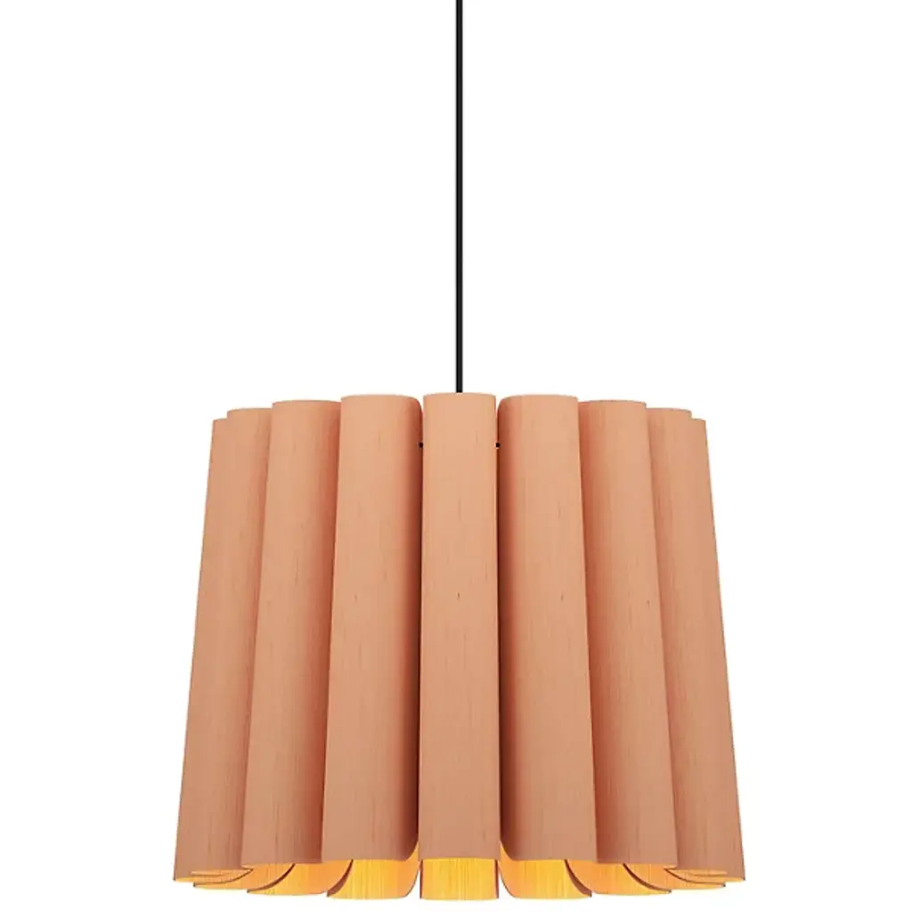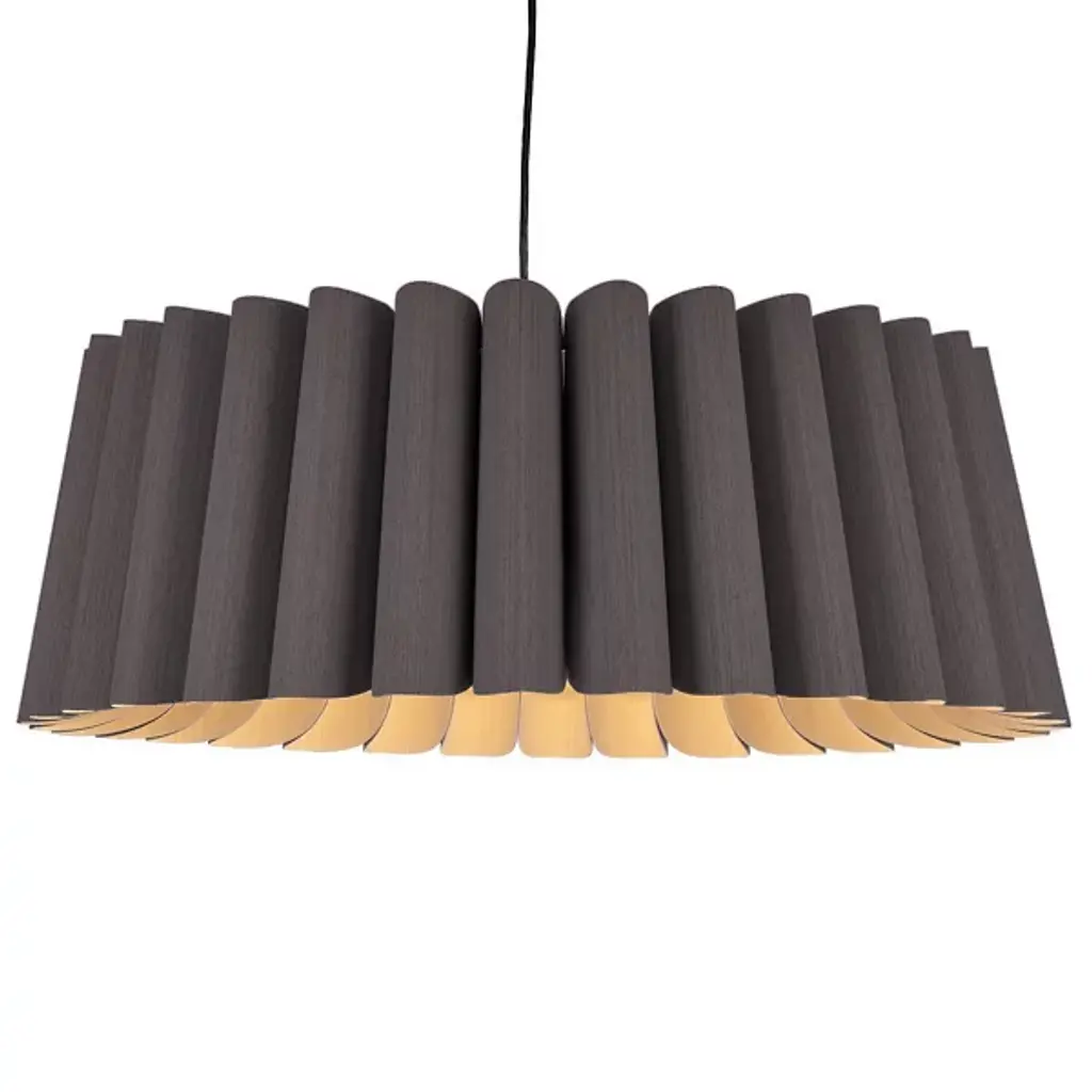 A truly brilliant experiment in natural modern lighting, the Clarissa Pendant by Bruck Lighting features a unique design that evokes the shape of a mechanical gear or wheel spoke, yet is crafted entirely from specially engineered wood veneer. As part of the Wood Ecological Project (WEP), this pendant showcases the versatility of flexible, durable wood, with its grain revealed through a translucent finish both inside and out. This stunning piece adds a modern yet natural touch, making it an ideal centerpiece above a round dining table or breakfast nook.
