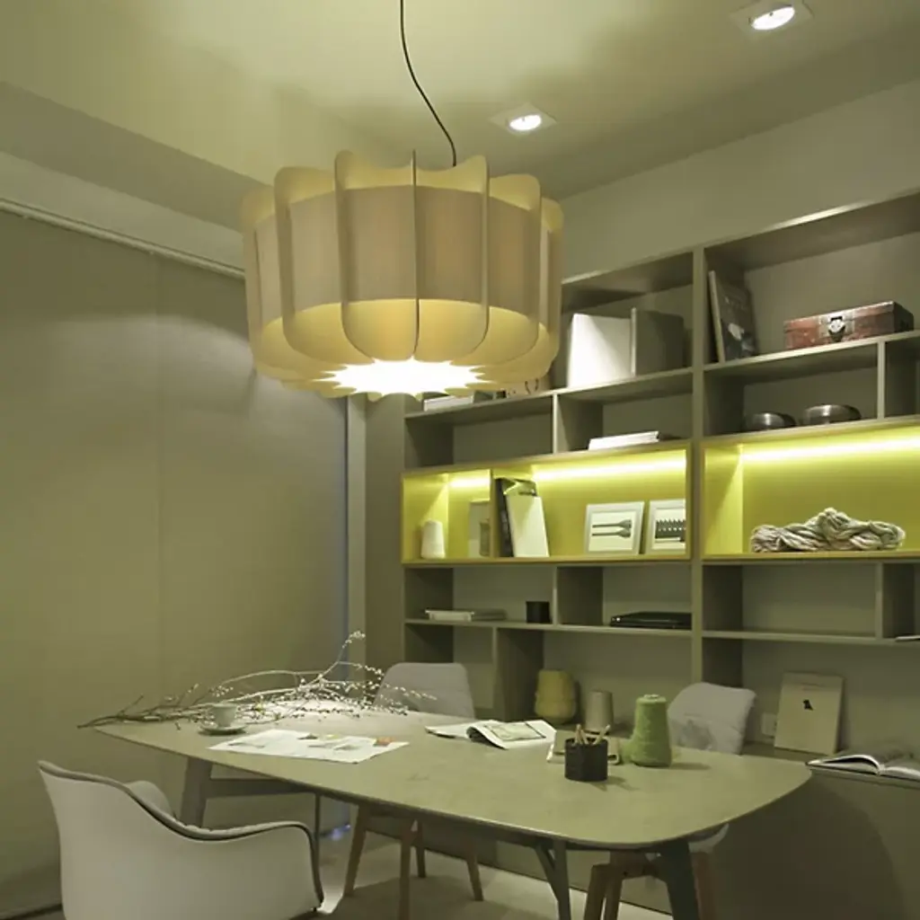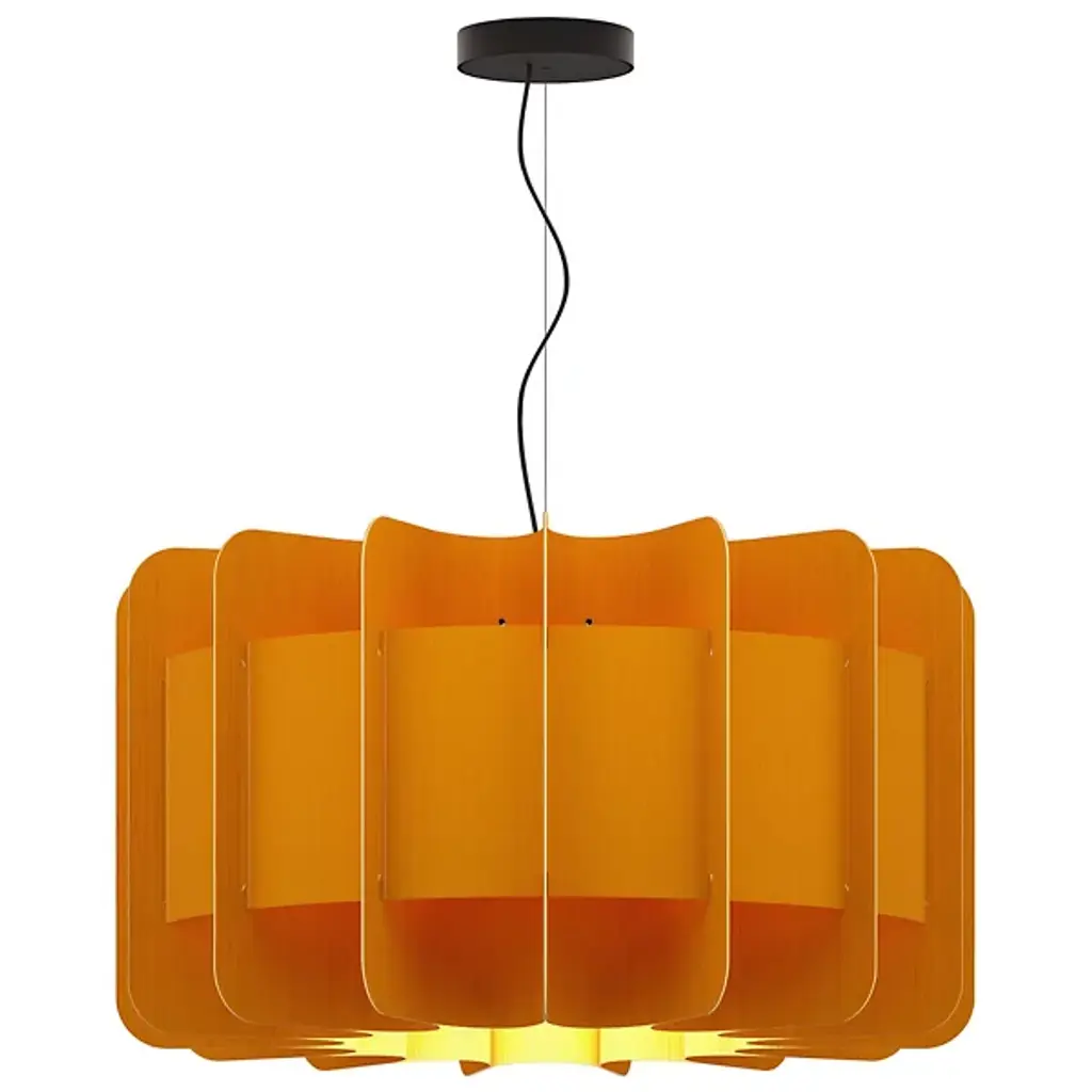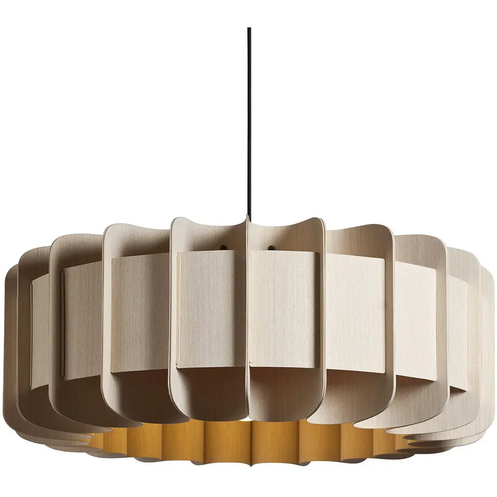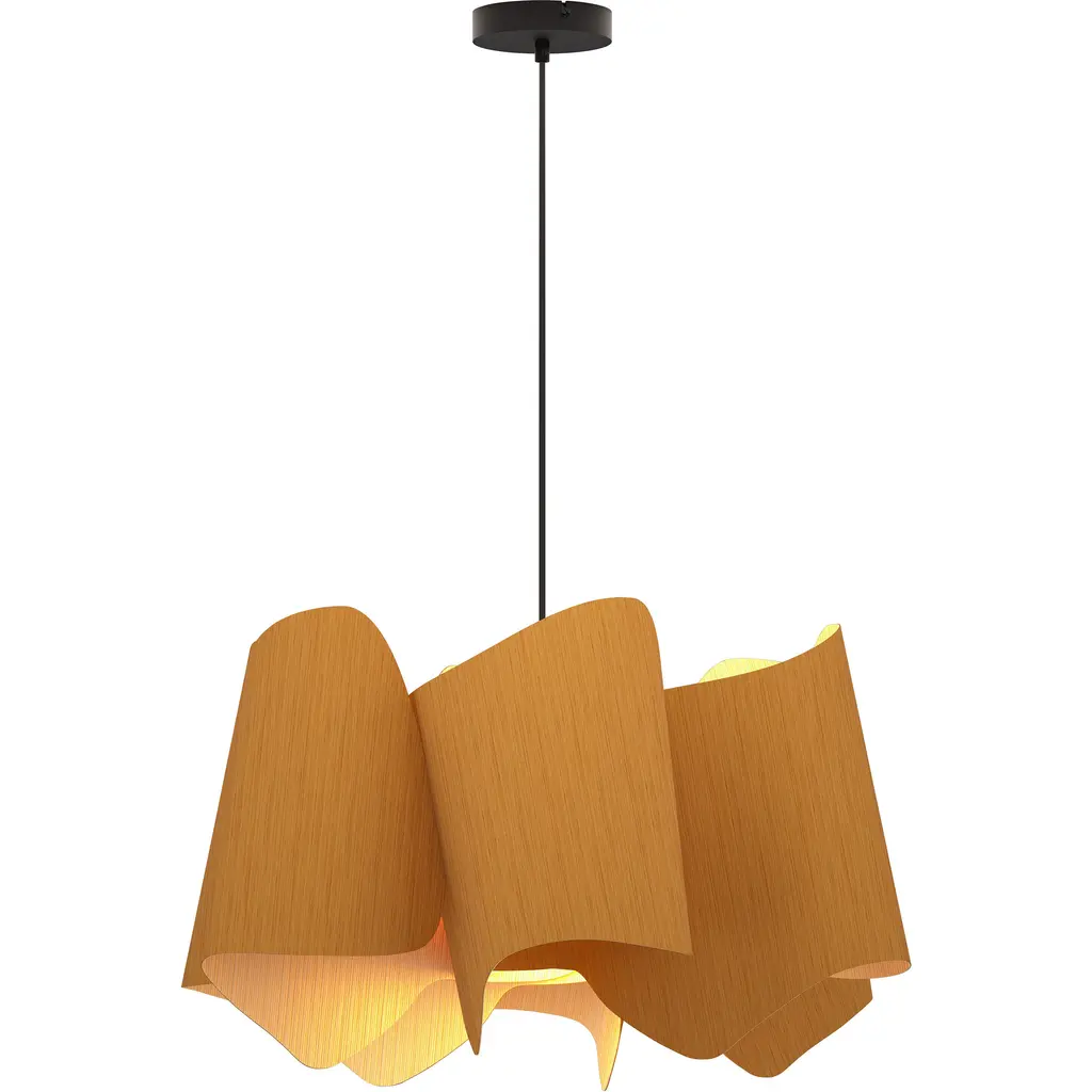 A truly brilliant experiment in natural modern lighting, the Clarissa Pendant by Bruck Lighting features a unique design that evokes the shape of a mechanical gear or wheel spoke, yet is crafted entirely from specially engineered wood veneer. As part of the Wood Ecological Project (WEP), this pendant showcases the versatility of flexible, durable wood, with its grain revealed through a translucent finish both inside and out. This stunning piece adds a modern yet natural touch, making it an ideal centerpiece above a round dining table or breakfast nook.