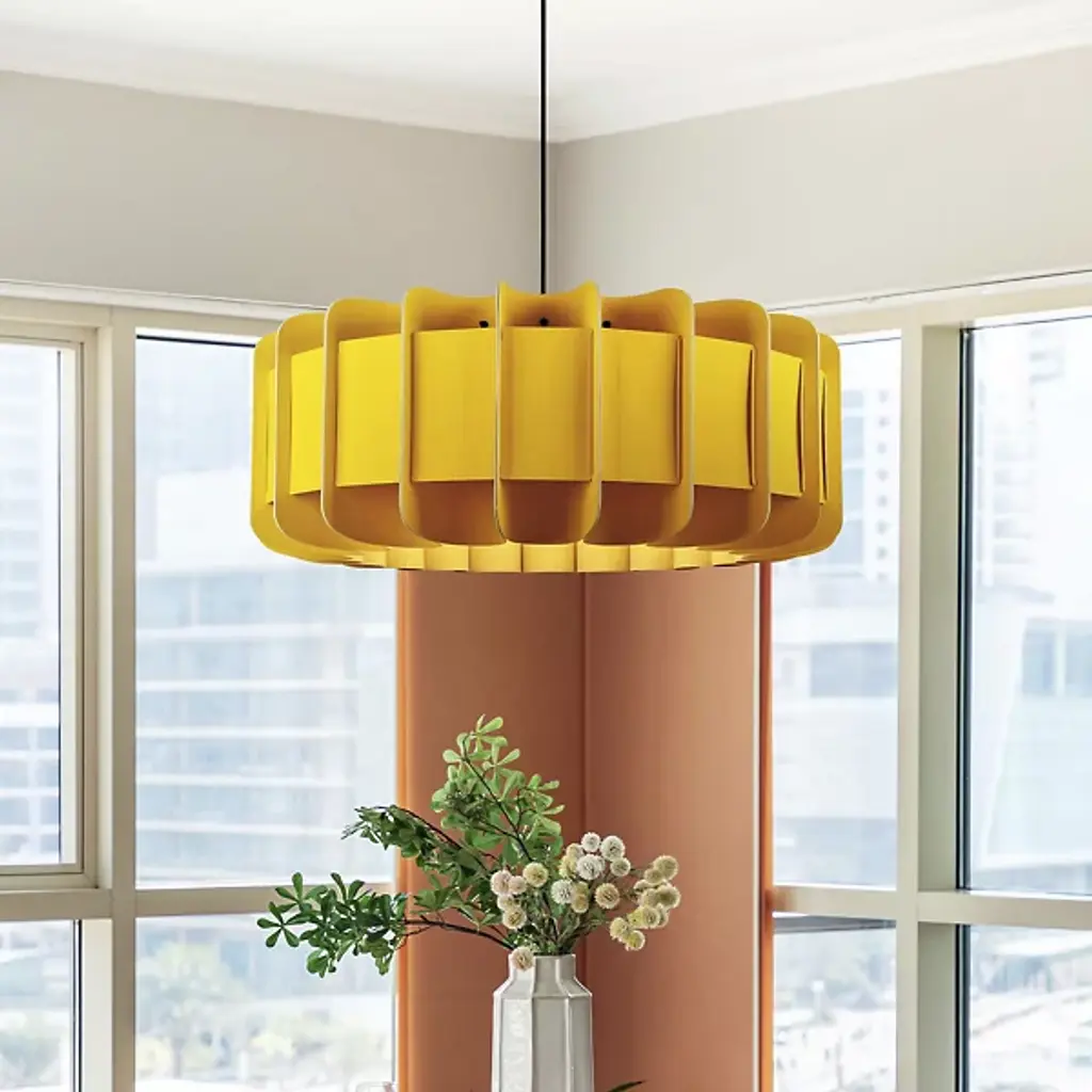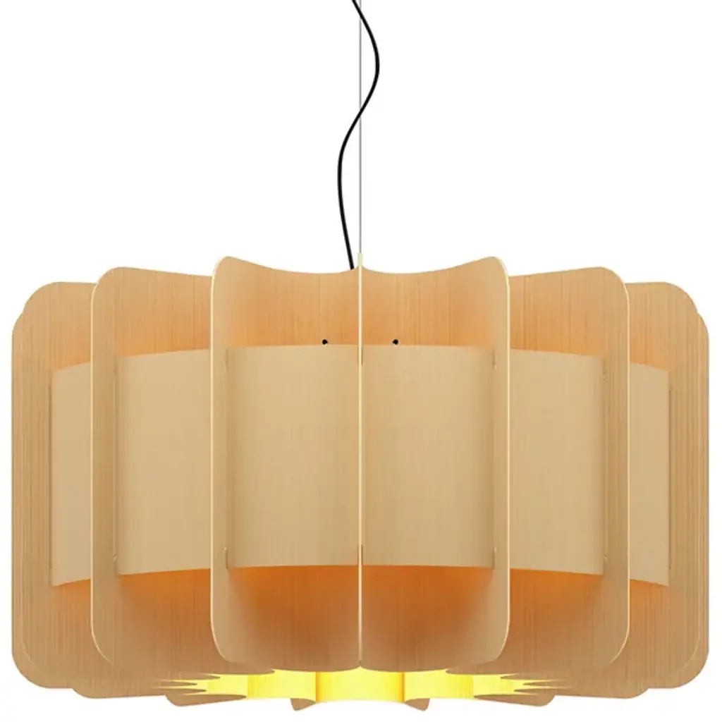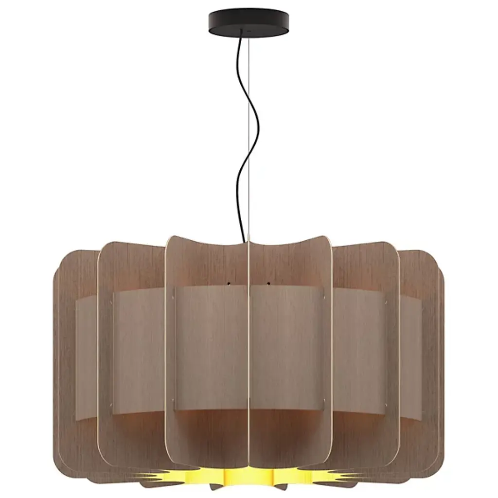 A truly brilliant experiment in natural modern lighting, the Clarissa Pendant by Bruck Lighting features a unique design that evokes the shape of a mechanical gear or wheel spoke, yet is crafted entirely from specially engineered wood veneer. As part of the Wood Ecological Project (WEP), this pendant showcases the versatility of flexible, durable wood, with its grain revealed through a translucent finish both inside and out. This stunning piece adds a modern yet natural touch, making it an ideal centerpiece above a round dining table or breakfast nook.