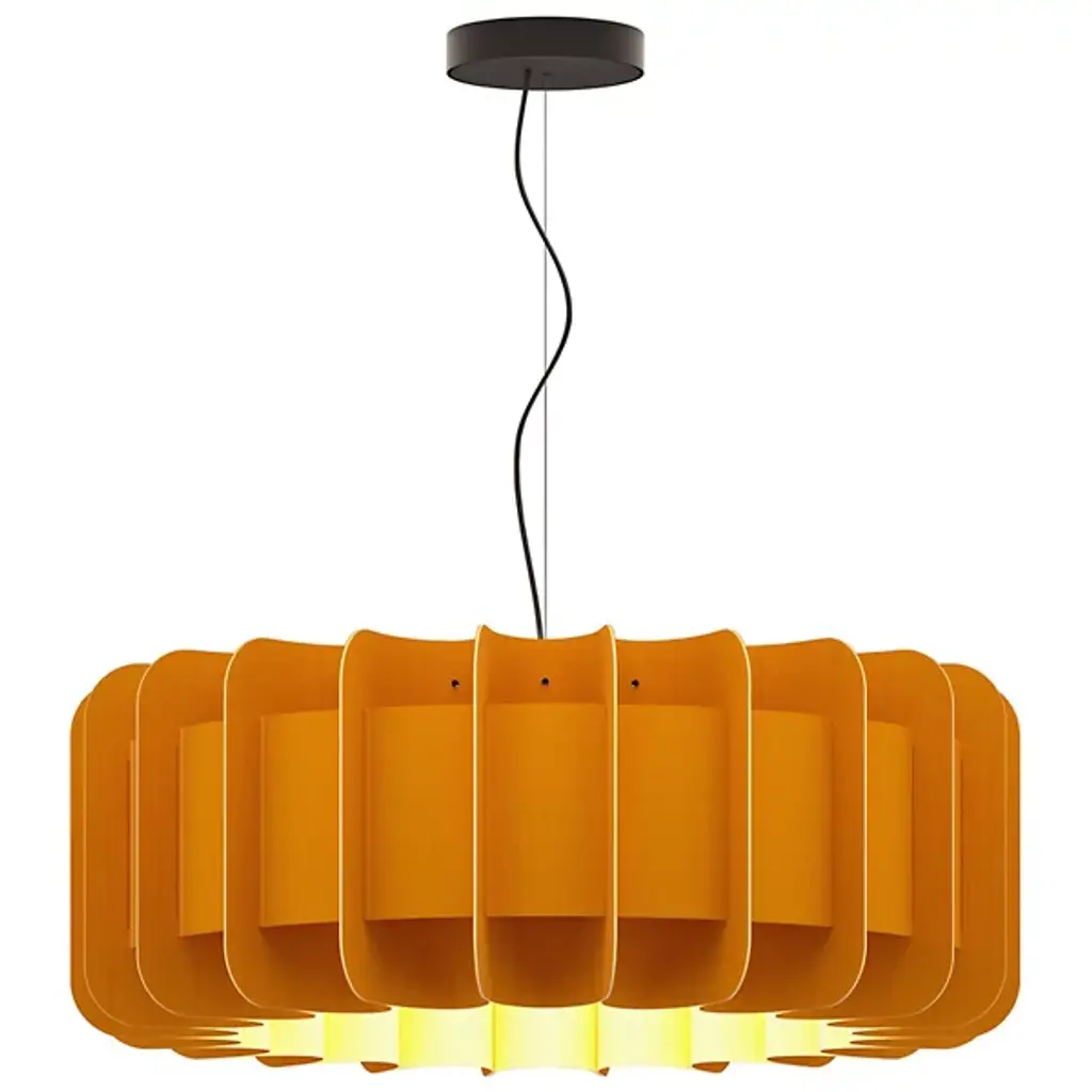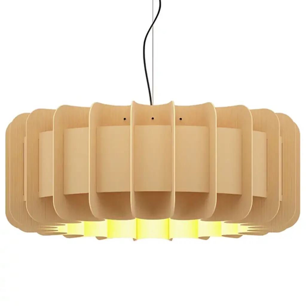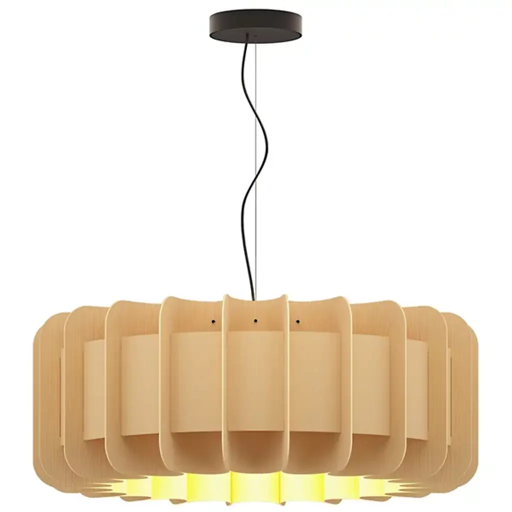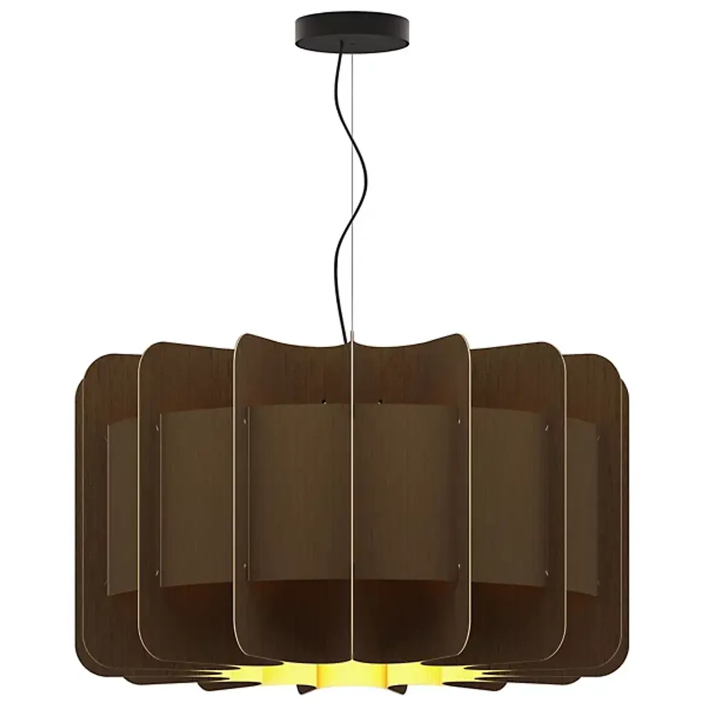 A truly brilliant experiment in natural modern lighting, the Clarissa Pendant by Bruck Lighting features a unique design that evokes the shape of a mechanical gear or wheel spoke, yet is crafted entirely from specially engineered wood veneer. As part of the Wood Ecological Project (WEP), this pendant showcases the versatility of flexible, durable wood, with its grain revealed through a translucent finish both inside and out. This stunning piece adds a modern yet natural touch, making it an ideal centerpiece above a round dining table or breakfast nook.