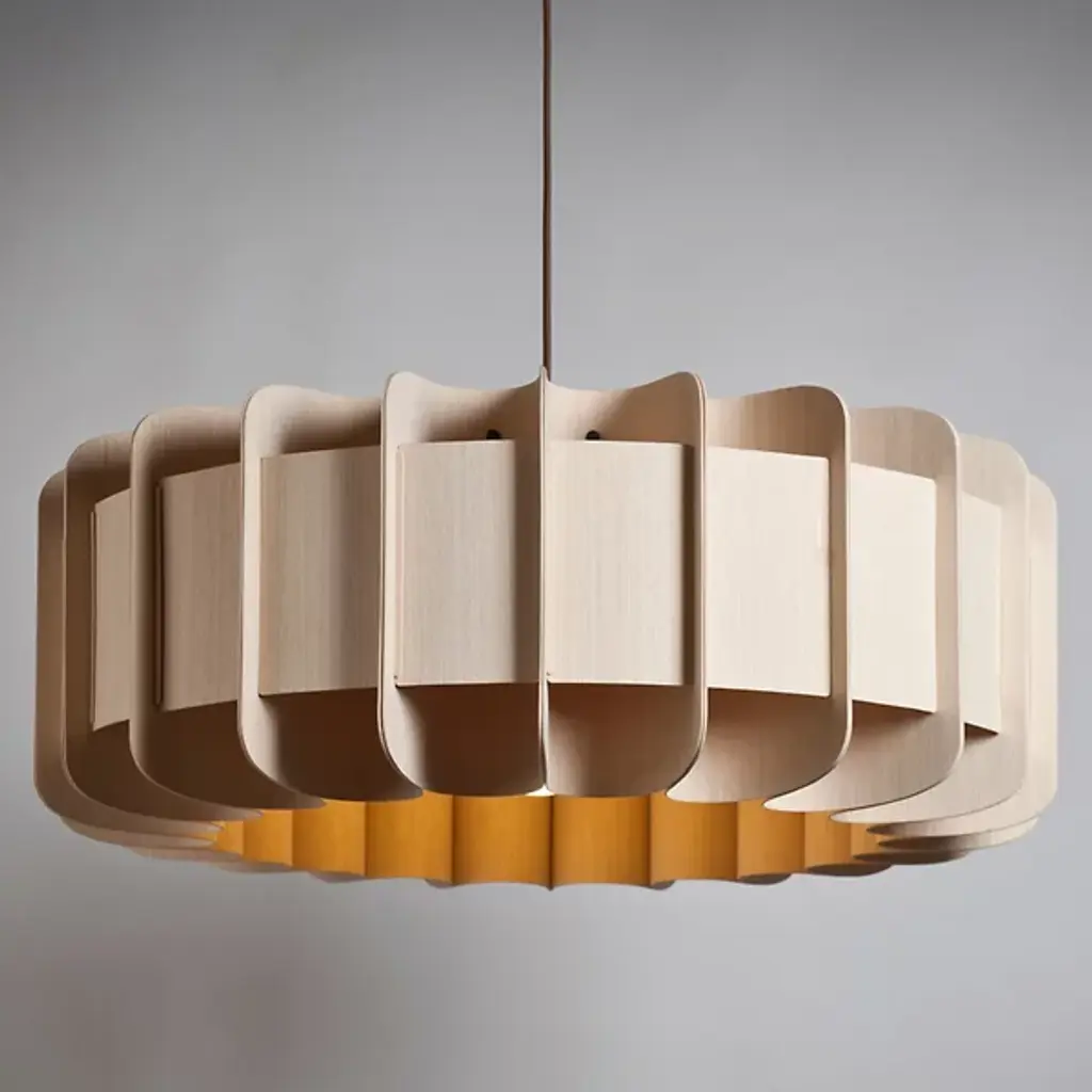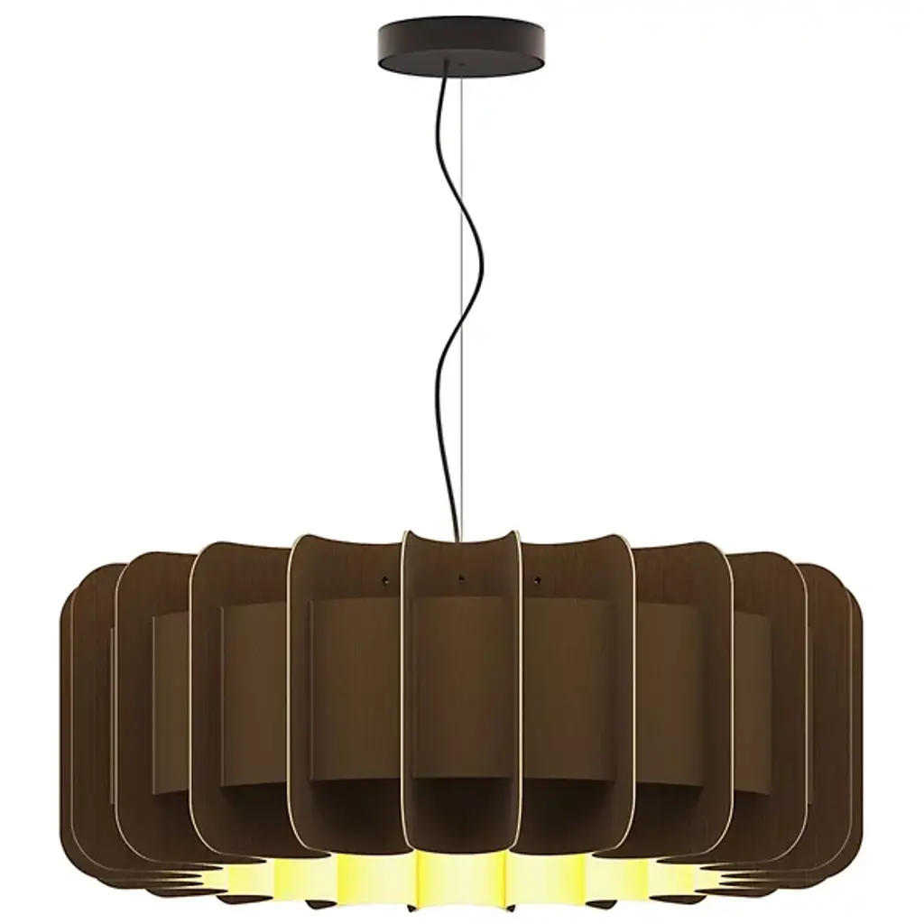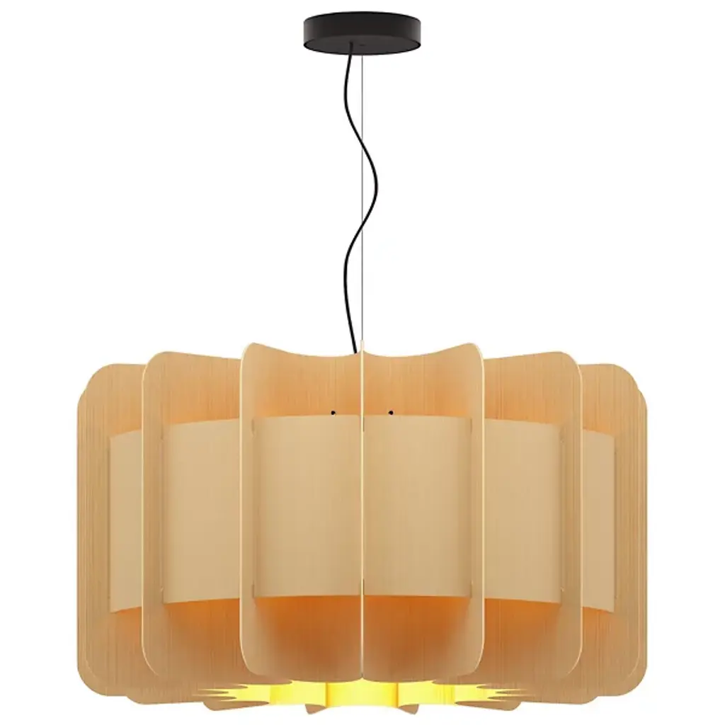 A truly brilliant experiment in natural modern lighting, the Clarissa Pendant by Bruck Lighting features a unique design that evokes the shape of a mechanical gear or wheel spoke, yet is crafted entirely from specially engineered wood veneer. As part of the Wood Ecological Project (WEP), this pendant showcases the versatility of flexible, durable wood, with its grain revealed through a translucent finish both inside and out. This stunning piece adds a modern yet natural touch, making it an ideal centerpiece above a round dining table or breakfast nook.