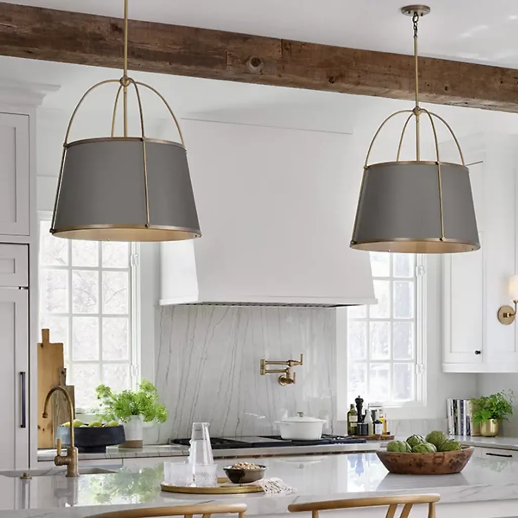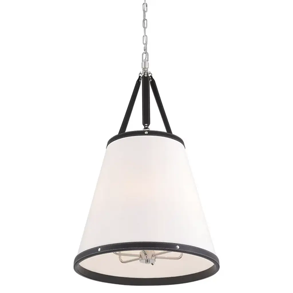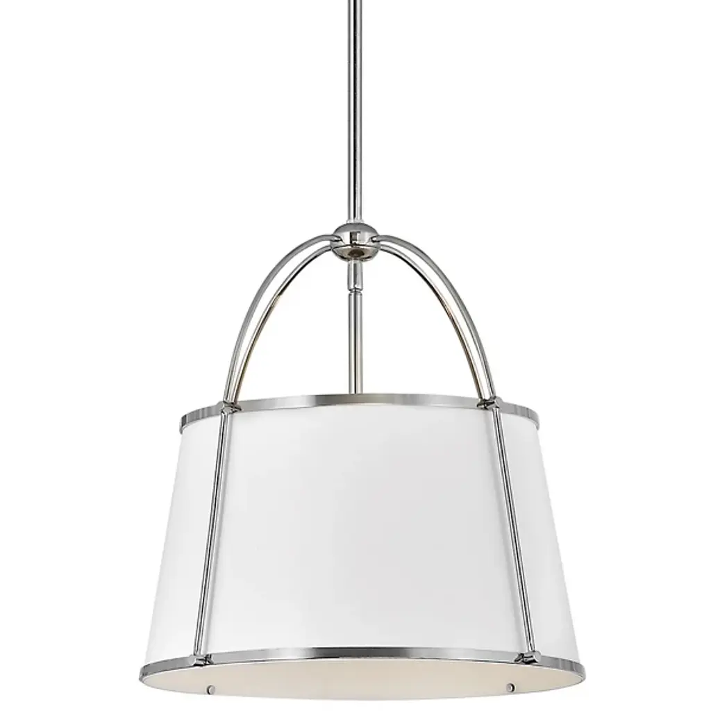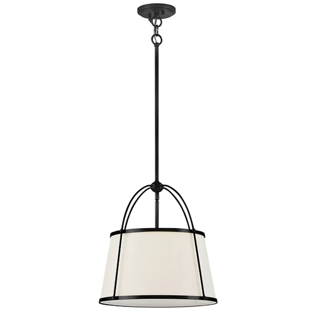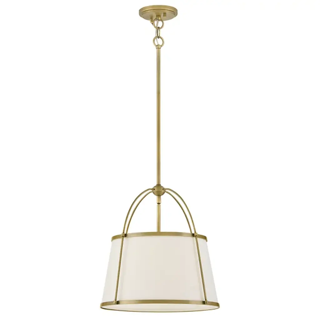 The Clarke Pendant by Hinkley Lighting accents spaces with a blend of classic, elegant lines and timeless details that are highlighted by a dynamic, two-tone finish. The traditional silhouette of a tapered, drum-shaped shade is elevated with gracefully arced rods that reach above this piece, intersecting at a spherical accent along the simple down rod supporting it. Minimalistic hardware accents add a thoughtful touch to this handsome pendant as it brings a lovely layer of light to spaces.