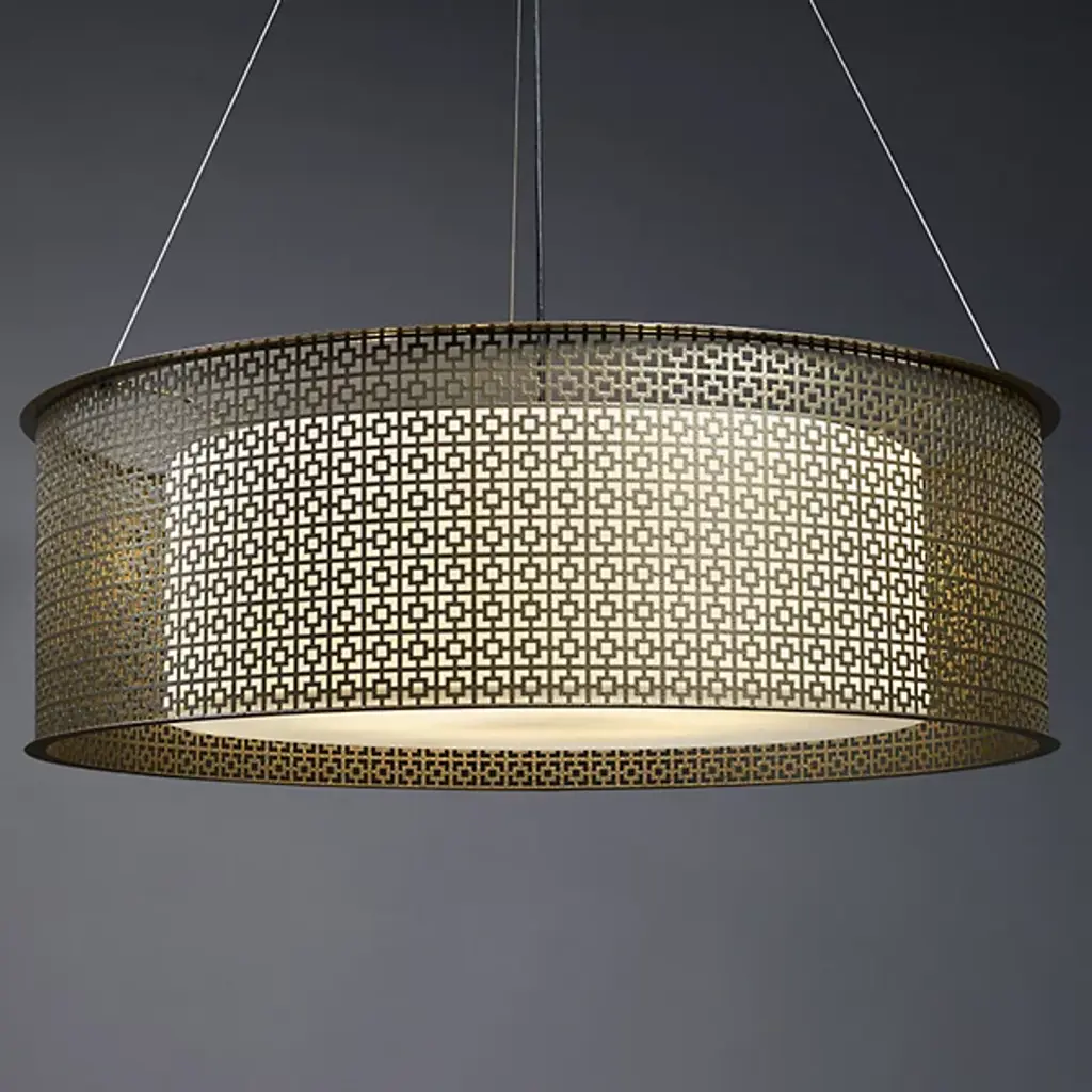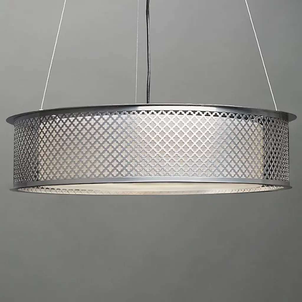 The Ultralights Clarus Drum Pendant with Diffuser makes a bold statement while still being simple and to the point. Hard forged metal has been formed into a short round cylinder, accented with an ornate all over cut-out design. The bulbs are softly dispersed through the Opal Acrylic diffuser, the illumination being evenly spread as well as bouncing off the metallic finish with a little playfulness.
