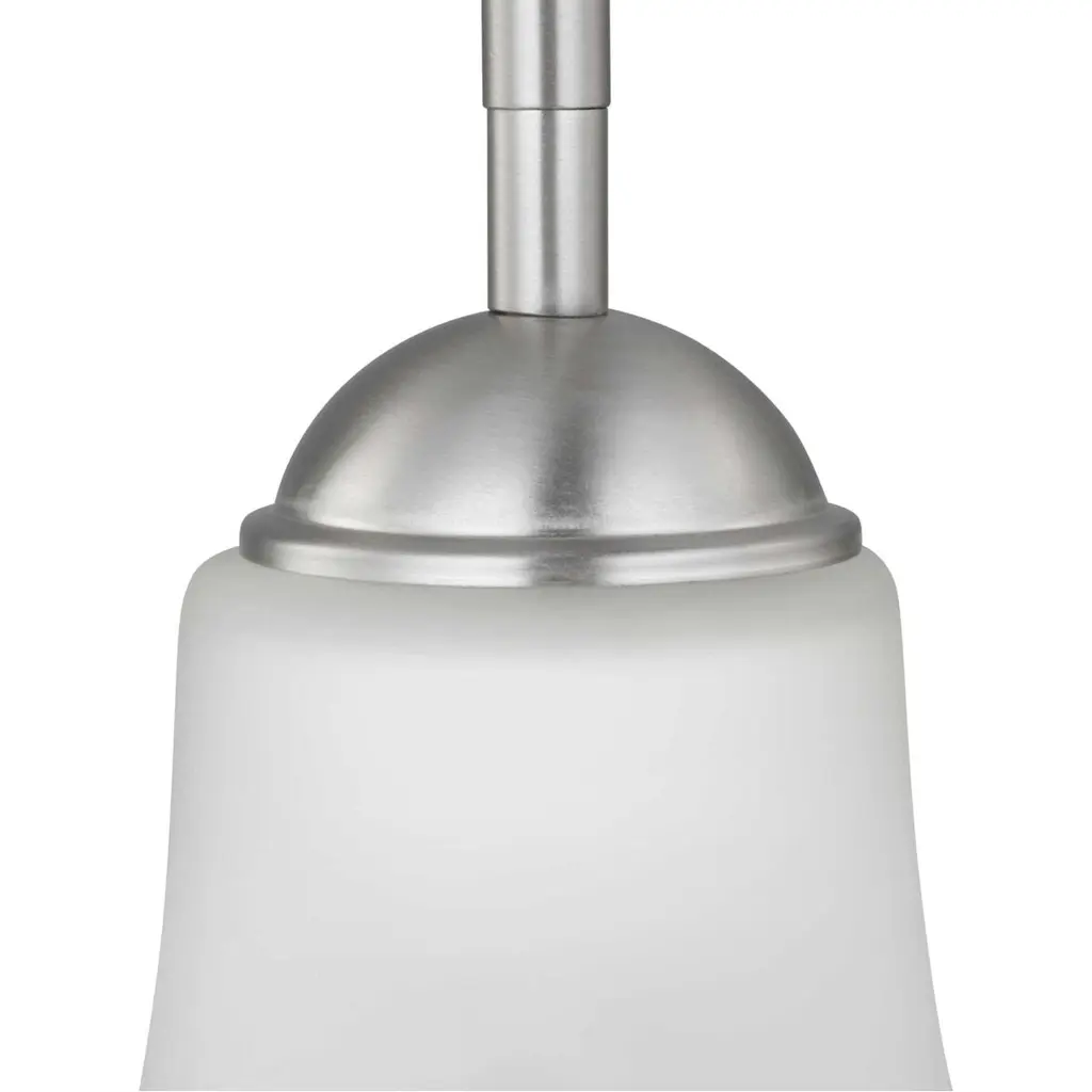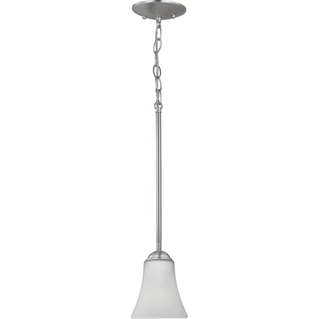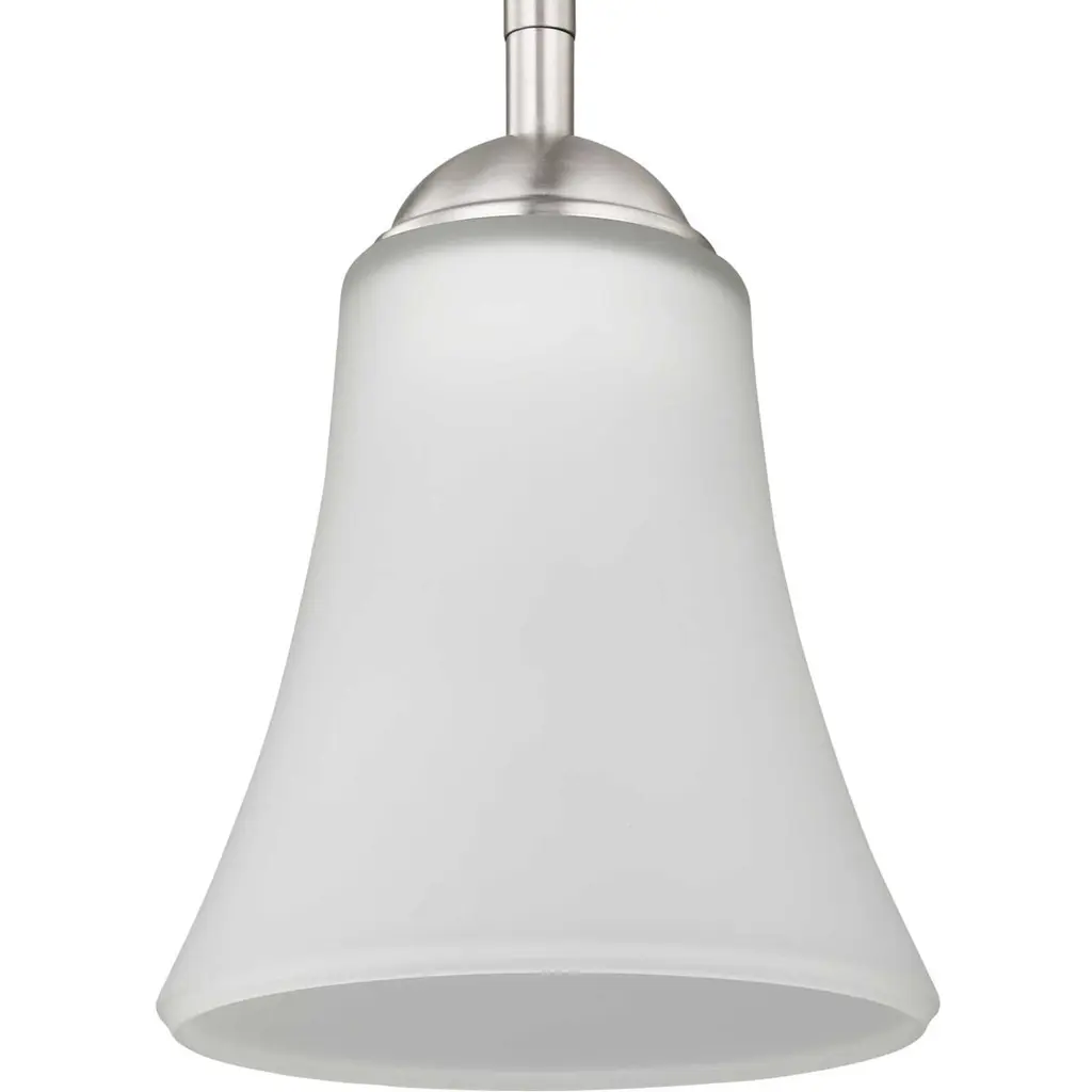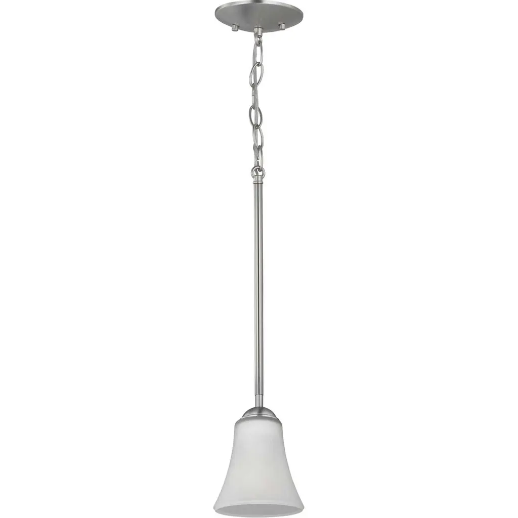 You'll absolutely love the angelic demeanor of this mini-pendant. An otherworldly etched glass bell-shaped shade is the focus of this lighting design. The shade hangs from a beautiful brushed nickel light base that is held in place by a delicate stem.