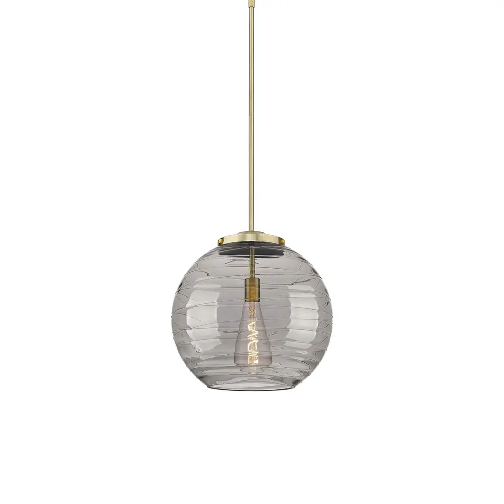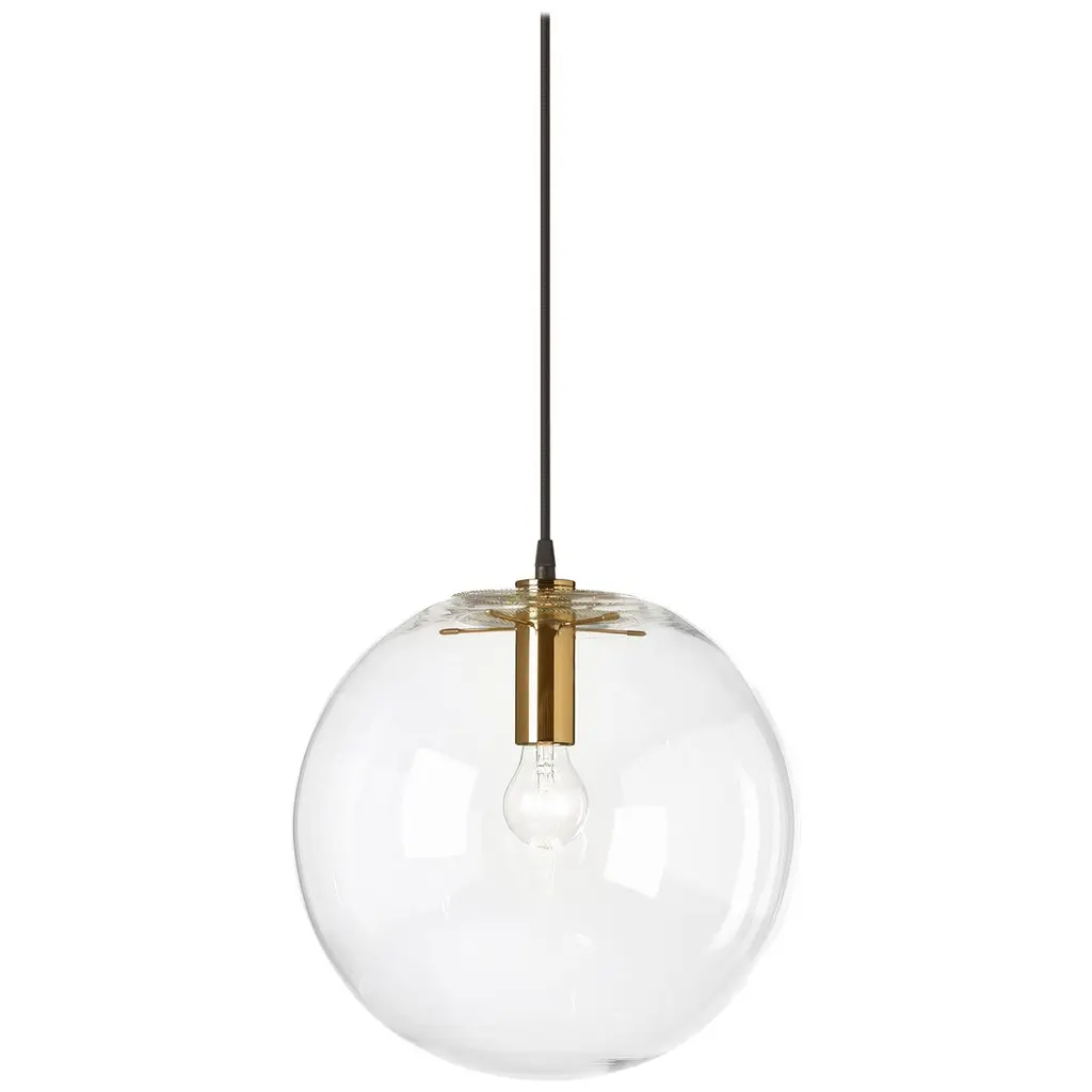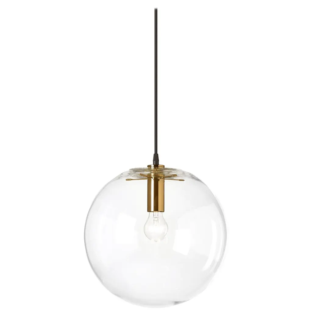 Hand blown clear crystal glass sphere. Centrally suspended by a five-armed light head. Insect protection cover and light head in metal, brass-plated. Black fabric covered wire.UL version 110 V:Max. 60 W / 110 VSocket E 26Dimensions: W 35 cm, H 435 (Cable length 400 cm).