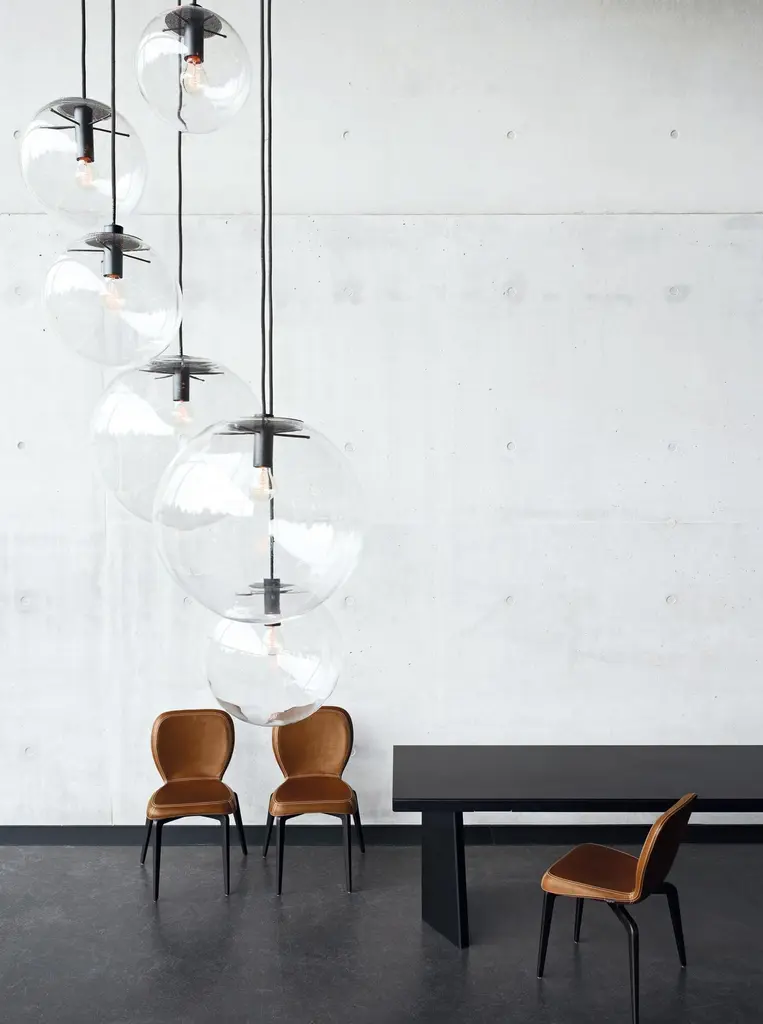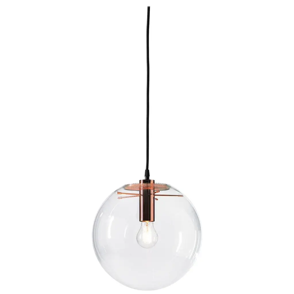 Hand blown clear crystal glass sphere. Centrally suspended by a five-armed light head. Insect protection cover and light head in metal, copper-plated. Black fabric covered wire.UL version 110 V:Max. 60 W / 110 VSocket E 26Dimensions: W 35 cm, H 435 (Cable length 400 cm).