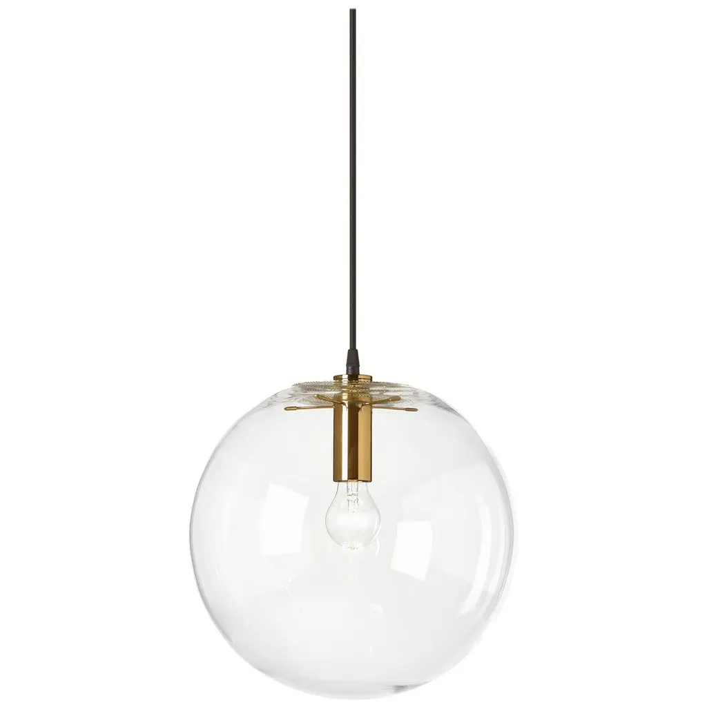 Hand blown clear crystal glass sphere. Centrally suspended by a five-armed light head. Insect protection cover and light head in metal, copper-plated. Black fabric covered wire.UL version 110 V:Max. 60 W / 110 VSocket E 26Dimensions: W 45 cm, H 445 (Cable length 400 cm).