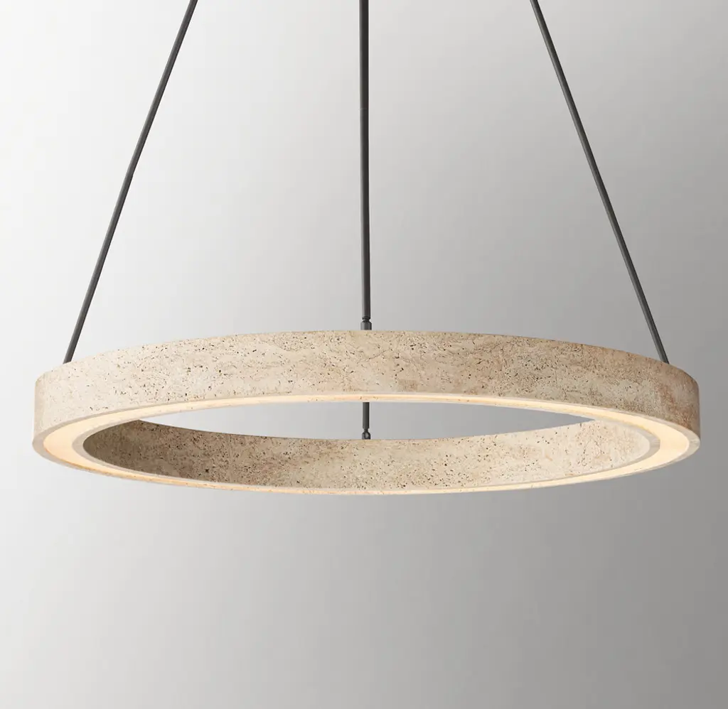 Carved Italian travertine makes the rounds in our beautifully restrained pendant. A steel frame suspends a circular shade with integrated LED that glows from within, casting diffuse light. The distinctive veining and organic texture inherent in the stone make each light unique.