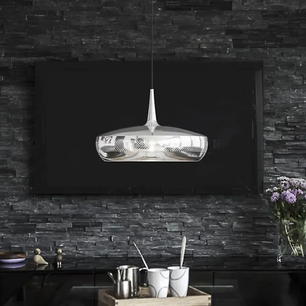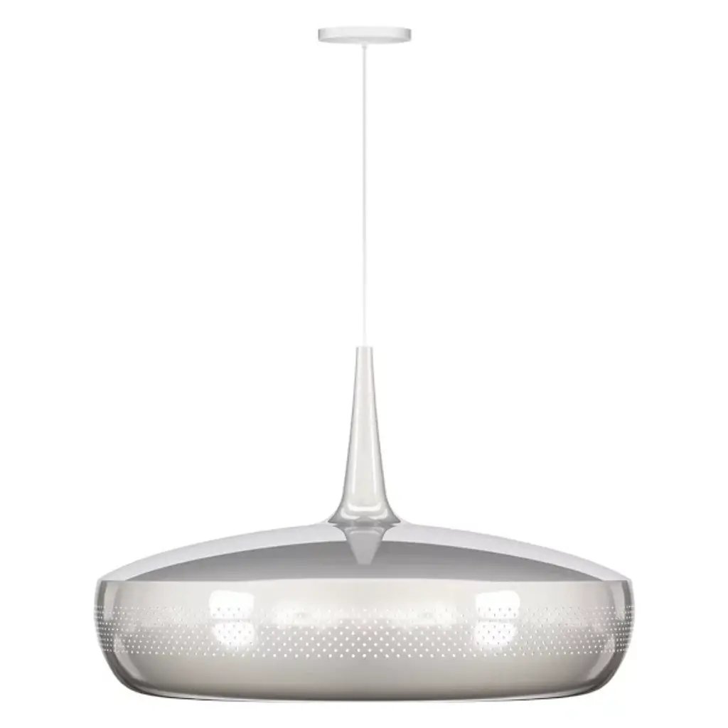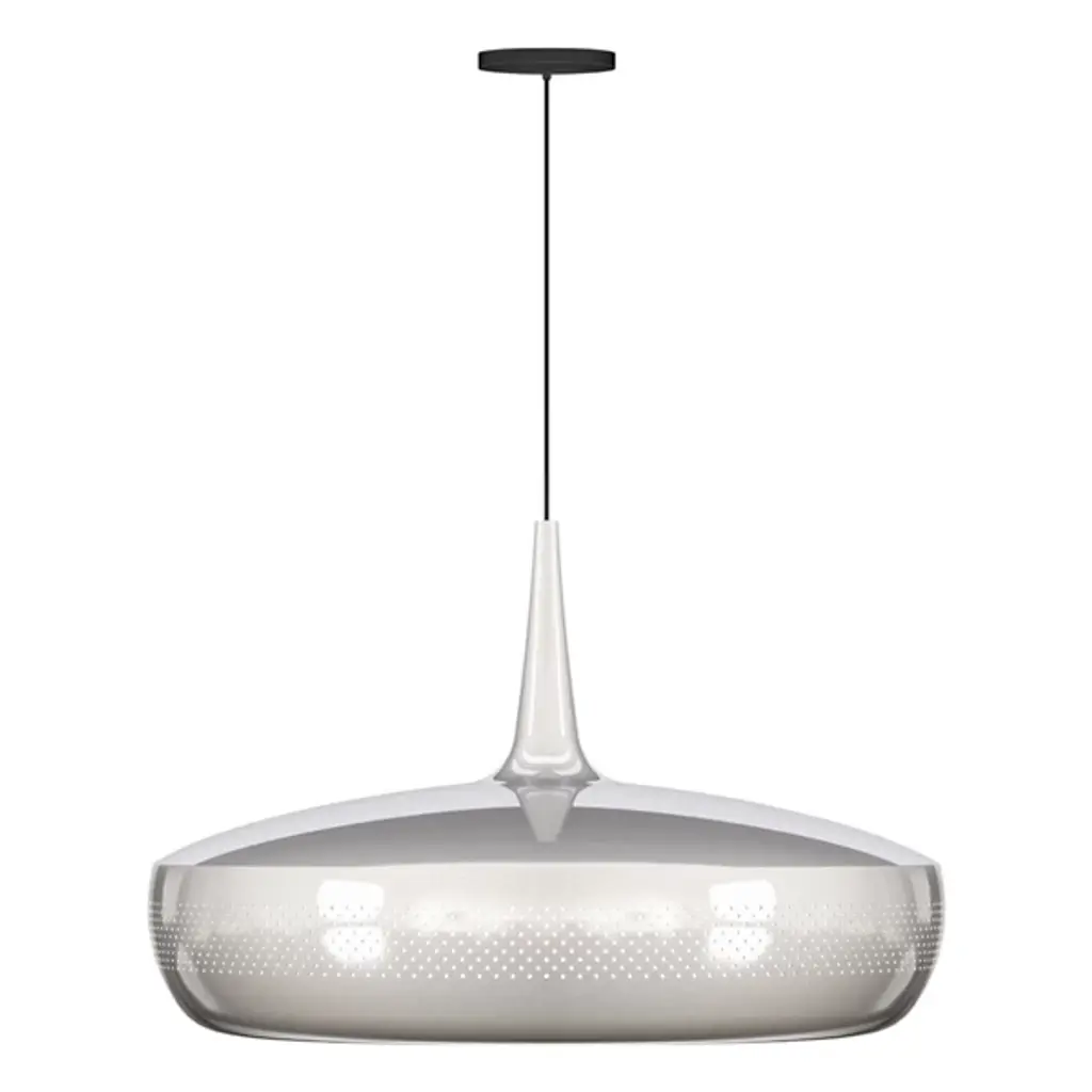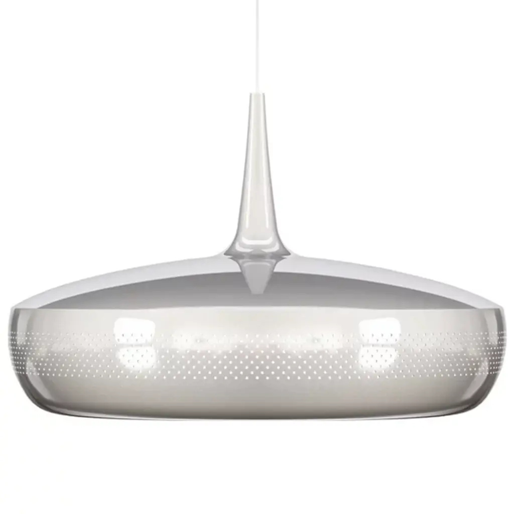 Tasteful details separate the UMAGE Clava Dine Pendant from other aluminum shades, featuring a stippled grille pattern that allows a halo of light to surround the fixture. Designed to broaden the application of the mini pendant version, the name refers to installing the pendant in dining rooms or kitchens, where the larger diameter serves to accommodate the lighting needs of these specific spaces.