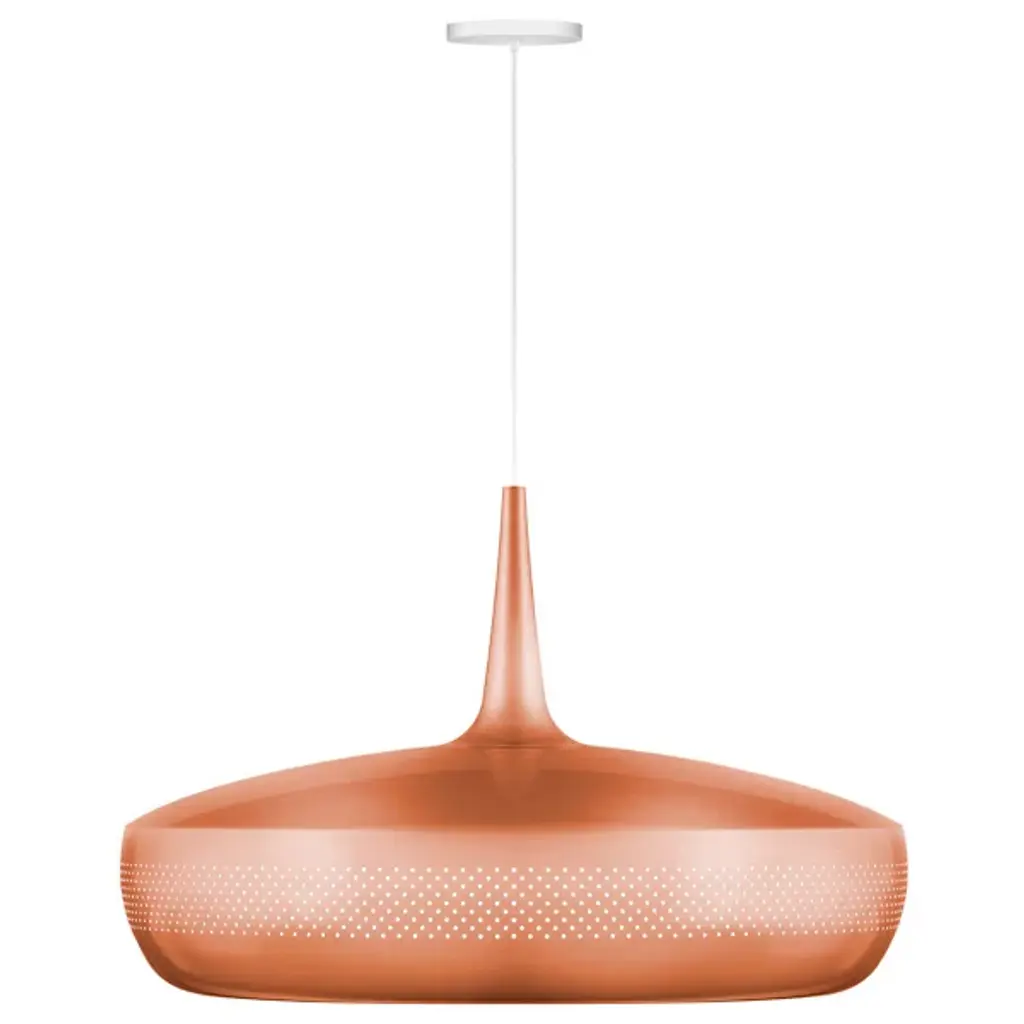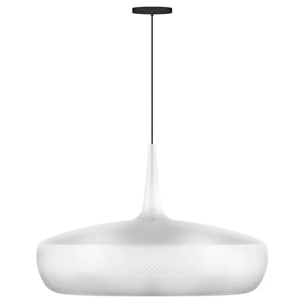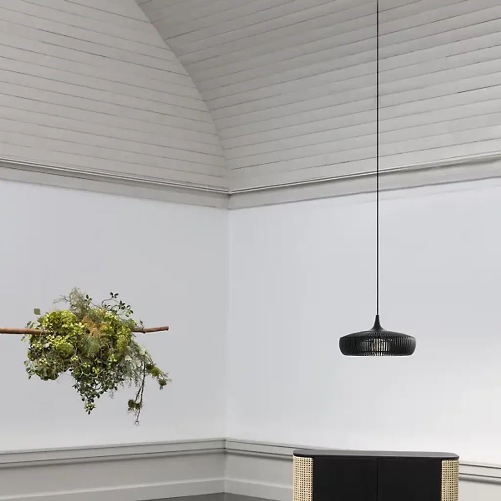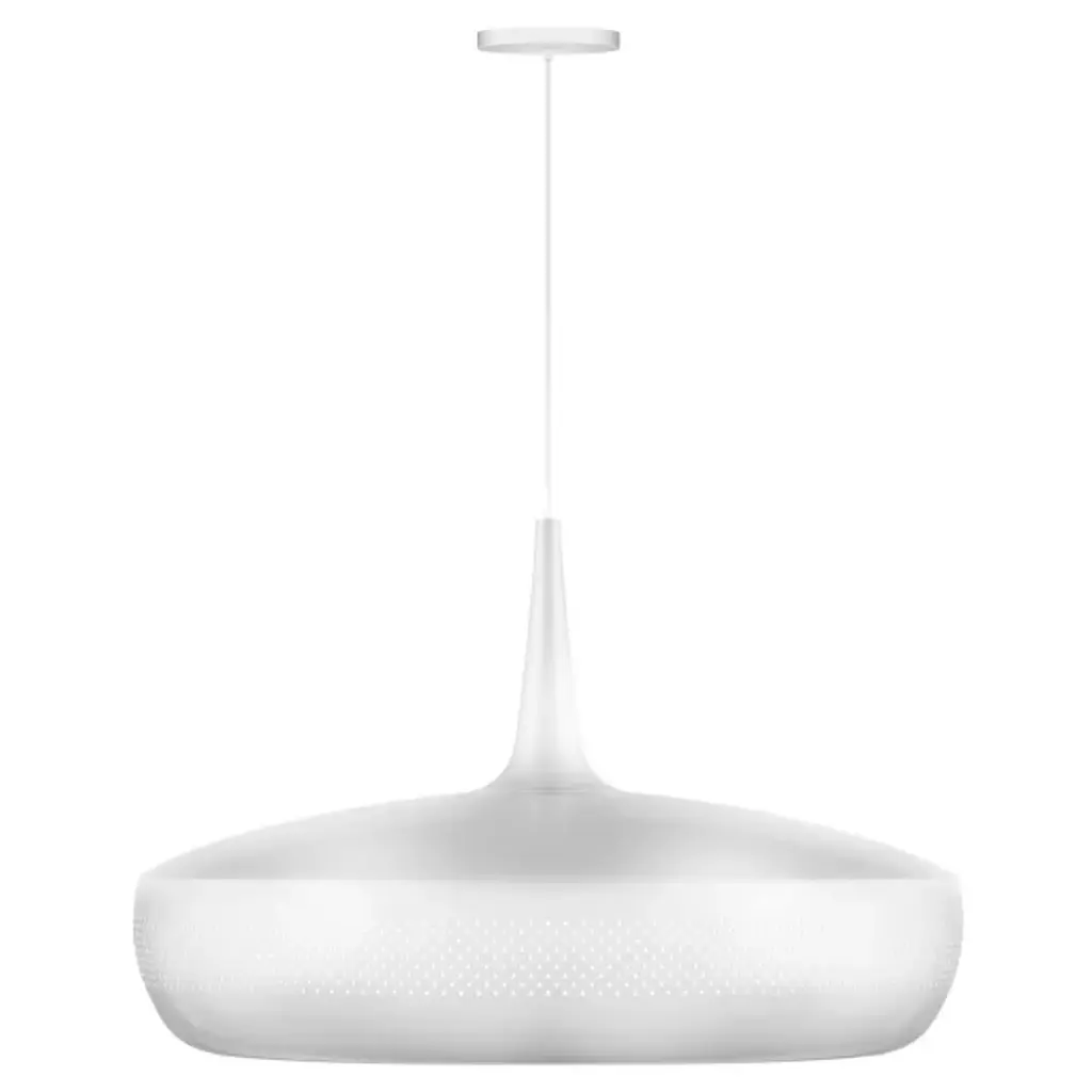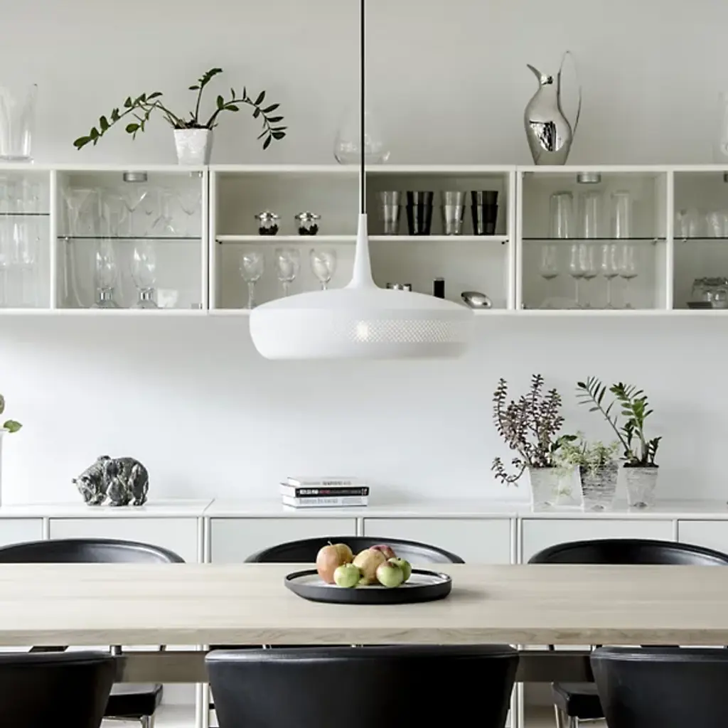 Tasteful details separate the UMAGE Clava Dine Pendant from other aluminum shades, featuring a stippled grille pattern that allows a halo of light to surround the fixture. Designed to broaden the application of the mini pendant version, the name refers to installing the pendant in dining rooms or kitchens, where the larger diameter serves to accommodate the lighting needs of these specific spaces.