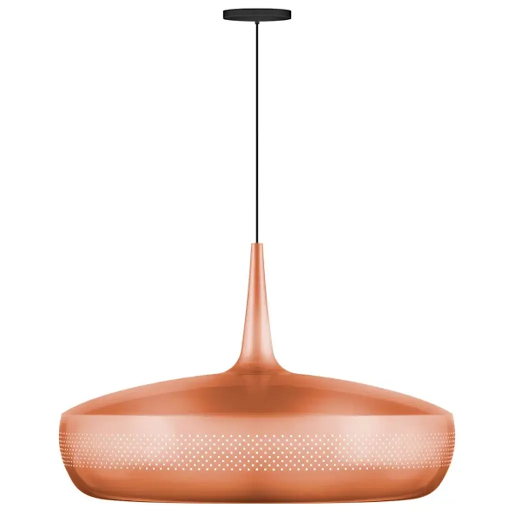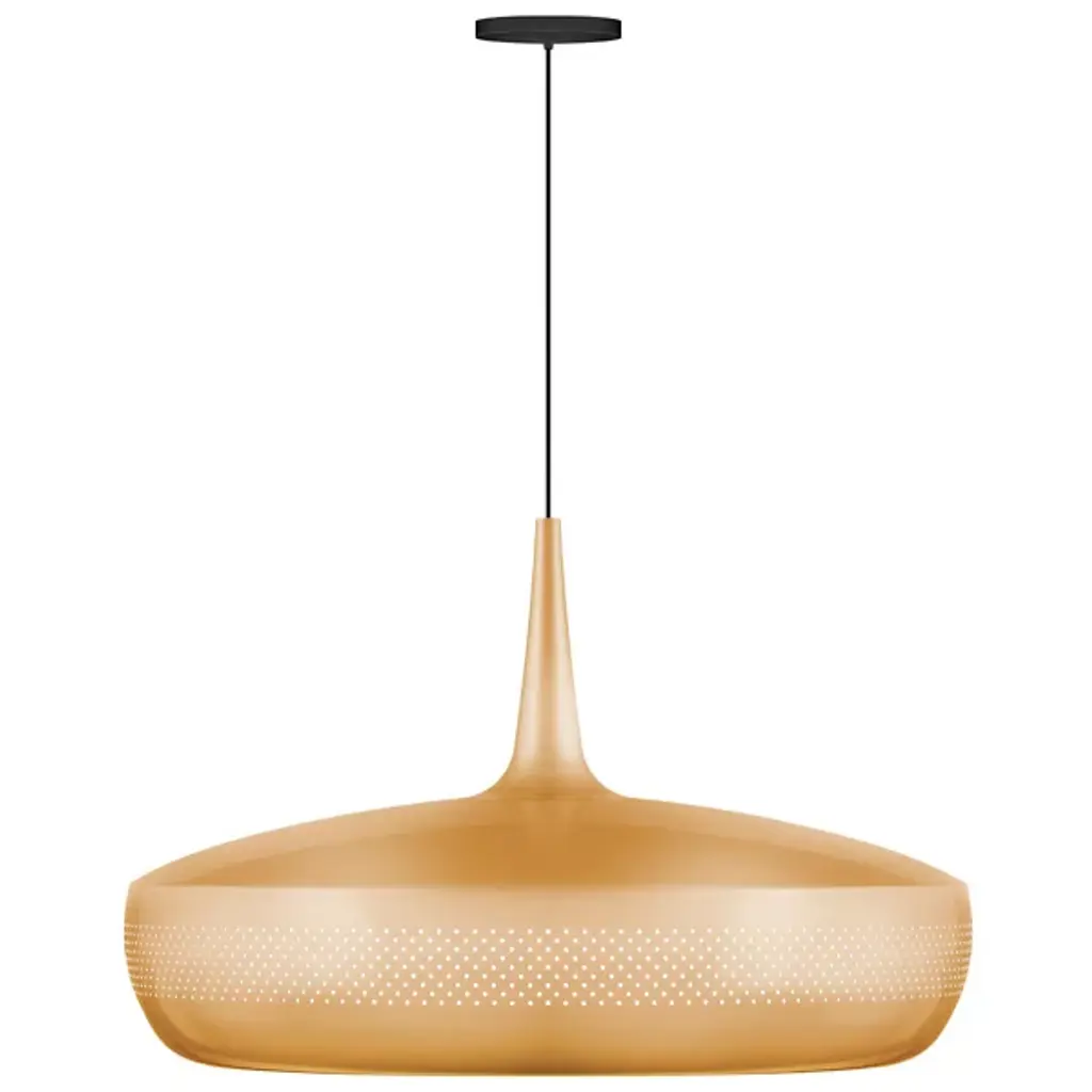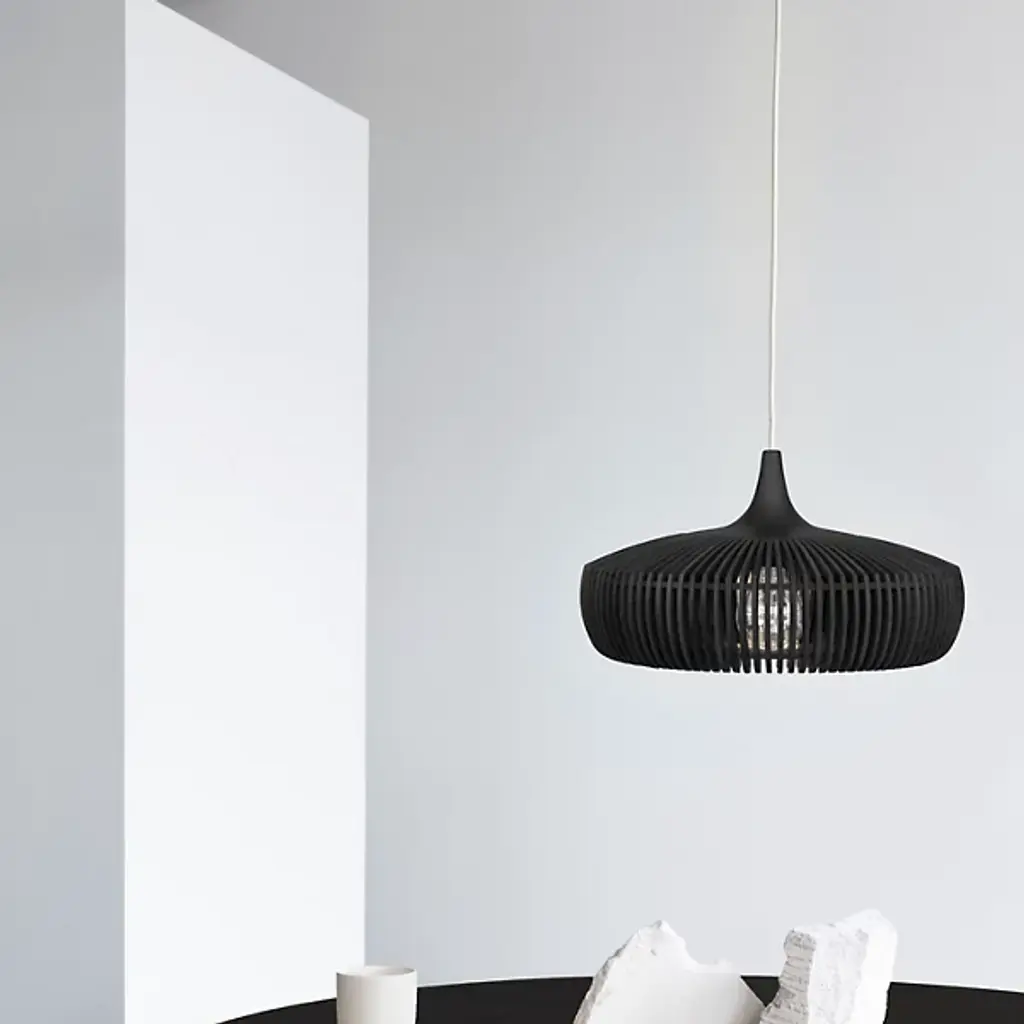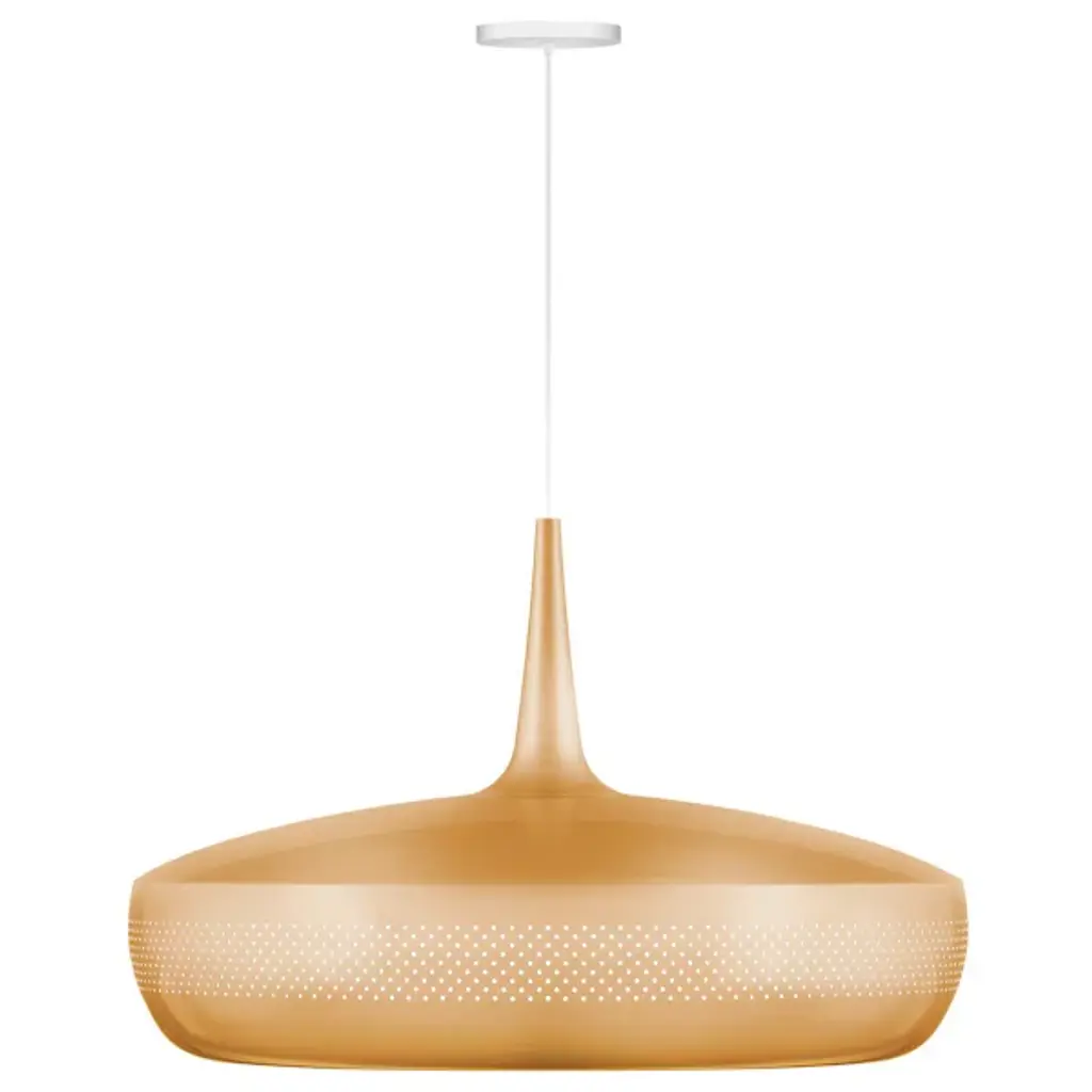 Tasteful details separate the UMAGE Clava Dine Pendant from other aluminum shades, featuring a stippled grille pattern that allows a halo of light to surround the fixture. Designed to broaden the application of the mini pendant version, the name refers to installing the pendant in dining rooms or kitchens, where the larger diameter serves to accommodate the lighting needs of these specific spaces.