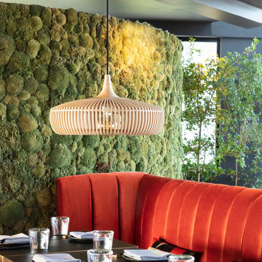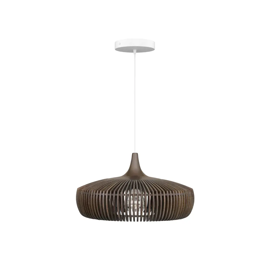 Designed with laser-cut wooden lamellae in ash and oak veneer, the Clava Dine Wood Pendant features a solid oak top, creating a unique and intricate pattern. The minimal distance between each lamella ensures a precise and elegant design, casting beautiful rays of light and creating a sculptural focal point. This pendant is available in natural oak, dark oak, and black oak.