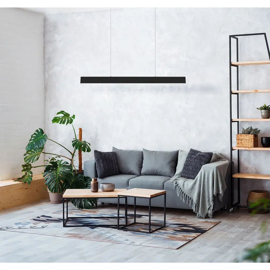 The Eglo Climene LED Linear light is sleek and sophisticated with its matte black finsh, illuminating the space with a single long rail powered with state of the art LED technology. The rest of the piece is kept simple, hung with cables from a matching rectangular canopy. Contemporary in both style and application, the minimalism aesthetic paired with energy efficiency creates a truly modern lighting option