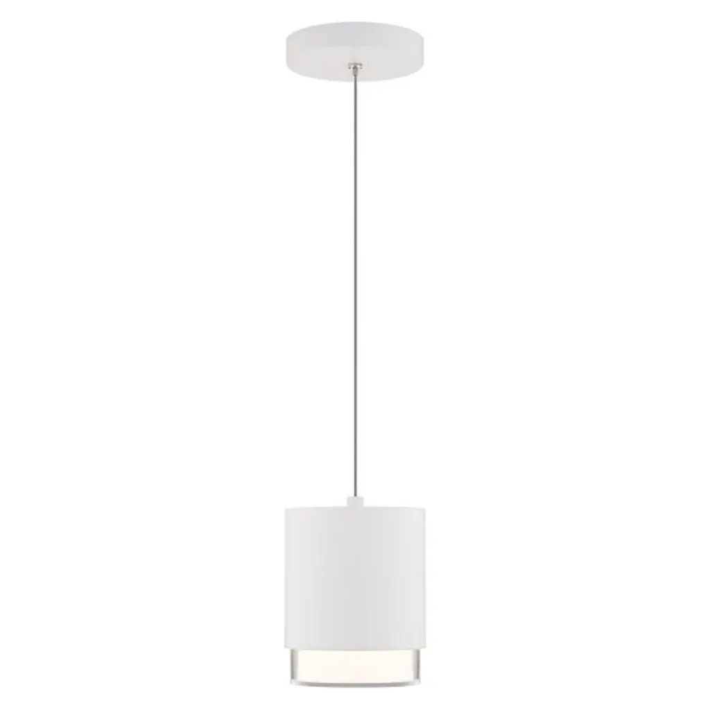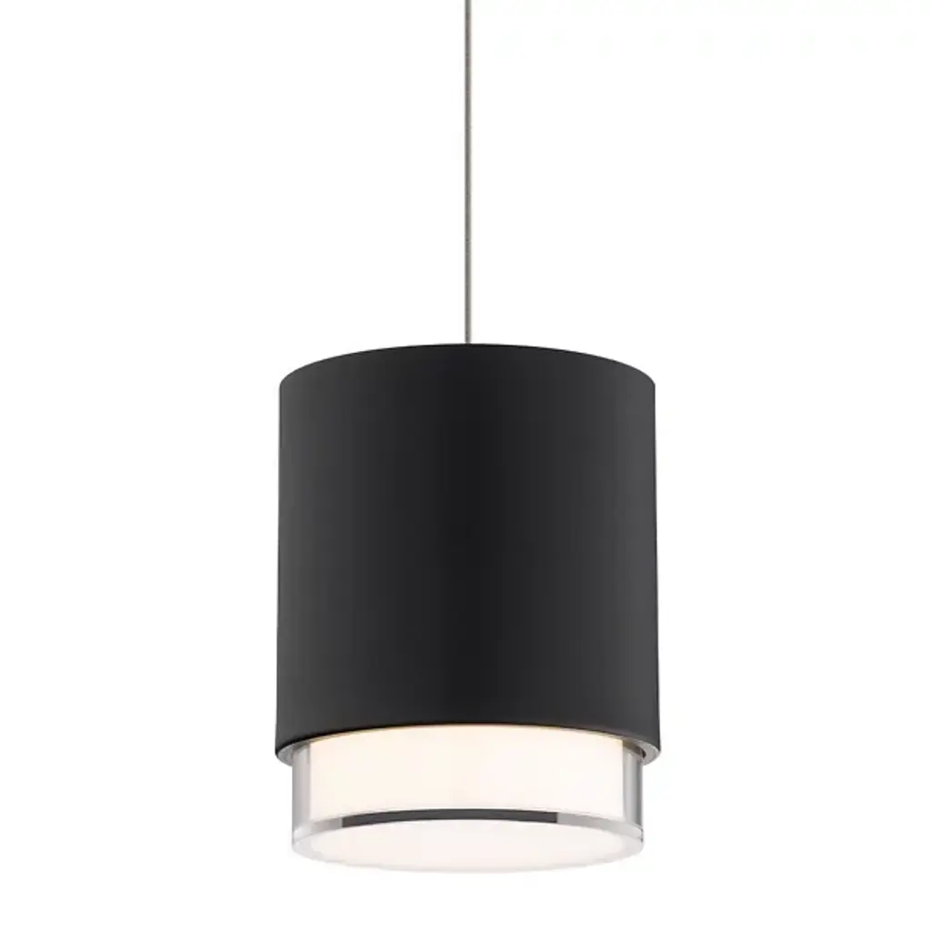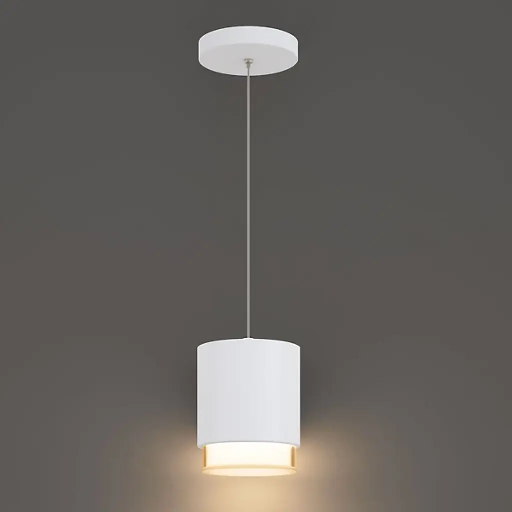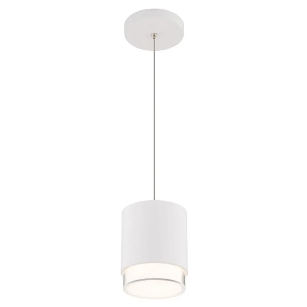 The Cloak LED Mini Pendant from dweLED uses a double-cylinder composition where an opaque aluminum outer shell wraps around an inner acrylic core. The outer layer extends past the inner shade, creating a directional quality that channels light strictly downward. This layered construction gives the fixture a sculptural depth despite its compact scale. The nested cylinders appear as distinct yet connected forms, with the aluminum exterior serving as both a structural element and a visual filter that shapes how illumination escapes from the translucent core beneath.
