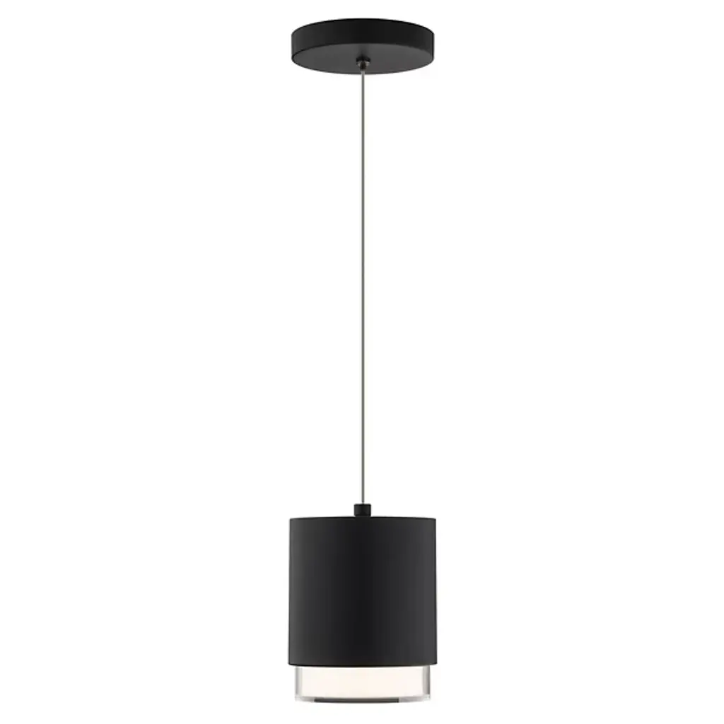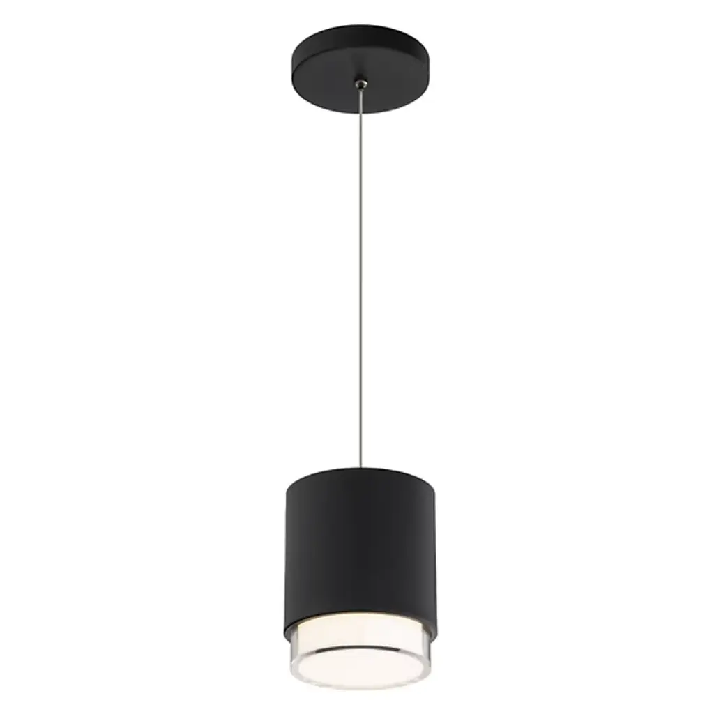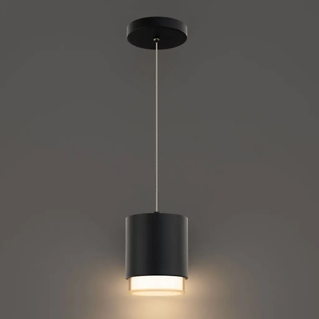 The Cloak LED Mini Pendant from dweLED uses a double-cylinder composition where an opaque aluminum outer shell wraps around an inner acrylic core. The outer layer extends past the inner shade, creating a directional quality that channels light strictly downward. This layered construction gives the fixture a sculptural depth despite its compact scale. The nested cylinders appear as distinct yet connected forms, with the aluminum exterior serving as both a structural element and a visual filter that shapes how illumination escapes from the translucent core beneath.
