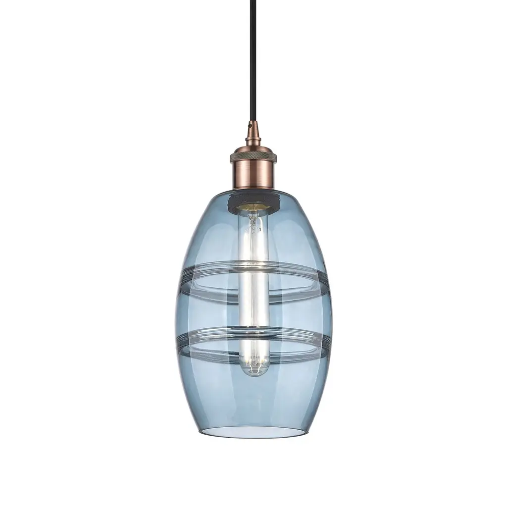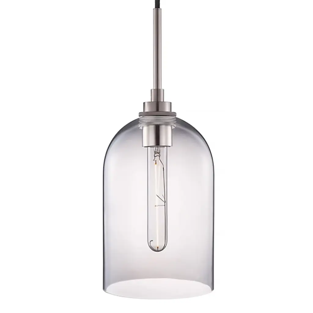 The Cloche Pendant from Niche enhances open spaces with a subtle blend of memorable retro design paired with an airy, open suspension. Reaching down from a low-profile canopy along a single slender cord, it places a simple single socket below, its smooth metal accented by knurled collar elements for a touch of industrial strength. The downward-facing lamping is escorted by a tall dome shade of handblown glass that sweeps down around it, exchanging bright glare for a pleasing ambiance to the sides while casting a single spot of strong, focused downlight ideal for task use through the open base of the shade.