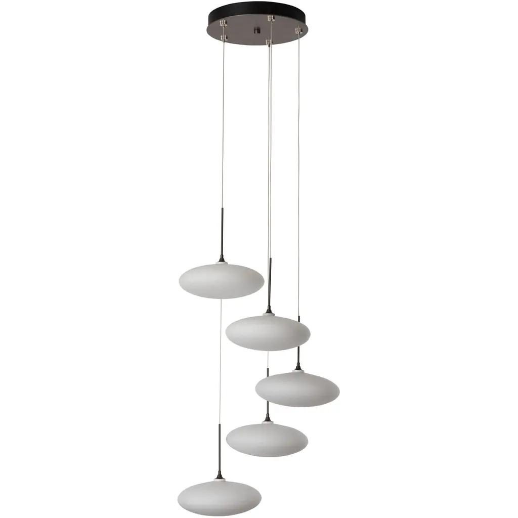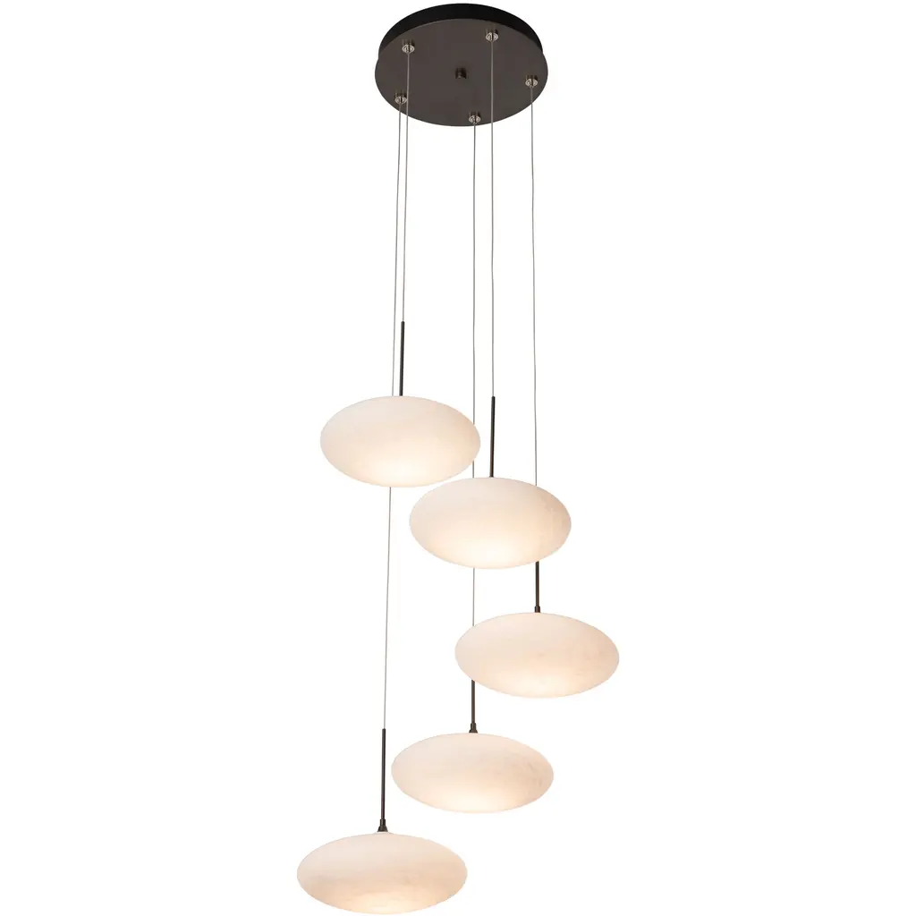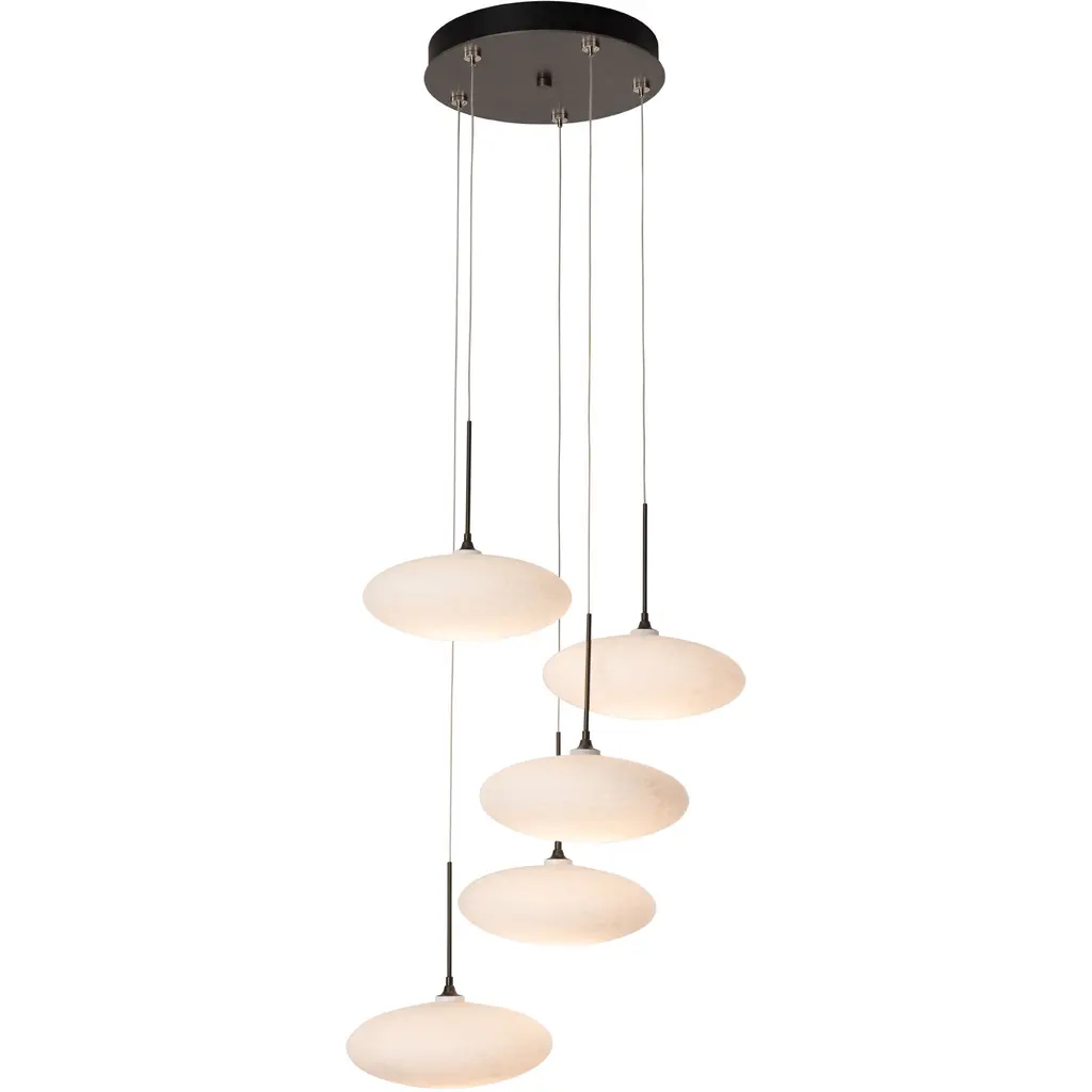 Large white tortoiseshell-like glass "puffs" inspired this collections name, Clouds. The ability to customize the lengths of each cable makes it possible for this versatile Clouds 5-Light fixture to serve as a semi-flush with shortened cables, or as a pendant with staggered individual lights, descending from a round canopy.
