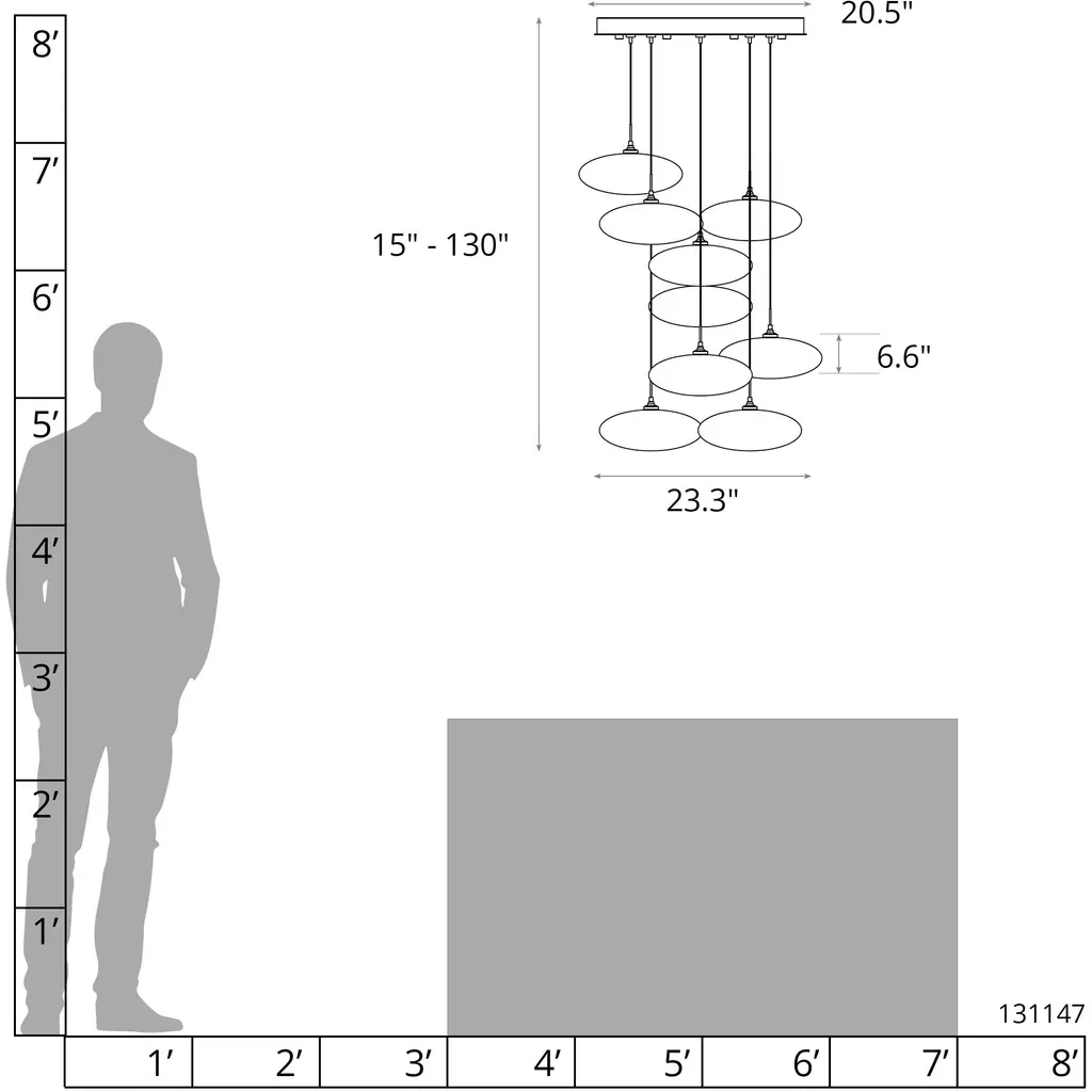 The Clouds 9-Light Pendant features a round canopy from which nine unique white tortoiseshell-like glass shades are in staggered suspension. A focal piece for any space, a billow of puffy Clouds appears to cascade downward from the canopy. Cable lengths are customizable to create the Clouds installation to suit the spatial design.