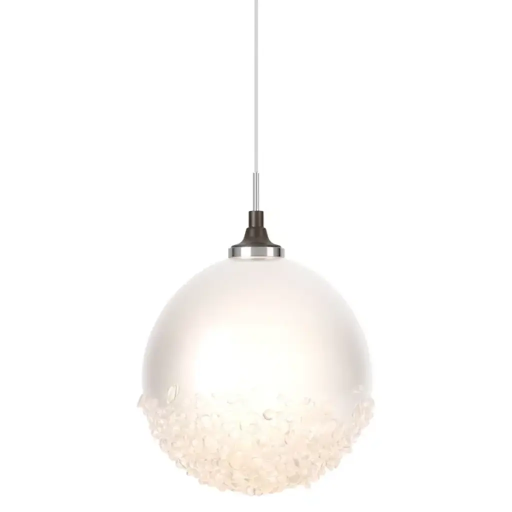 The globe-shaped Coco is a blown glass with a neutral décor and classic shape that blends gracefully into all environments. Our Carrera glass is a classic yet modern décor that gives off a soft white light. Clear molten glass is rolled in alabaster powder like frit, and then blown into shape with a semi-clear frosted white inner finish. This décor is created by rolling molten glass in small bits of white called frit. The smooth satin finish on the clear outer layer is a result of an extensive etching process. This blown glass is handcrafted by a skilled artisan, utilizing century-old techniques passed down from generation to generation. Each piece of this décor has its own artistic nature that can be individually appreciated. The cord pendant fixture is equipped with a 10' SVT cordset and an low profile flat monopoint canopy. These stylish and functional luminaries are offered in a beautiful Satin Nickel finish.
