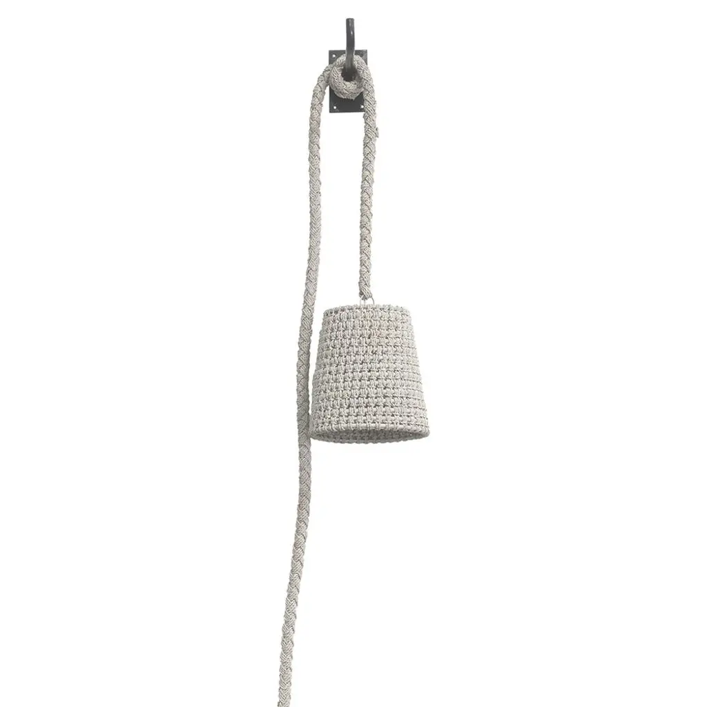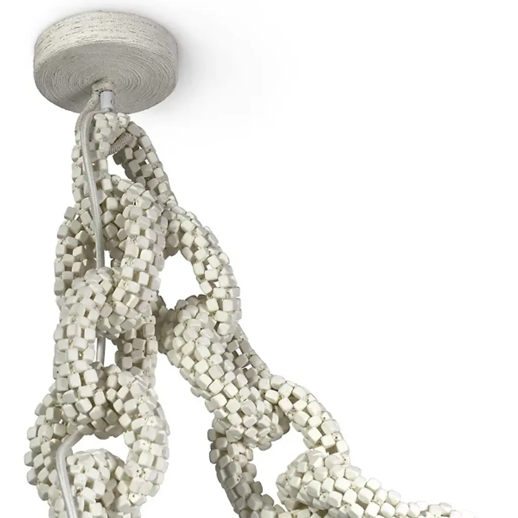 The Coco Chain Link Swag Pendant by Palecek exudes natural elegance with its cream-finished, cube-shaped wood beads hand-sewn into a captivating chain link design. Finely woven white abaca rope accents add texture and sophistication. Designed for versatility, it includes two off-white metal ceiling hooks for customizable hanging and draping. A matching abaca-wrapped canopy completes the refined look, making this pendant a stunning addition to any space with its blend of organic materials and modern design.